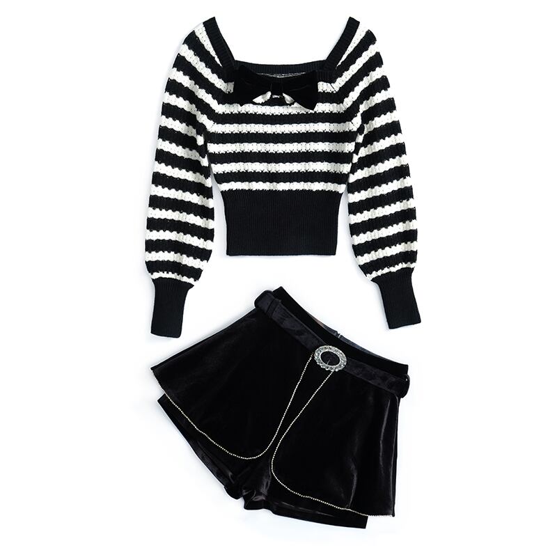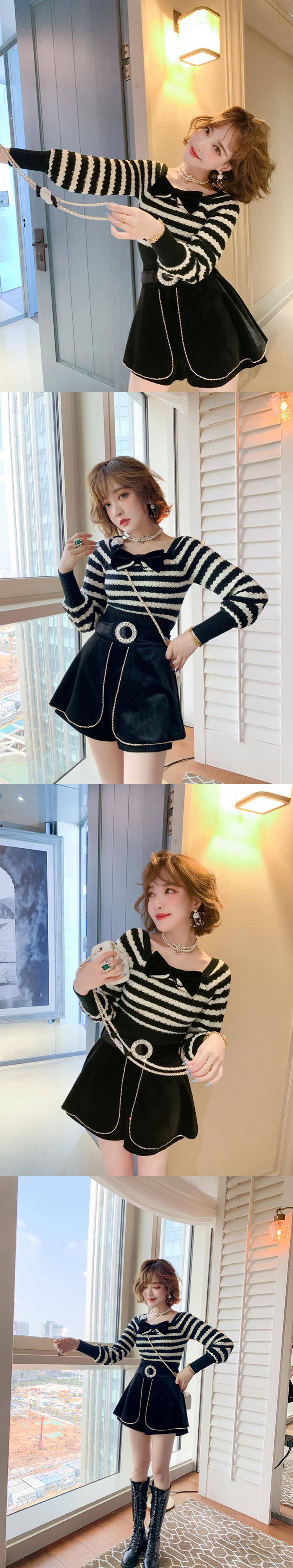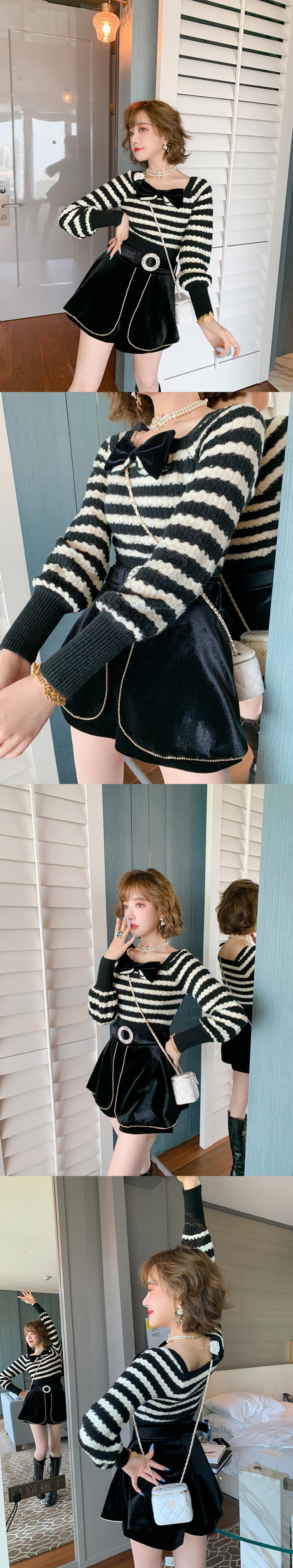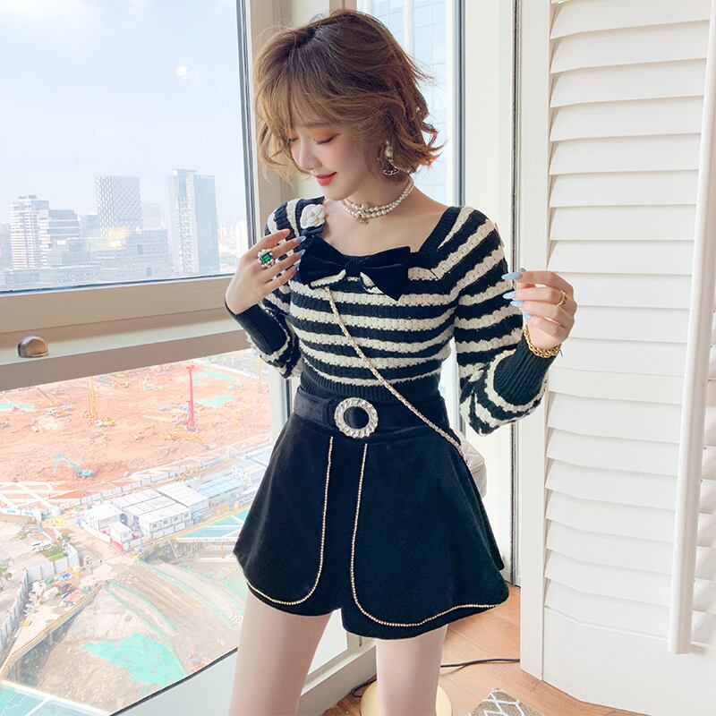 リボンストライプセーター ハイウェストウェストベルベットショーツ オータム 秋物 ブルマー MIUCO95913023081