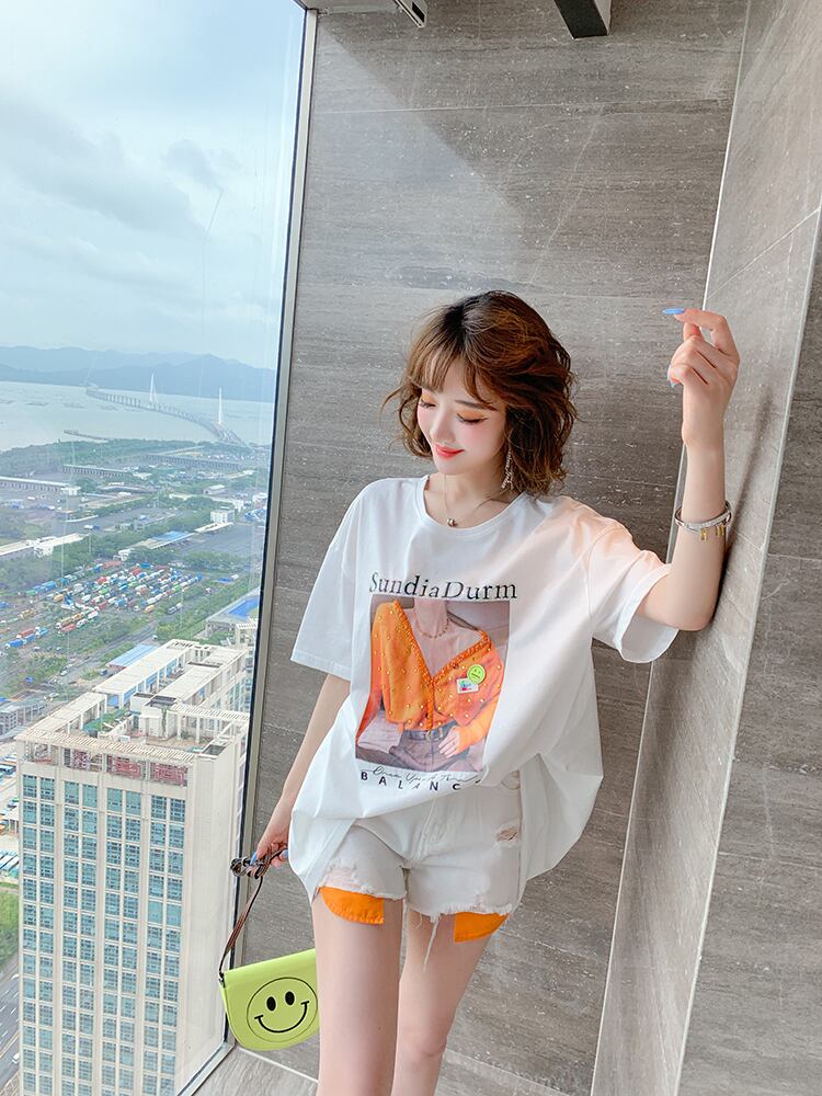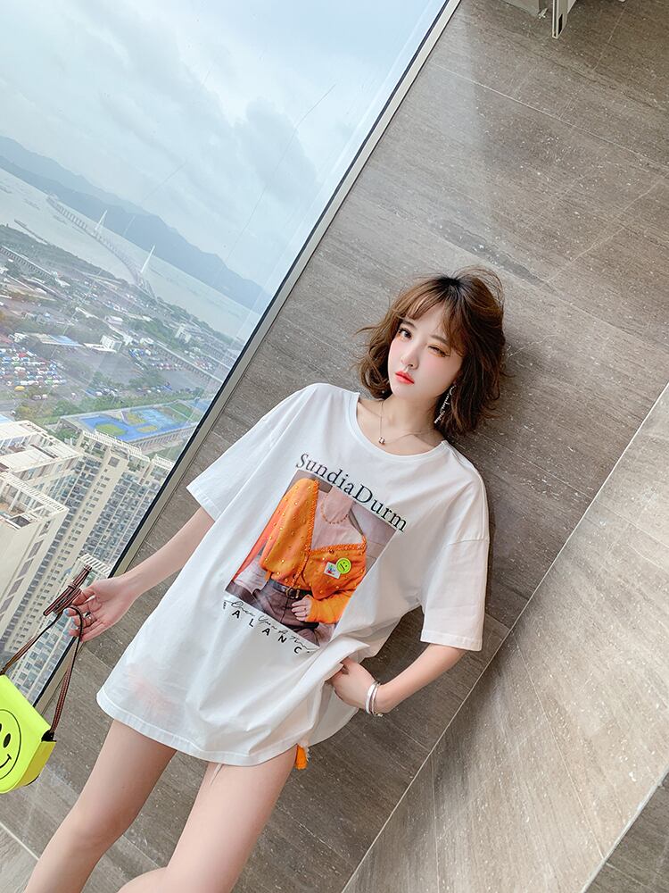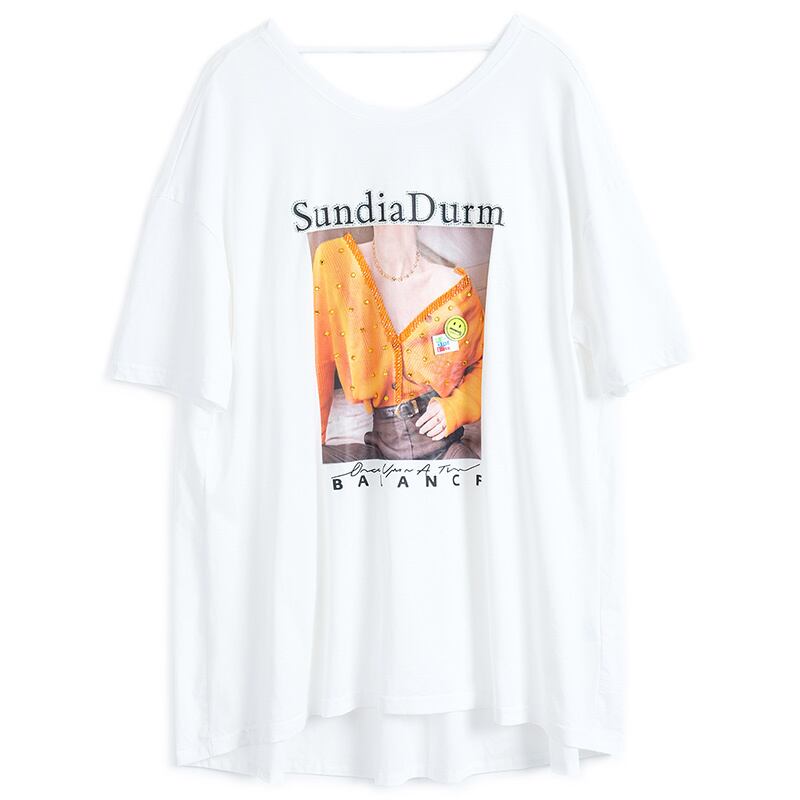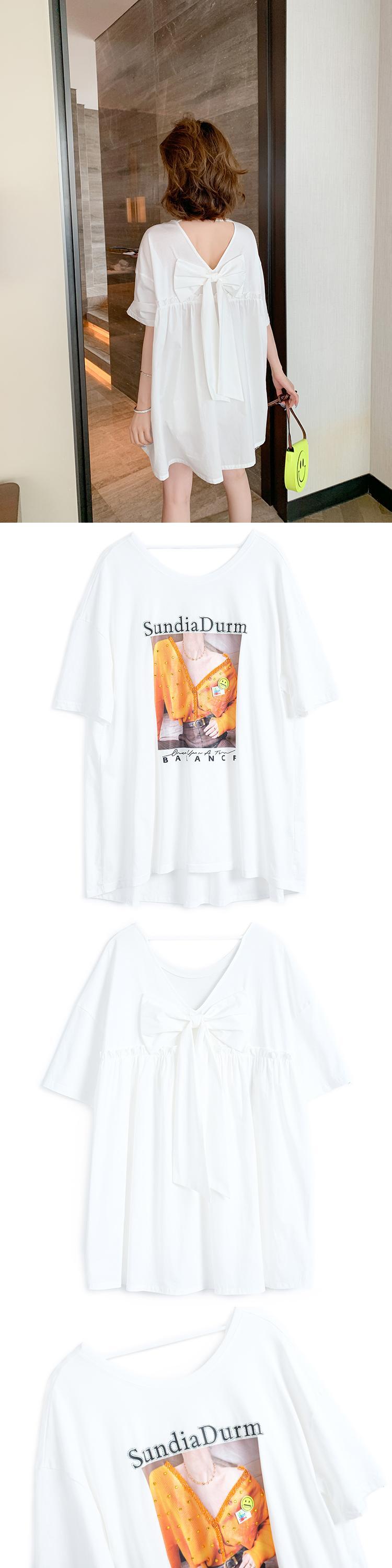 バックVネックリボンプリント柄ルーズ薄手Tシャツ オータムスタイル 秋物 MIUCO19280869116