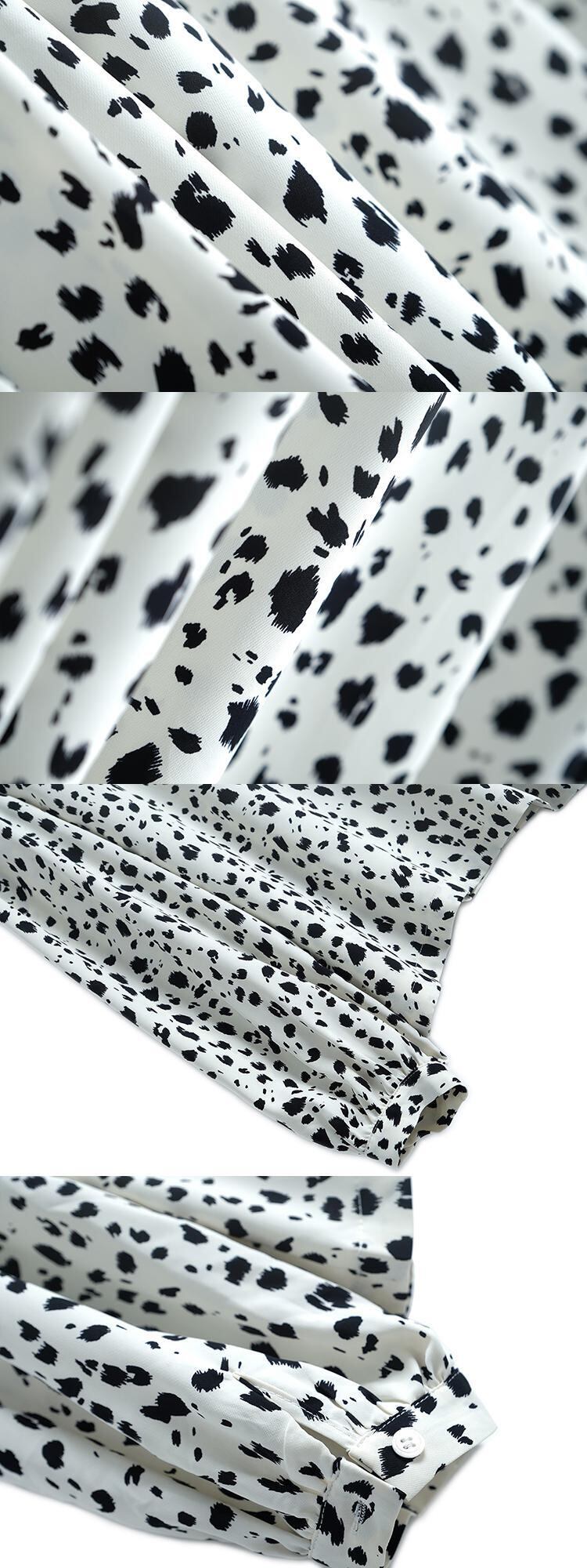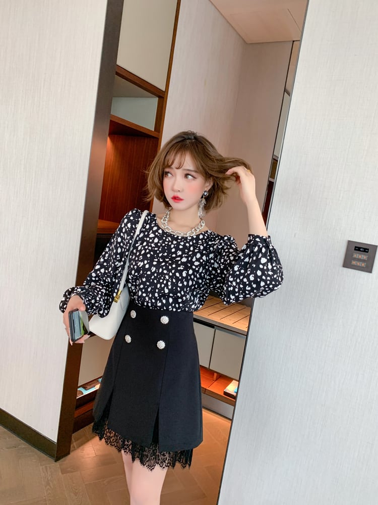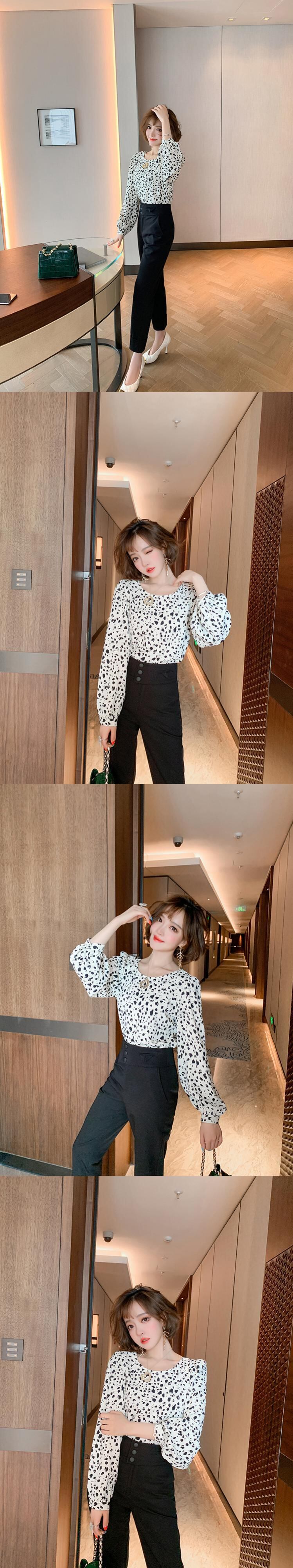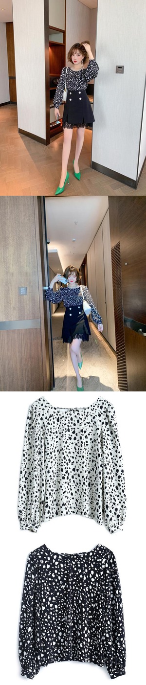 ラウンドネックバックレオパードプリント柄トップス オータム ランタンスリーブ 秋物 Oネック MIUCO64044734005
