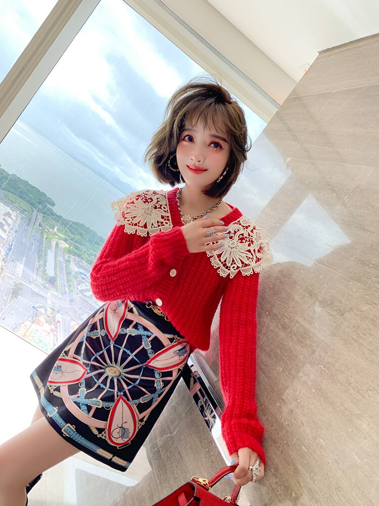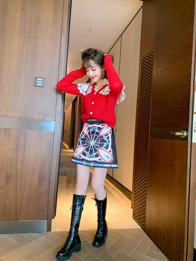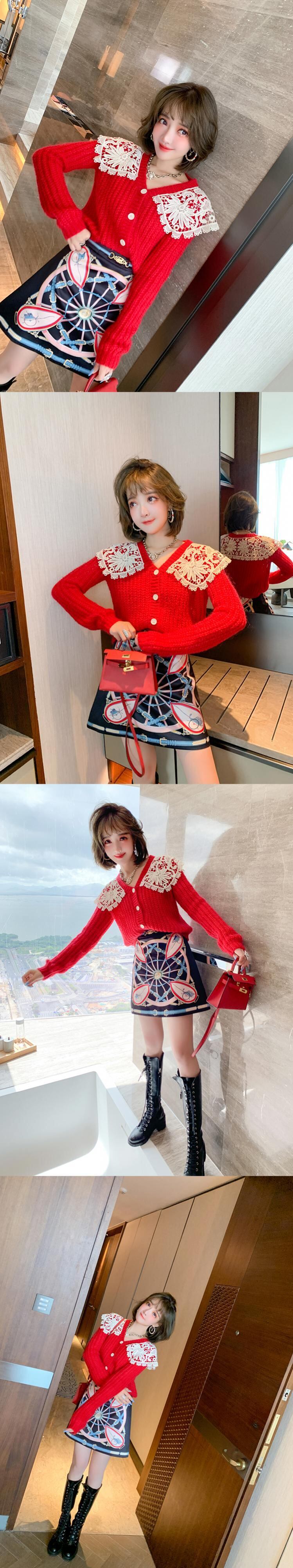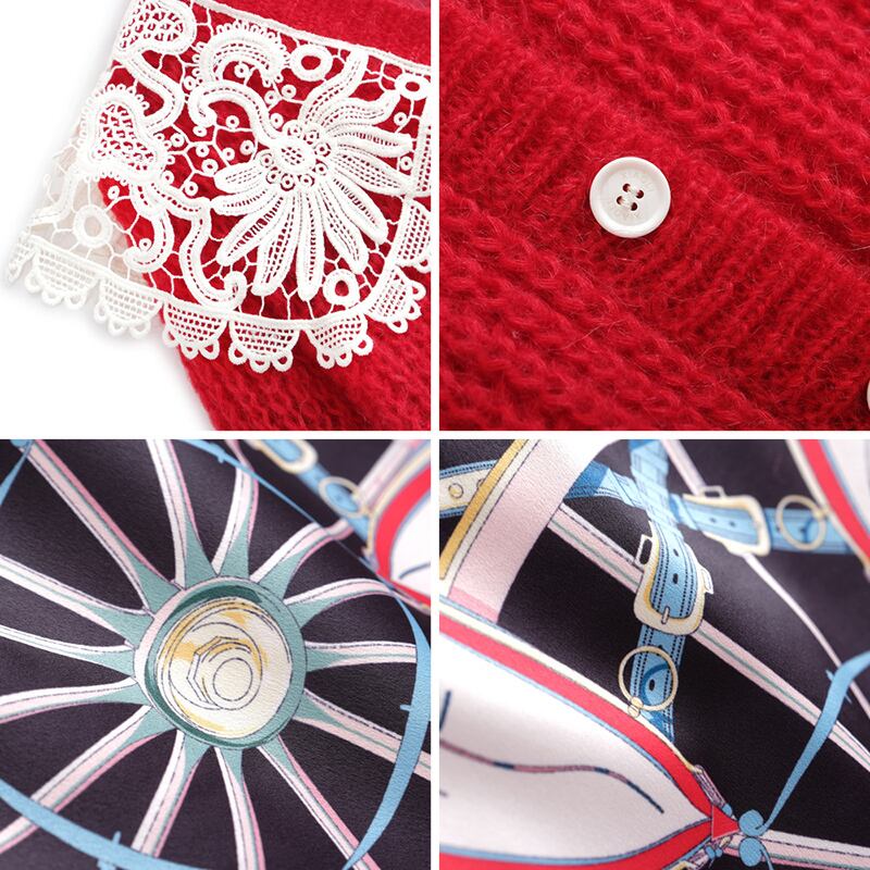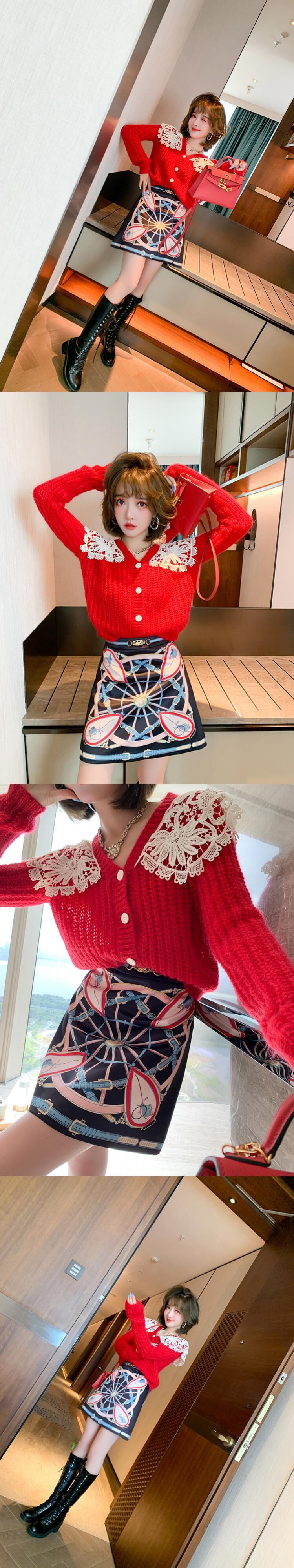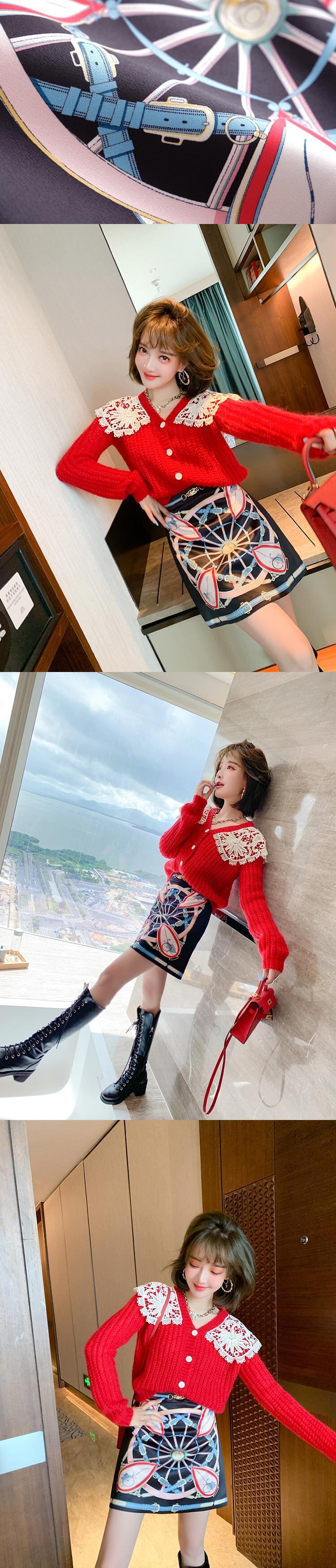 レースニットカーディガンハイウェストウェストプリントスカート オータム 秋物 ステッチ MIUCO24432020849