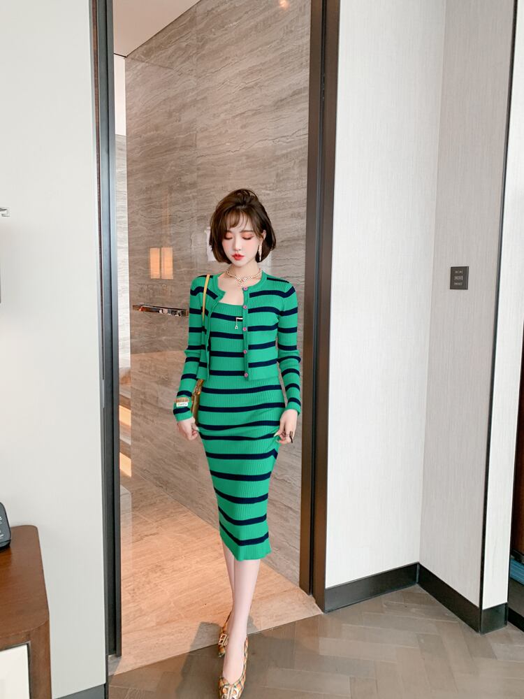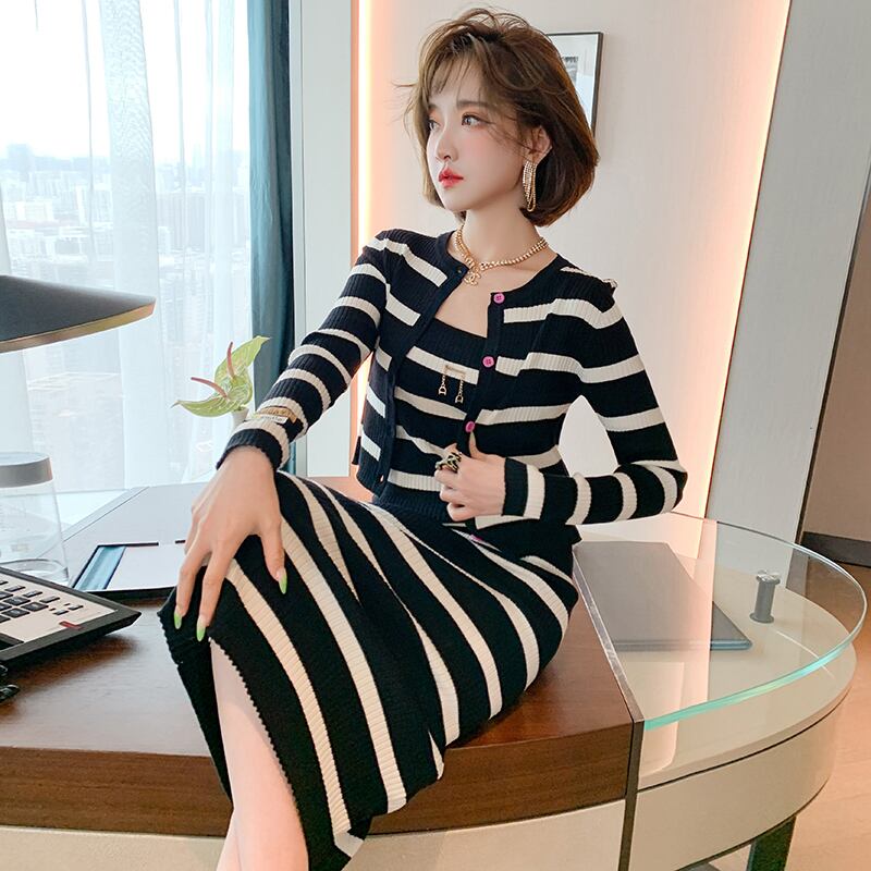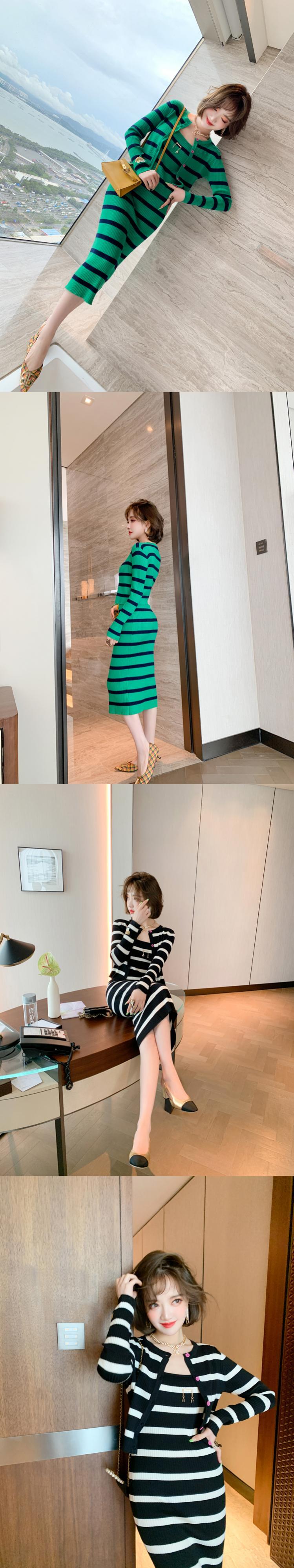 ストライプニットラウンドネックカーディガンスリムドレス オータム 秋物 Oネック MIUCO71194962242