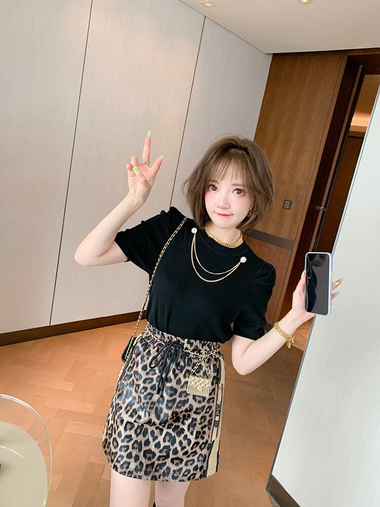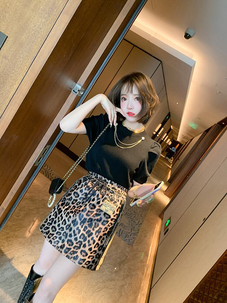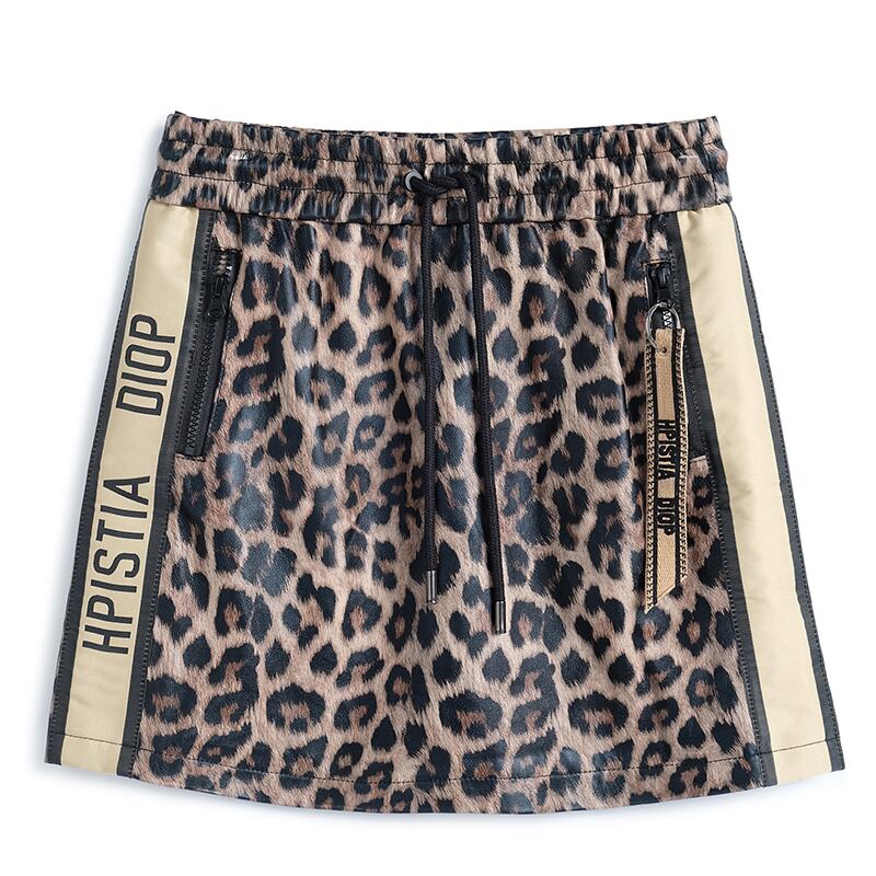 レオパードプリントストレッチギャザーウェストレザースカート エラスティック 伸縮 ステッチ MIUCO17914245690