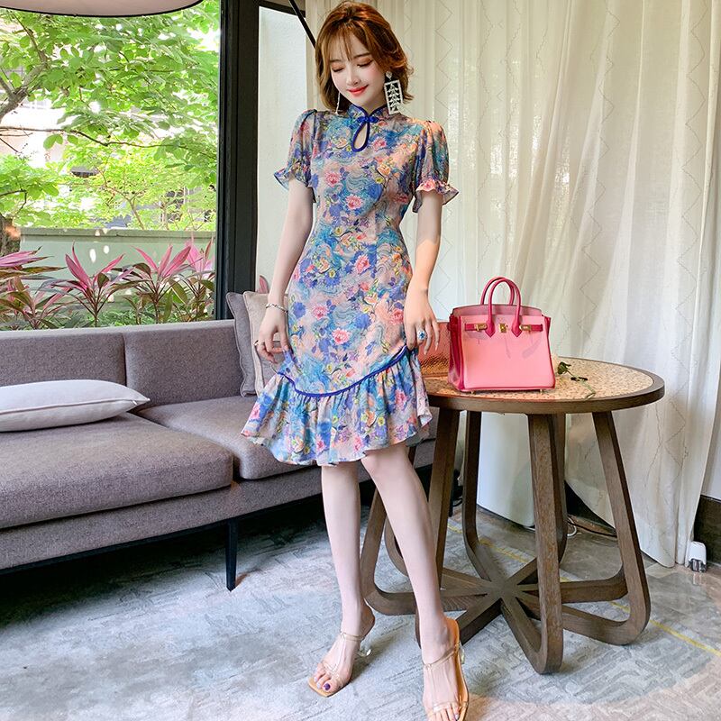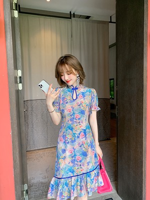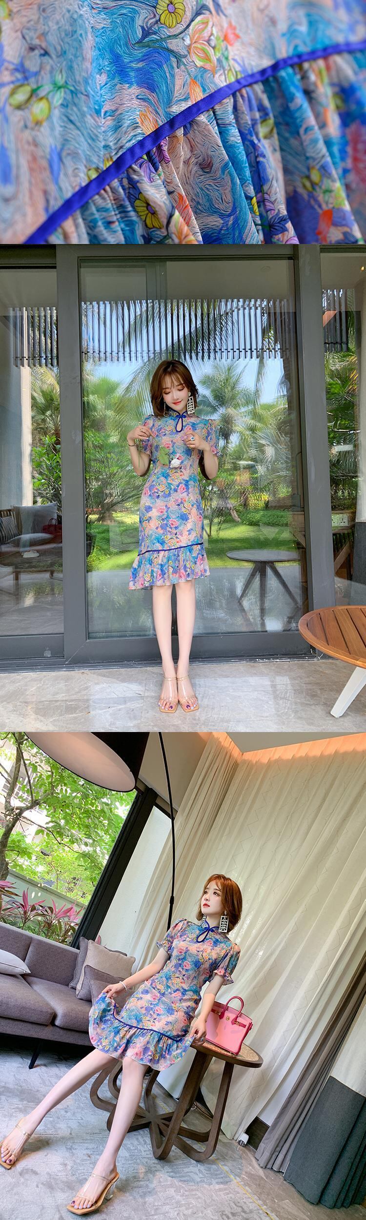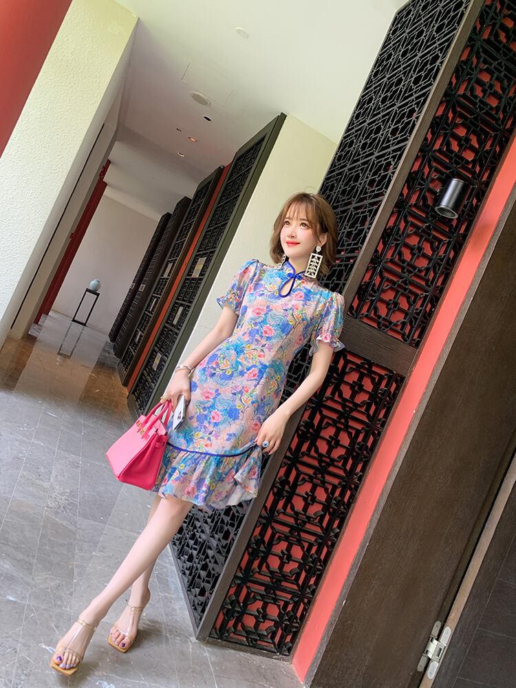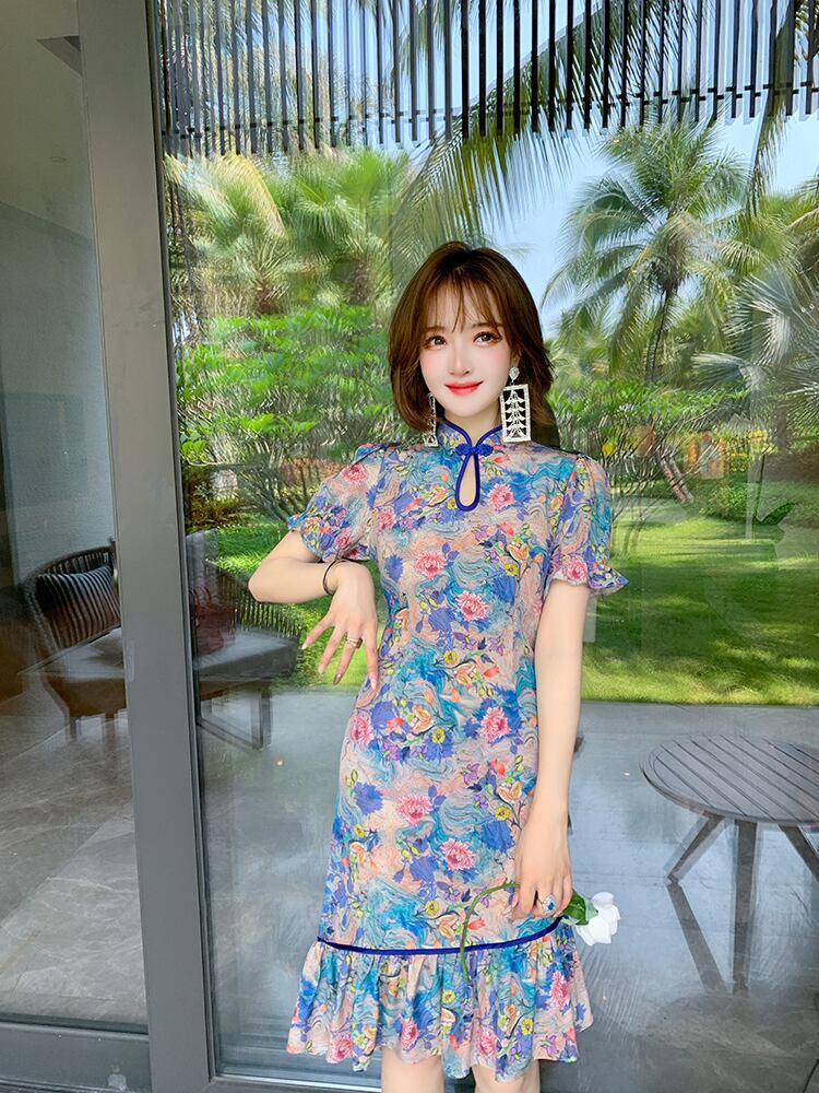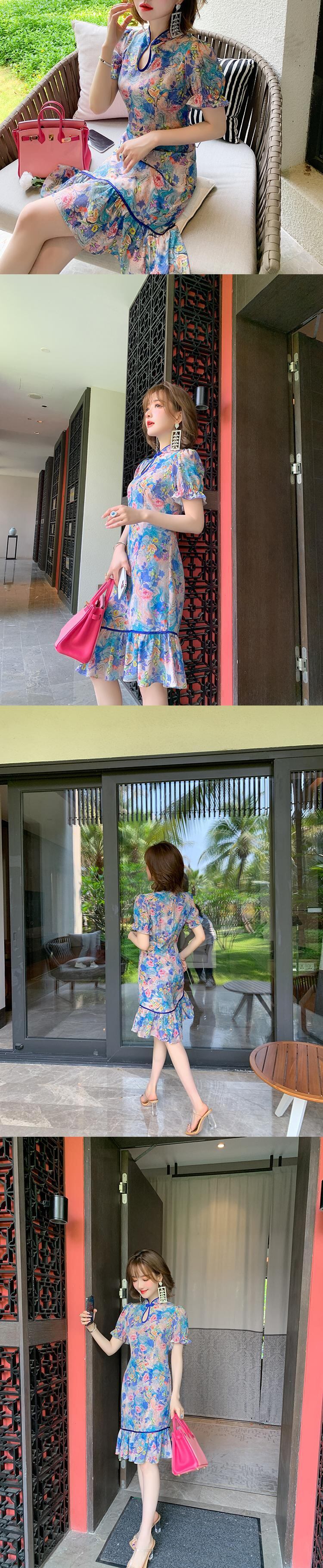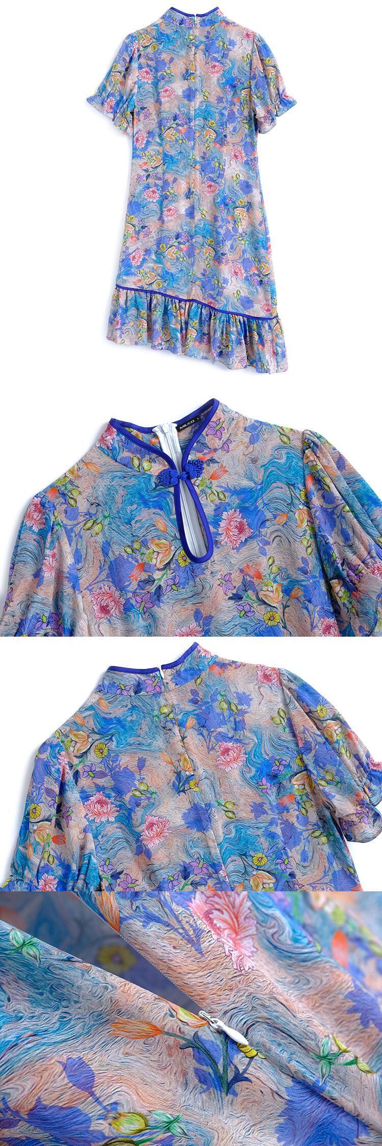 スタンドカラーカラープリント柄ドレス サマー 夏物 シルク ステッチ MIUCO66229523212
