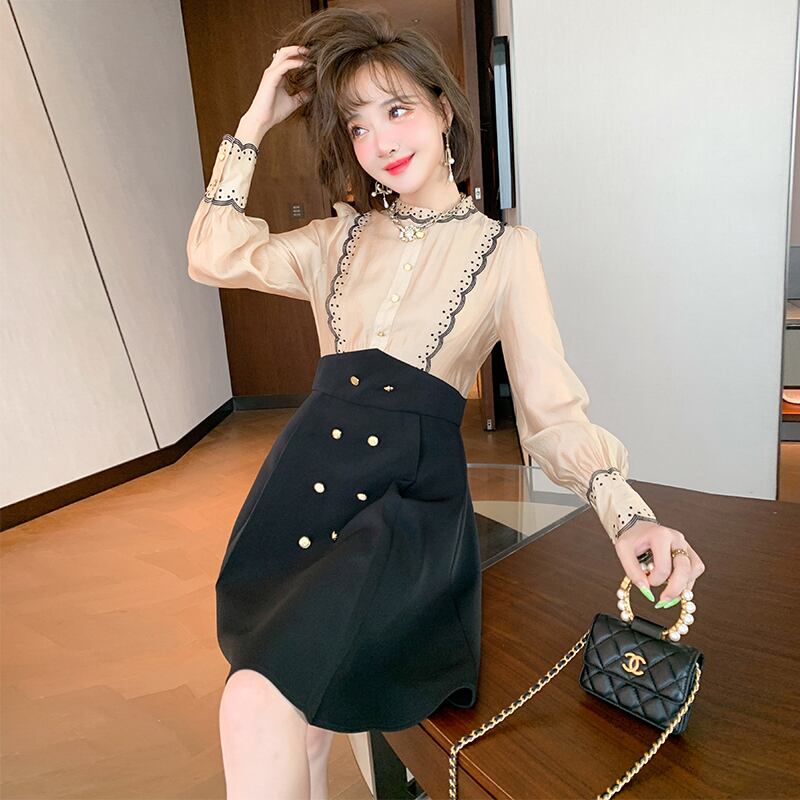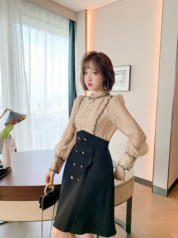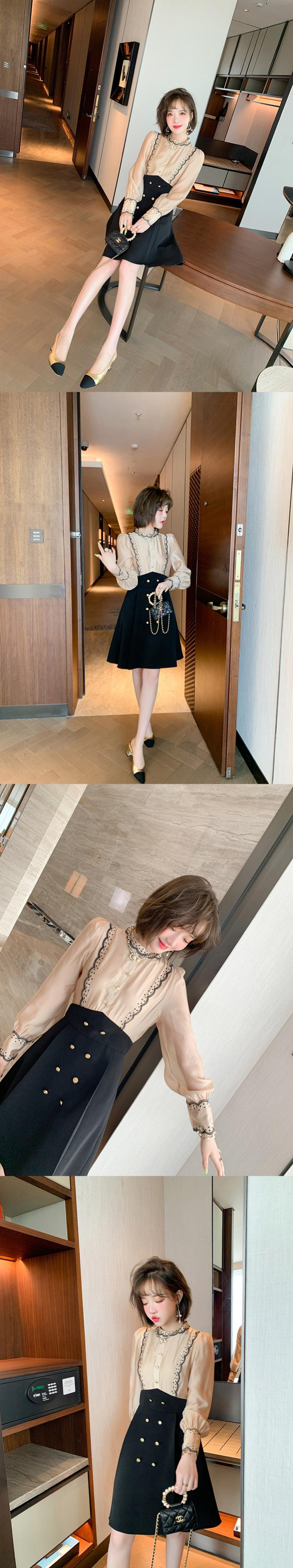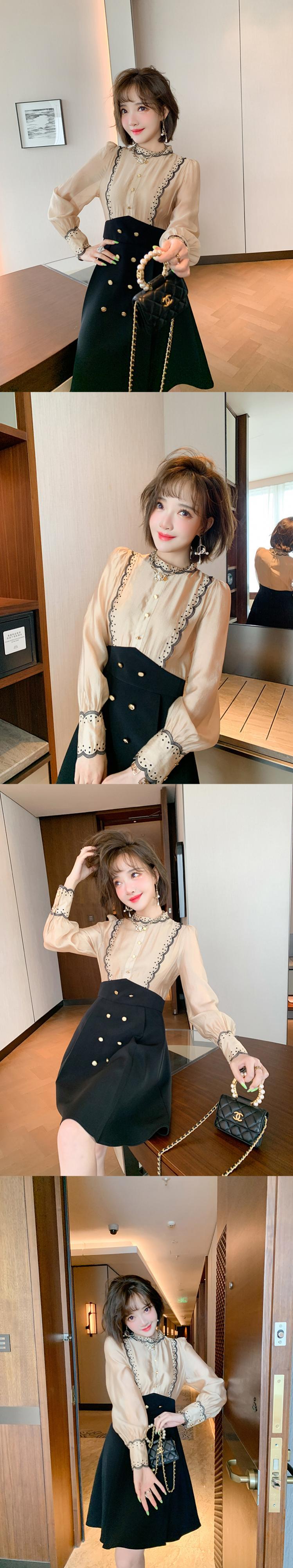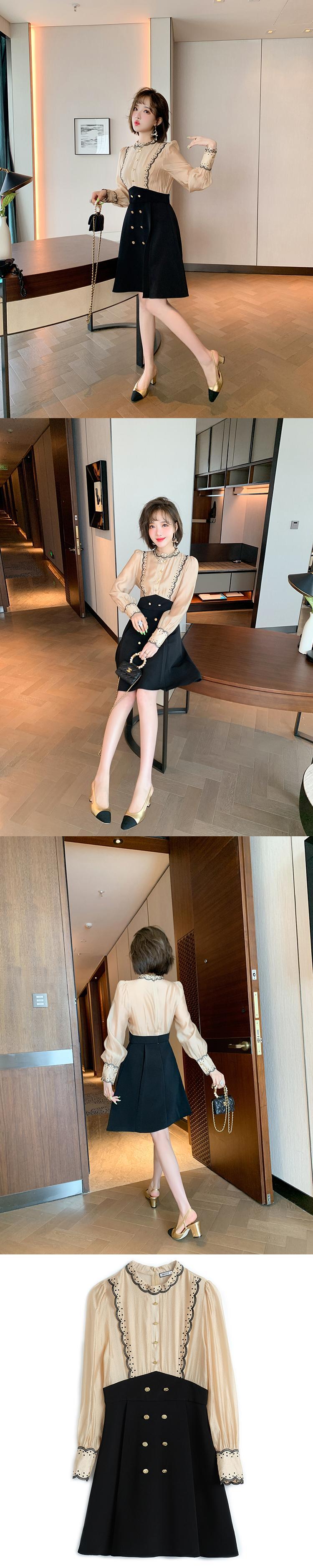 刺繍レースダブルブレストプリーツハイウェストウェストスカート ドレス オータム 秋物 ステッチ MIUCO25050933052