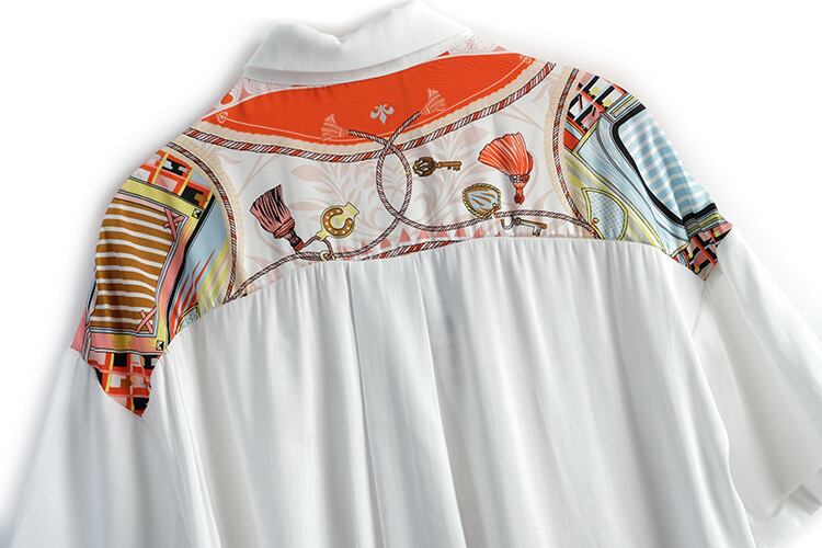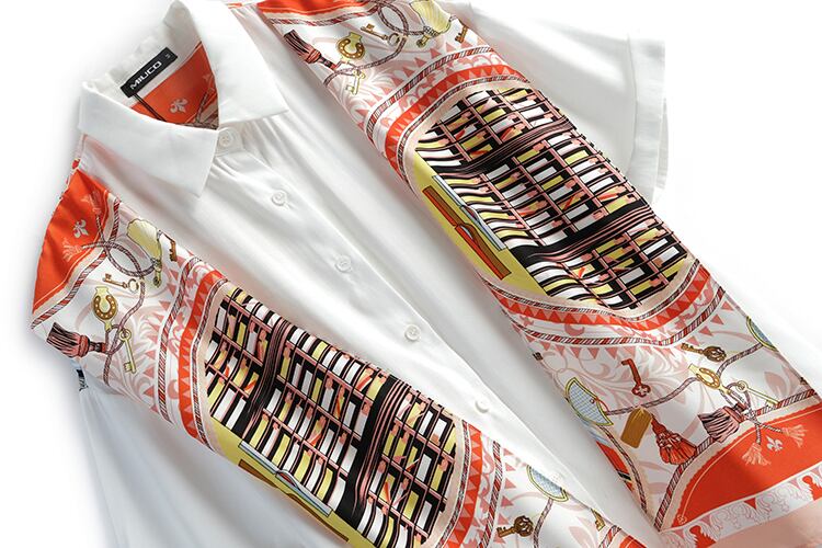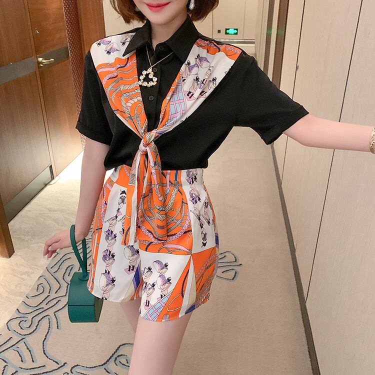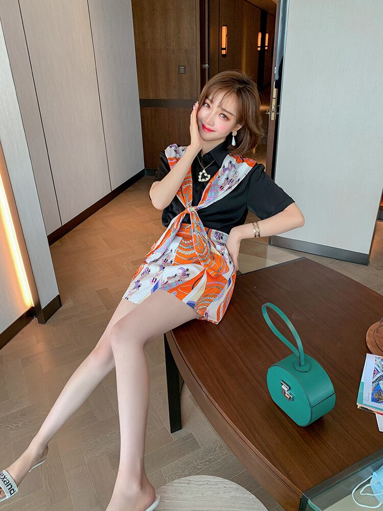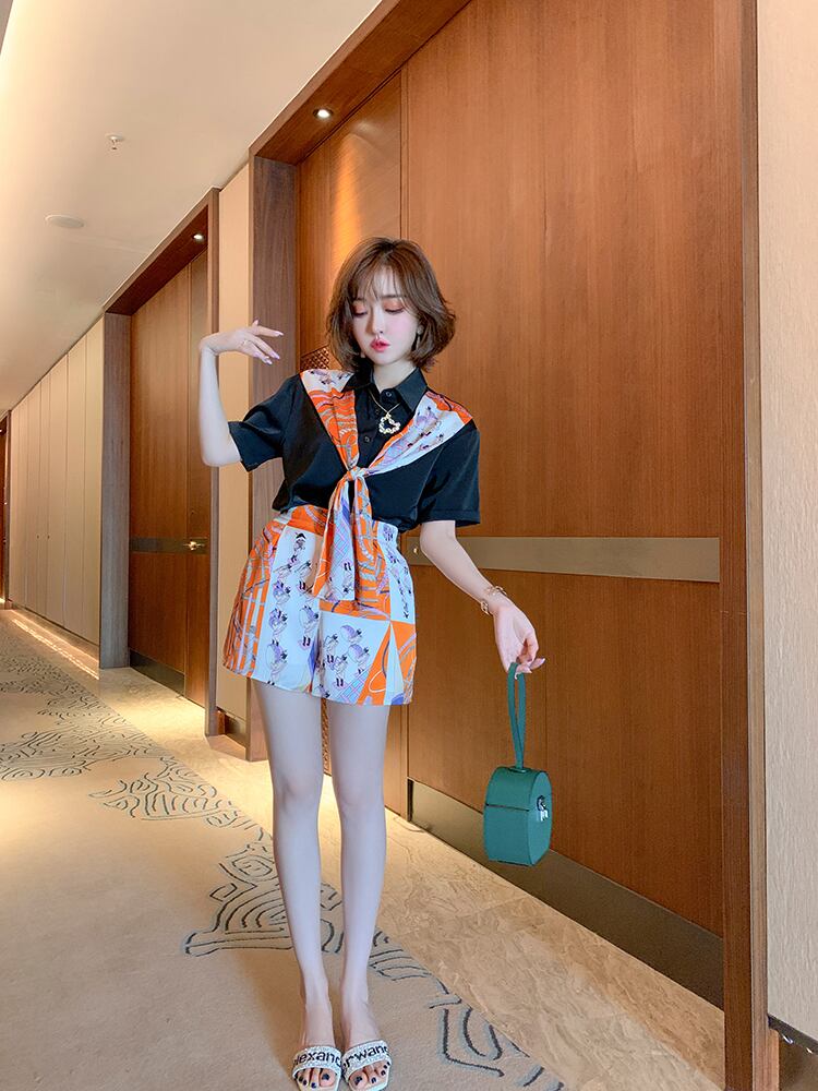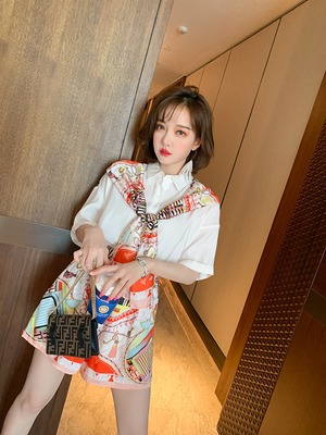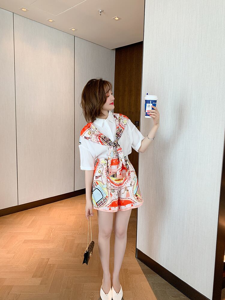 プリントスカーフ シャツ ハイウェストウェストワイドレッグショーツ サマー 夏物 ブルマー ワイドパンツ シルク ステッチ MIUCO97441090089