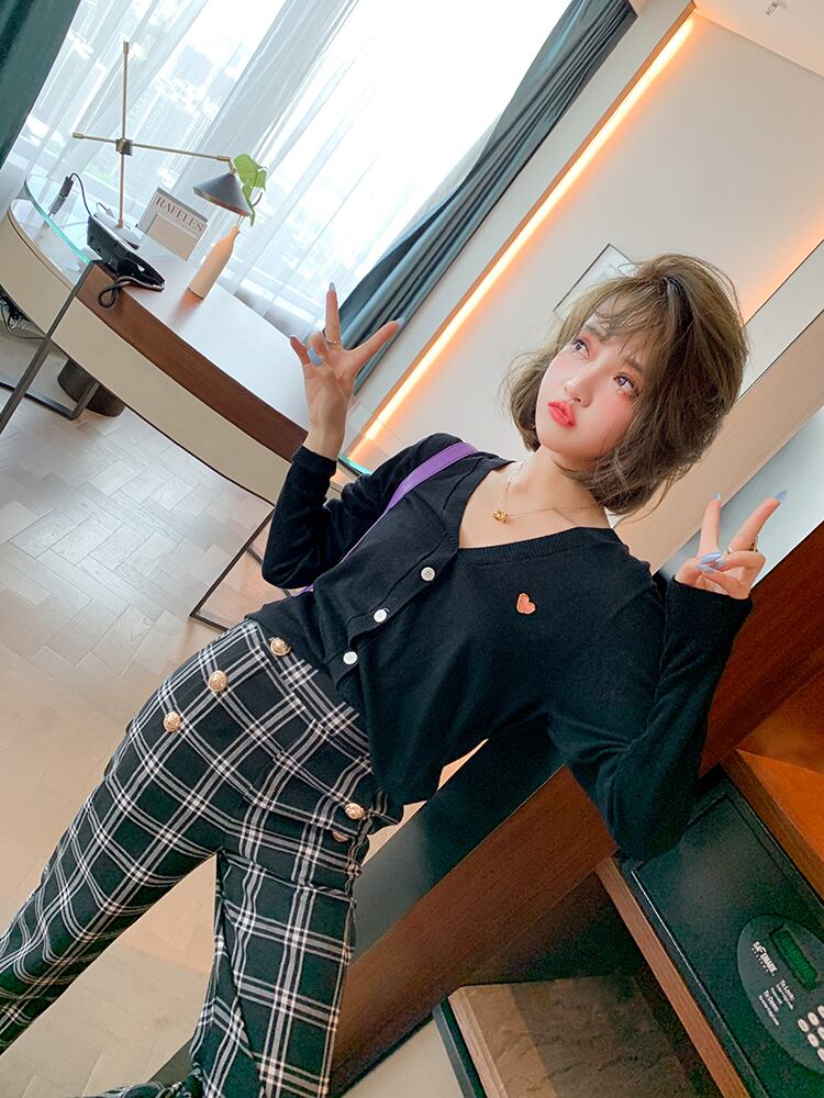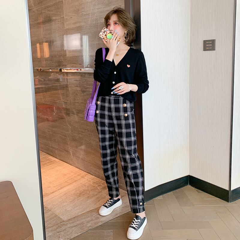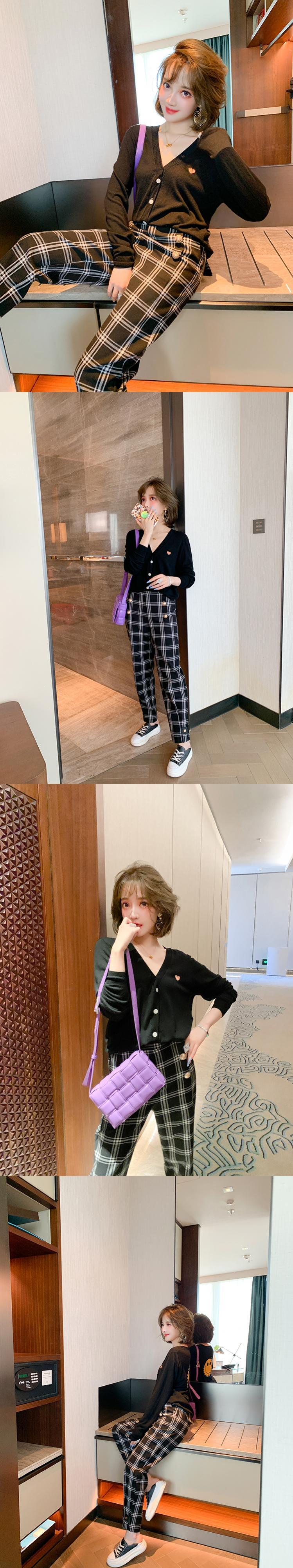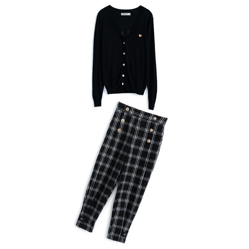 カラーVネックニットカーディガンスタンダード格子柄ハイウェストカジュアルパンツ オータム レトロ 秋物 MIUCO23798912585