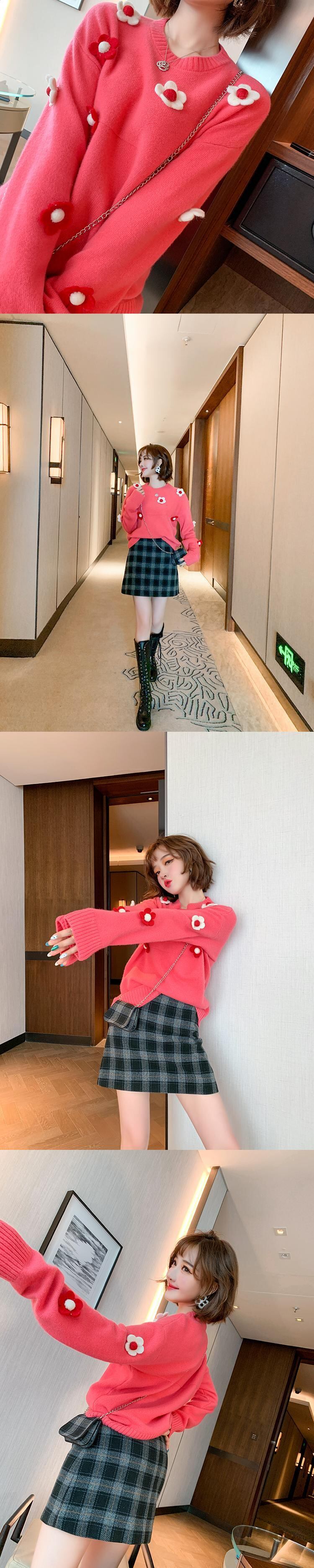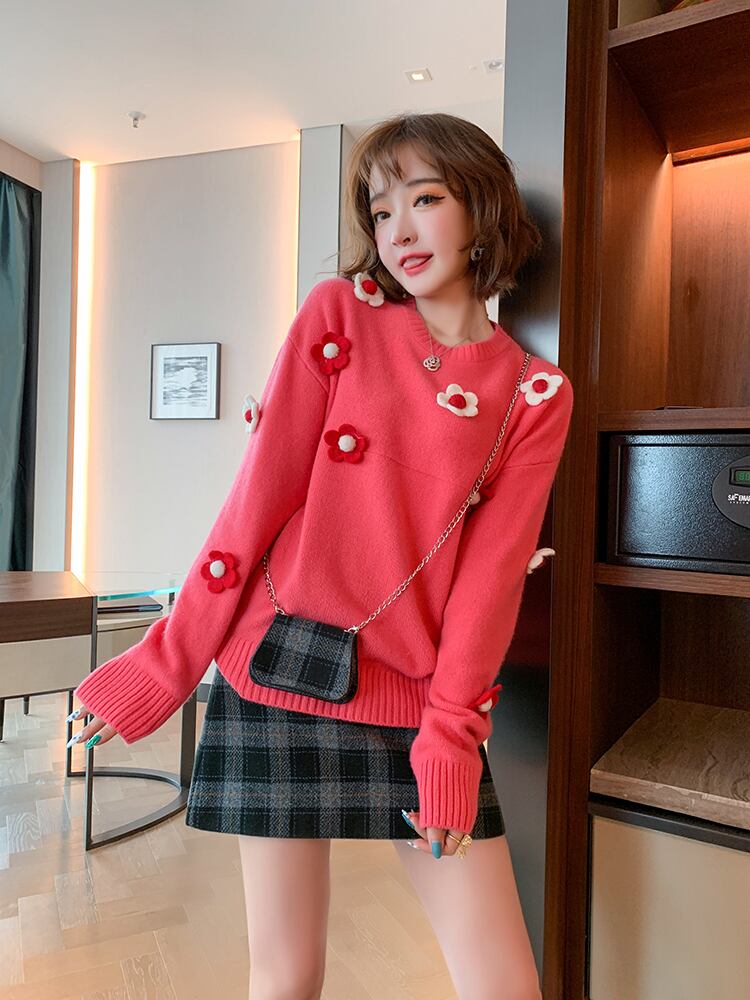 ラウンドネックニットセーター オータムウィンター 大人ガーリー スウィート キュート カジュアル 秋物 冬物 Oネック フラワーデザイン MIUCO97702188576
