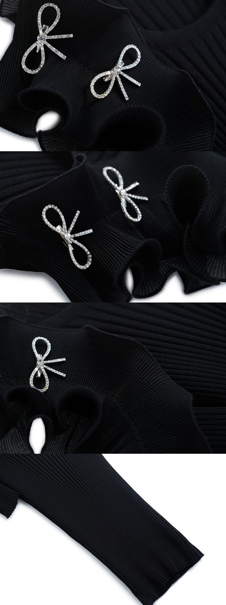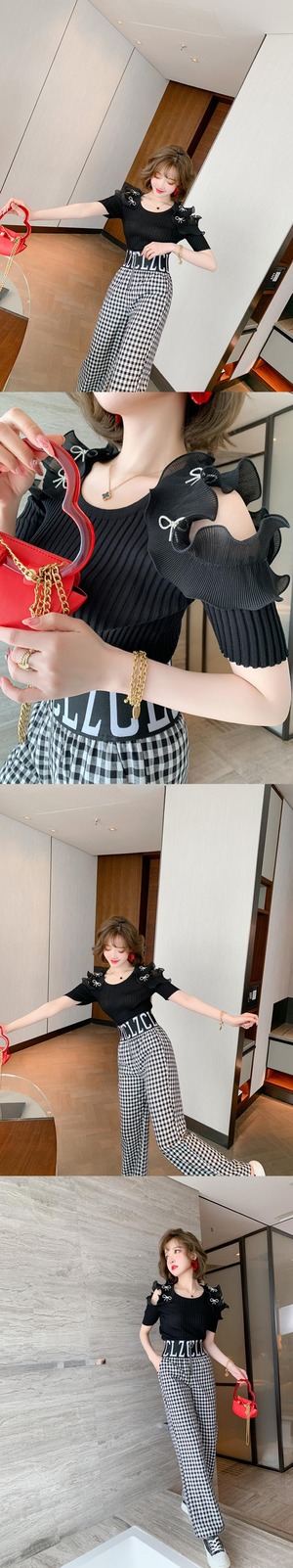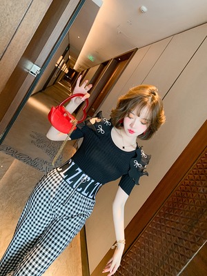 リボンニットハイウェスト格子柄パンツ サマー 夏物 オフショルダー MIUCO70660983940
