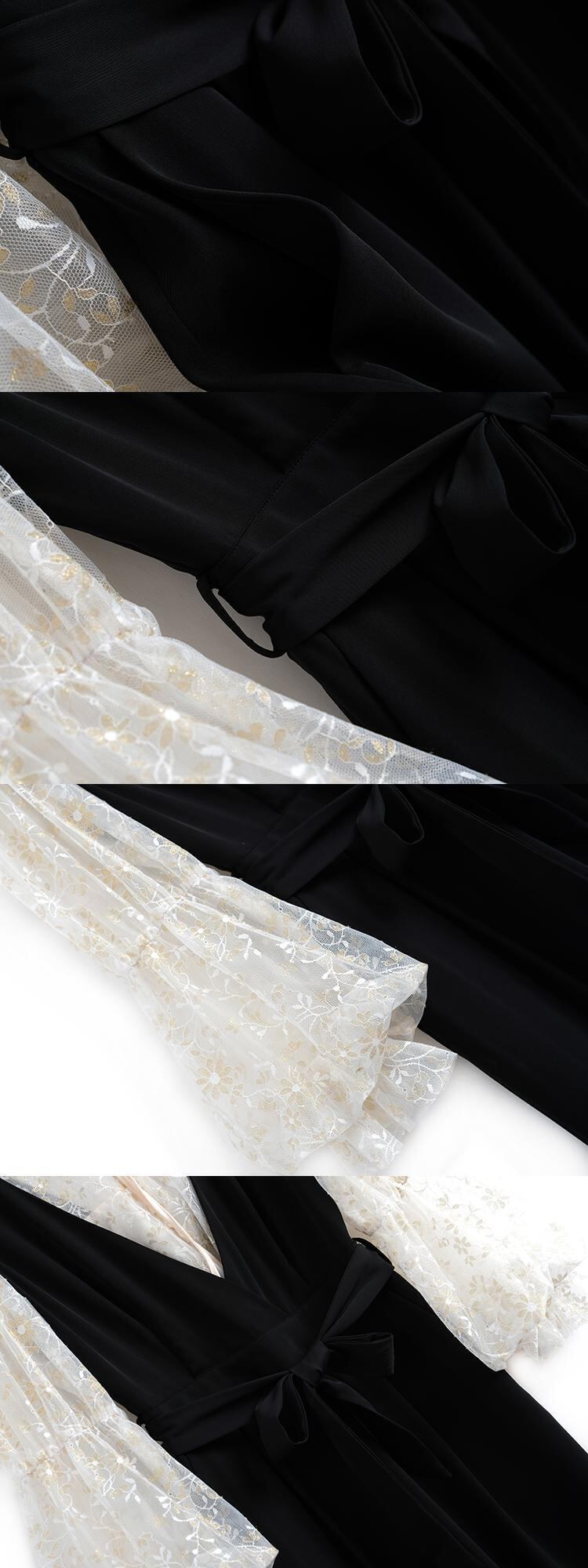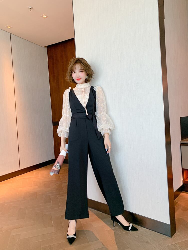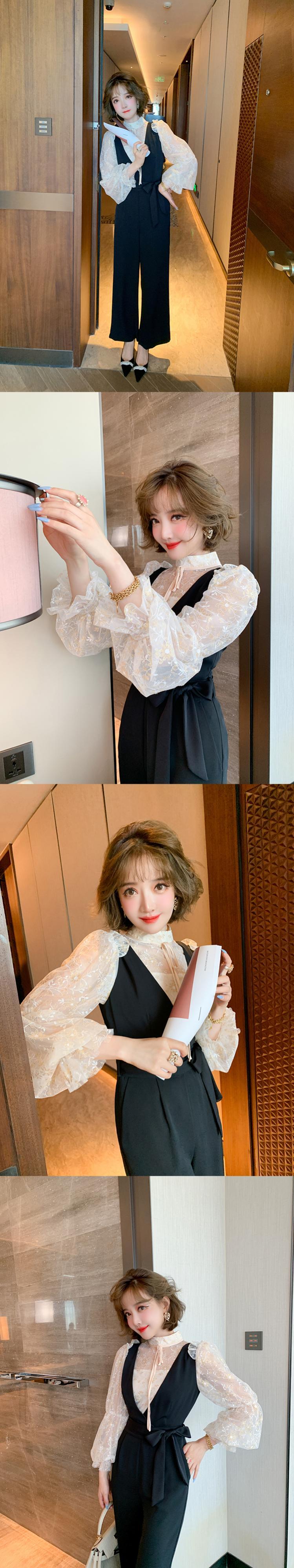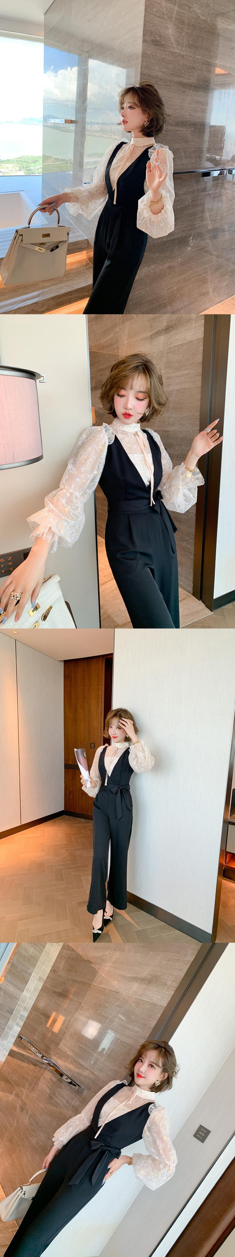 レースメッシュスタンドカラーカラートップス ハイウェストウェストワイドレッグオーバーオール セット オータム 秋物 ワイドパンツ MIUCO99973713772