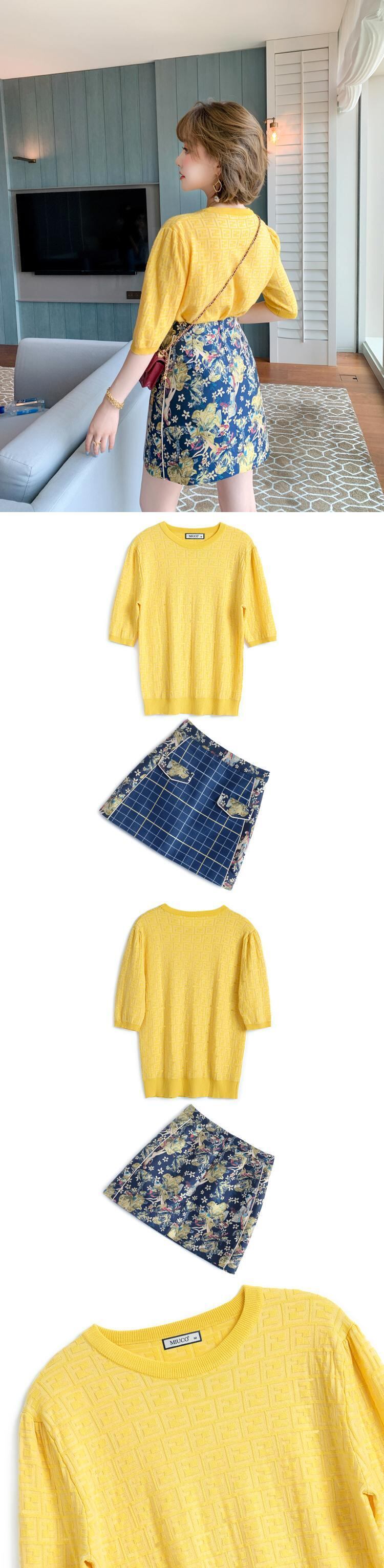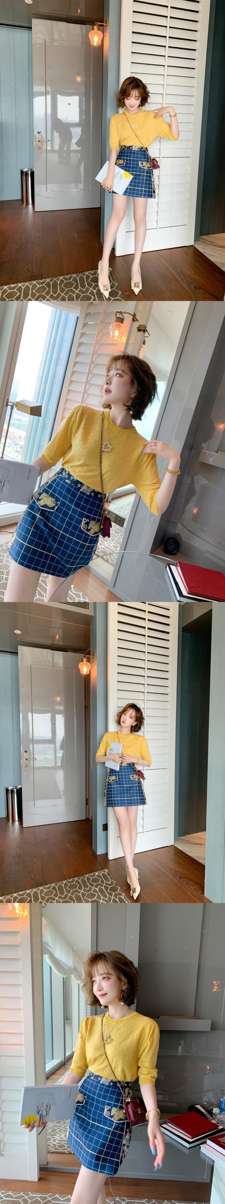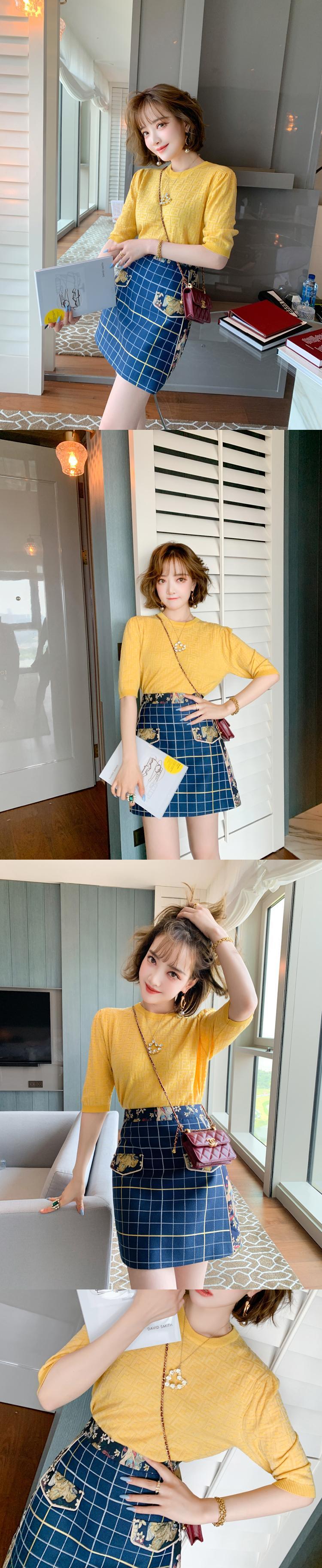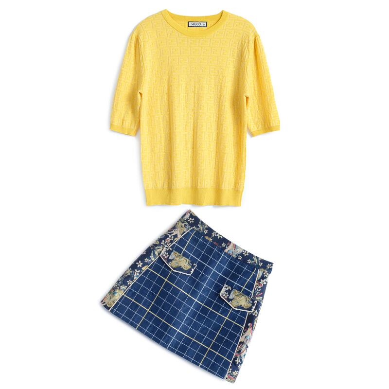 ジャカードラウンドネックニットトップス ハイウェストウェスト格子柄プリント柄スカート オータム 秋物 Oネック MIUCO47669229062