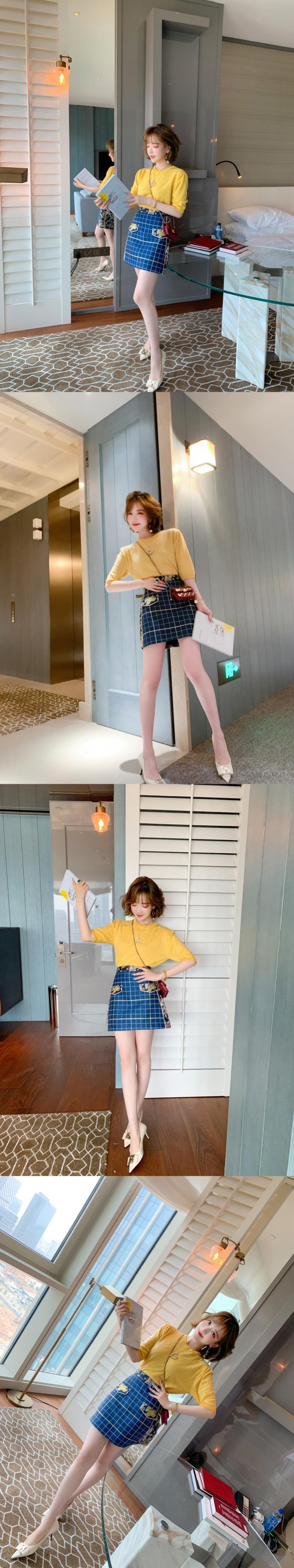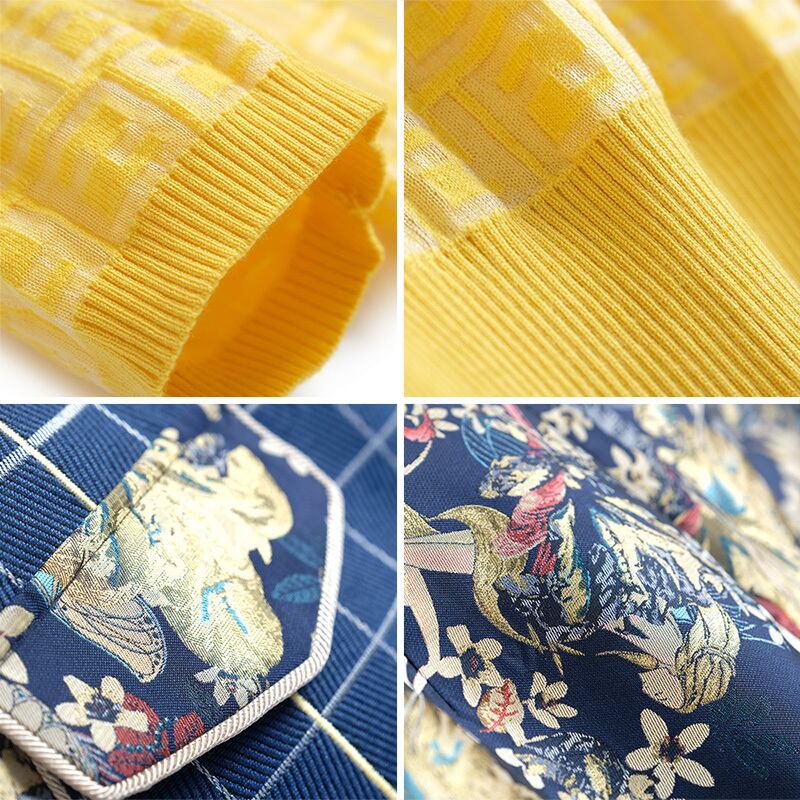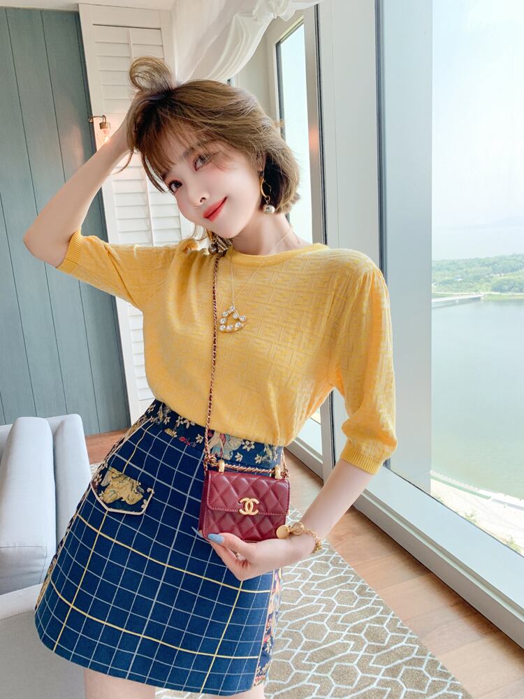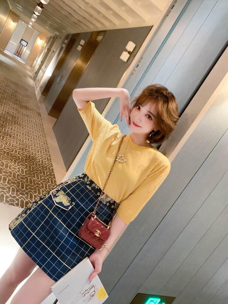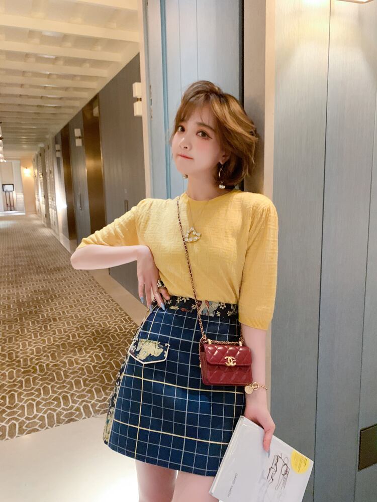 ジャカードラウンドネックニットトップス ハイウェストウェスト格子柄プリント柄スカート オータム 秋物 Oネック MIUCO47669229062