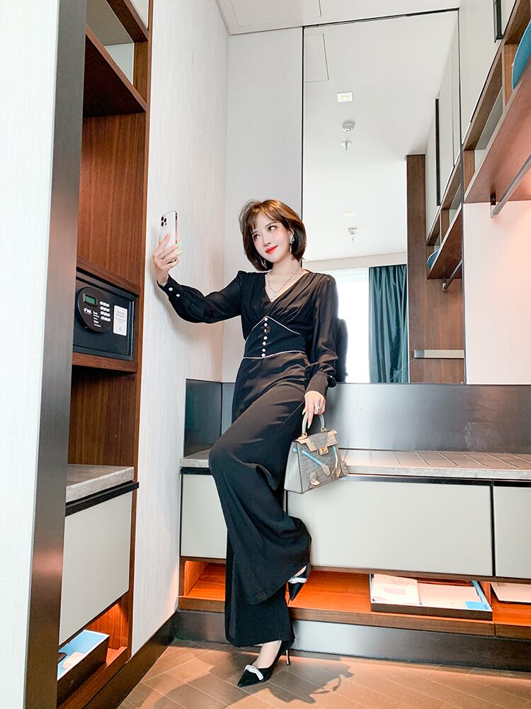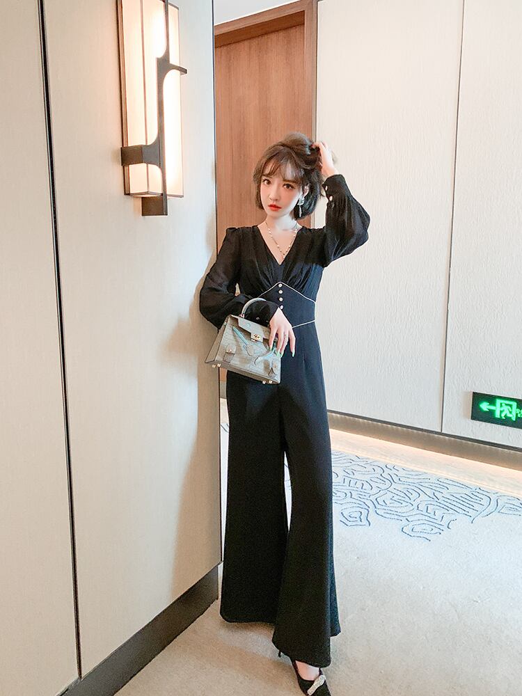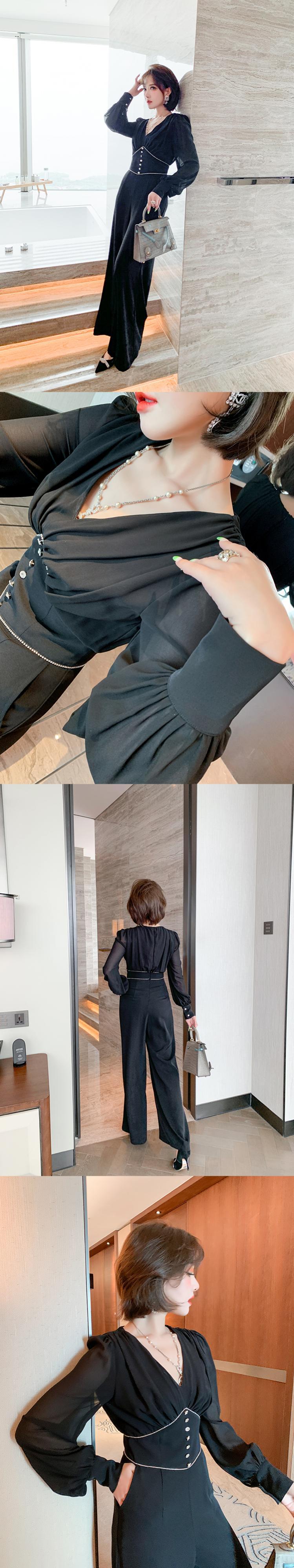 Vネックチェーン ウェストルーズジャンプスーツ オールインワン オータム 秋物 MIUCO14520109926