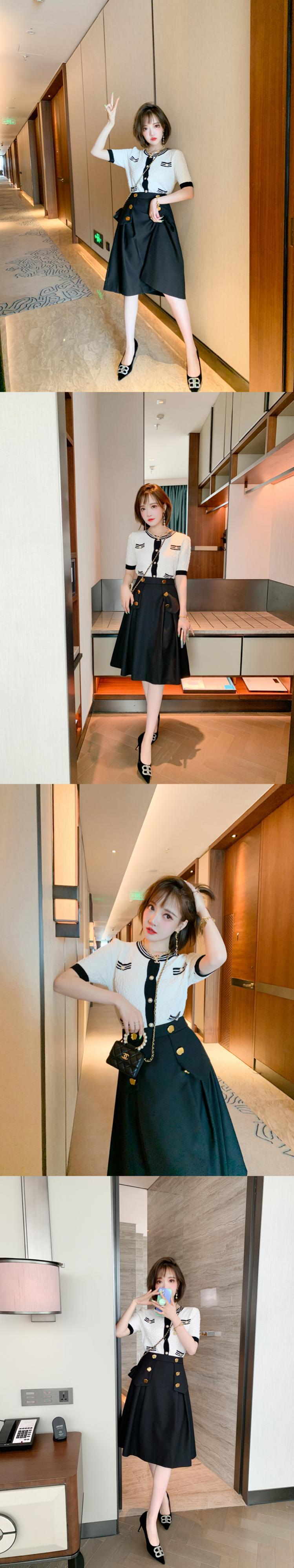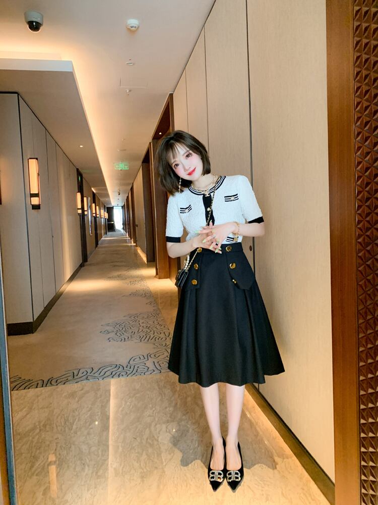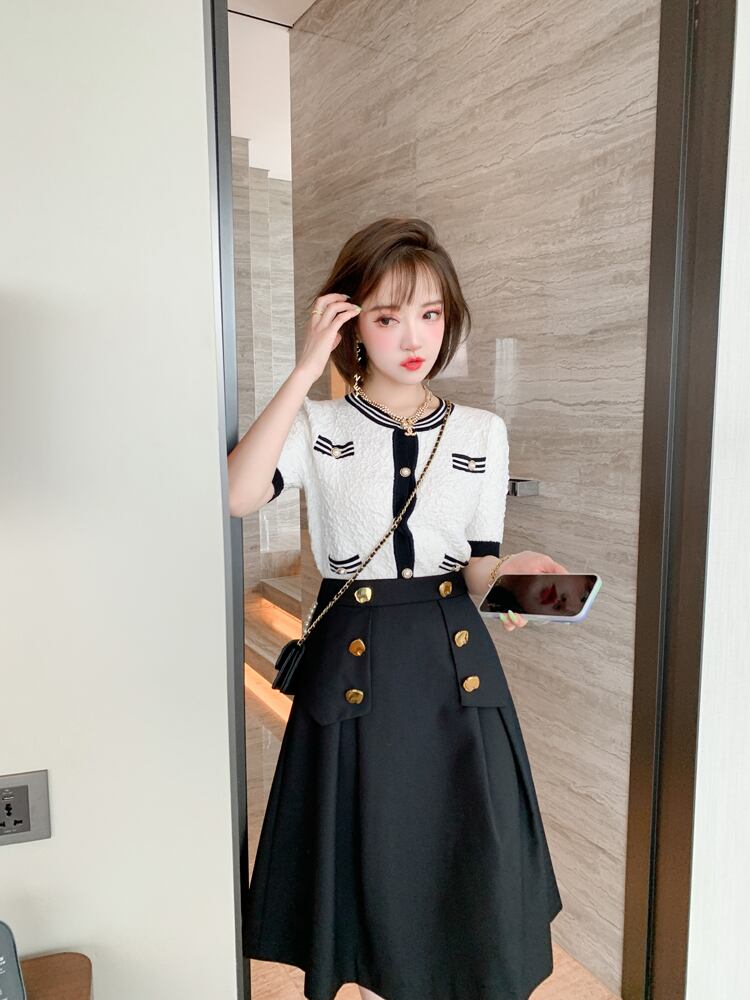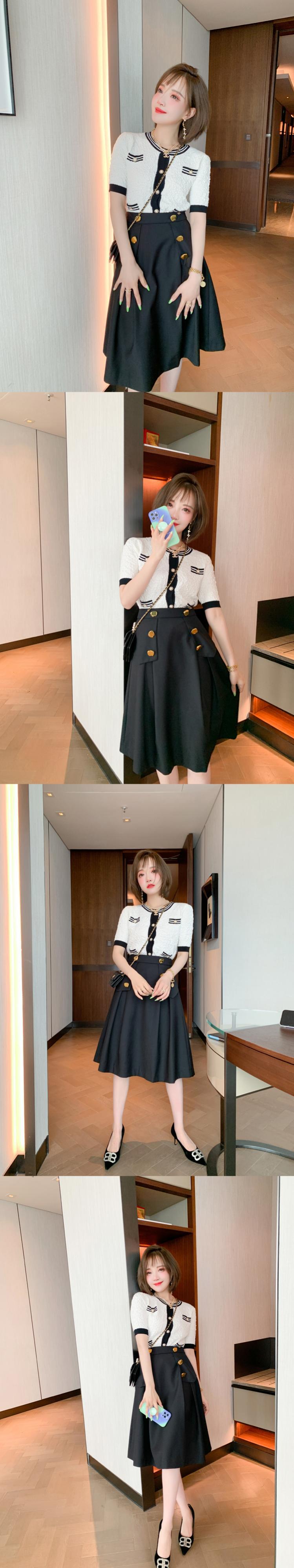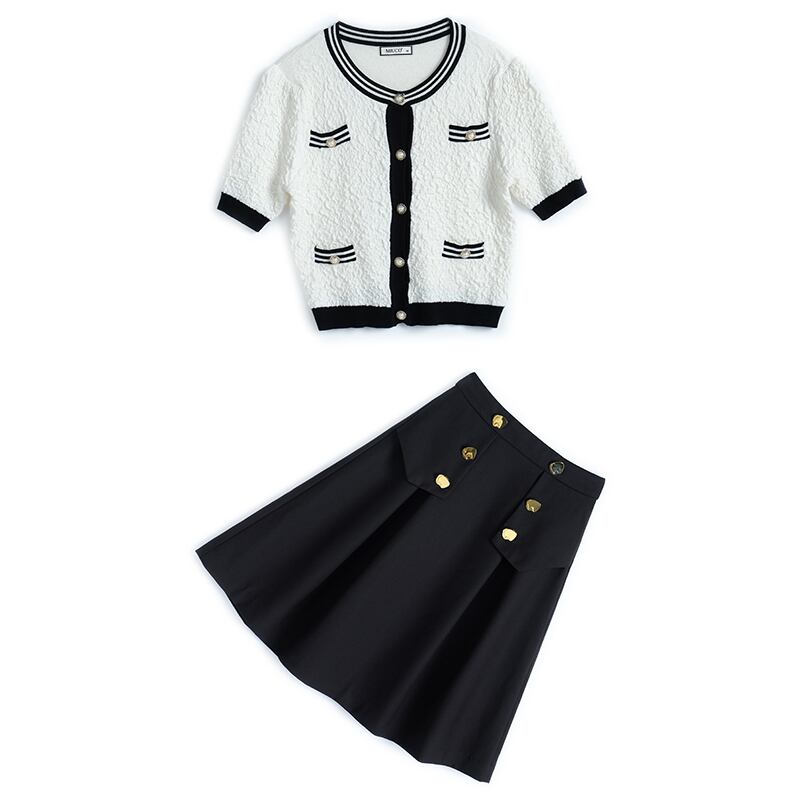ジャカードストライプラウンドネックセーター ダブルブレストゴールドバックルスカート オータムスタイル 秋物 Oネック MIUCO362437713
