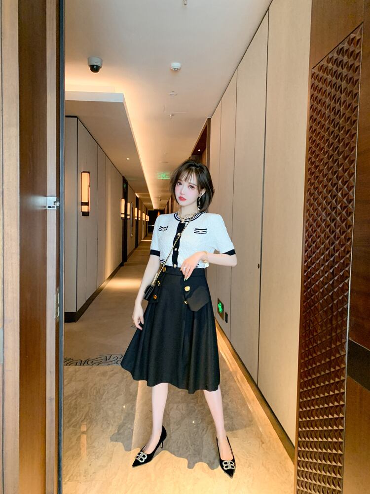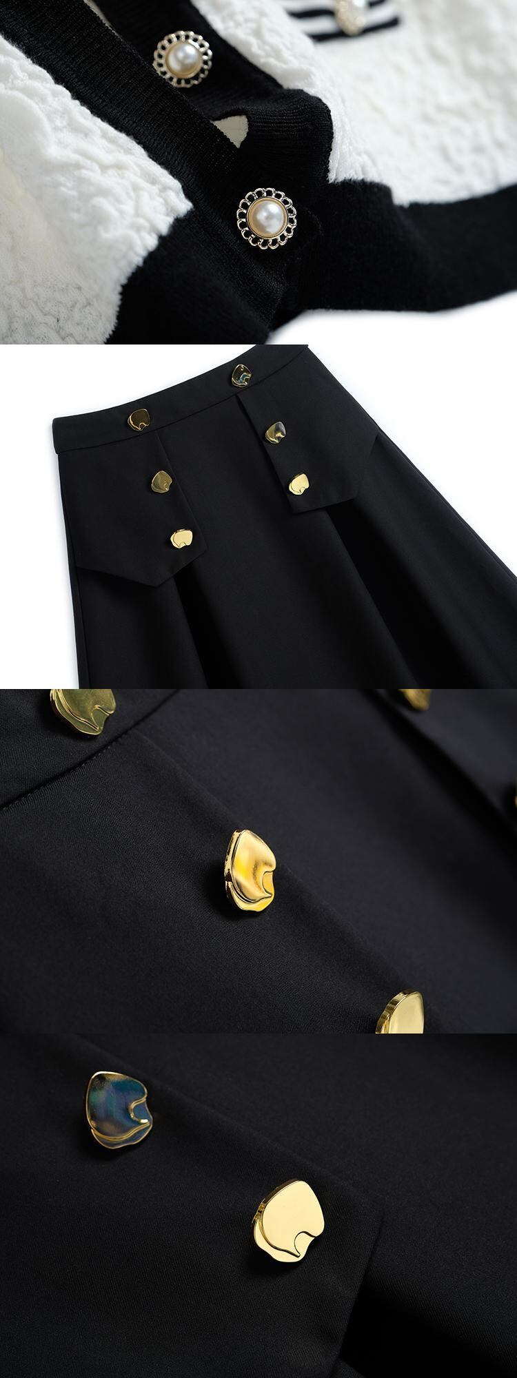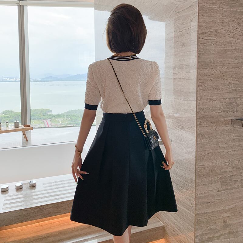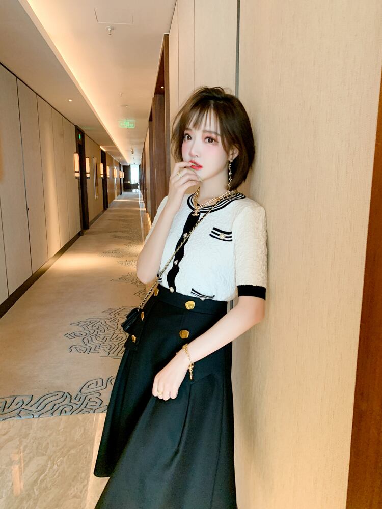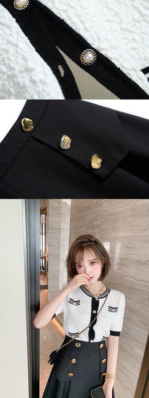 ジャカードストライプラウンドネックセーター ダブルブレストゴールドバックルスカート オータムスタイル 秋物 Oネック MIUCO362437713