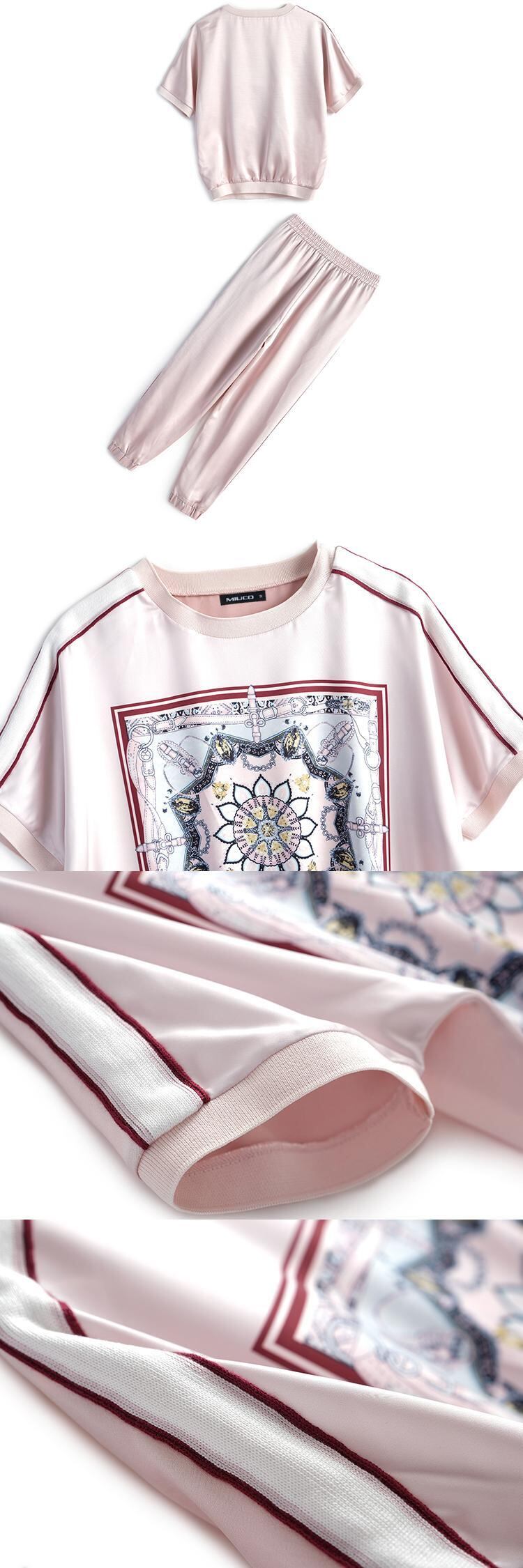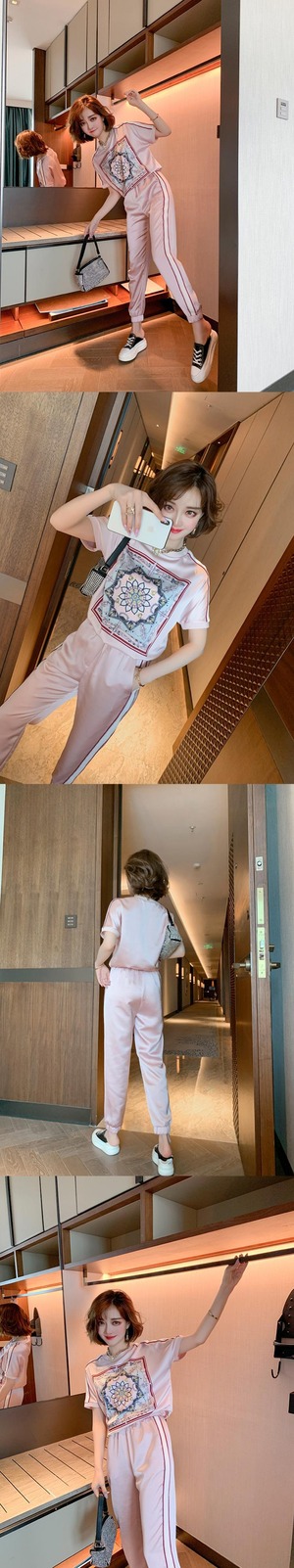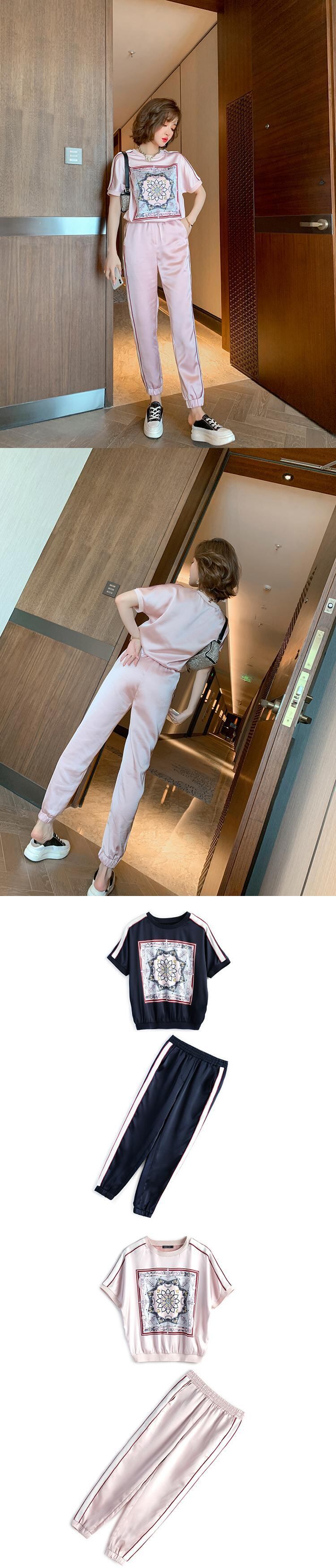 プリントカラーストライプラウンドネックTシャツ カジュアルパンツ スプリング 春物 Oネック MIUCO5269617409