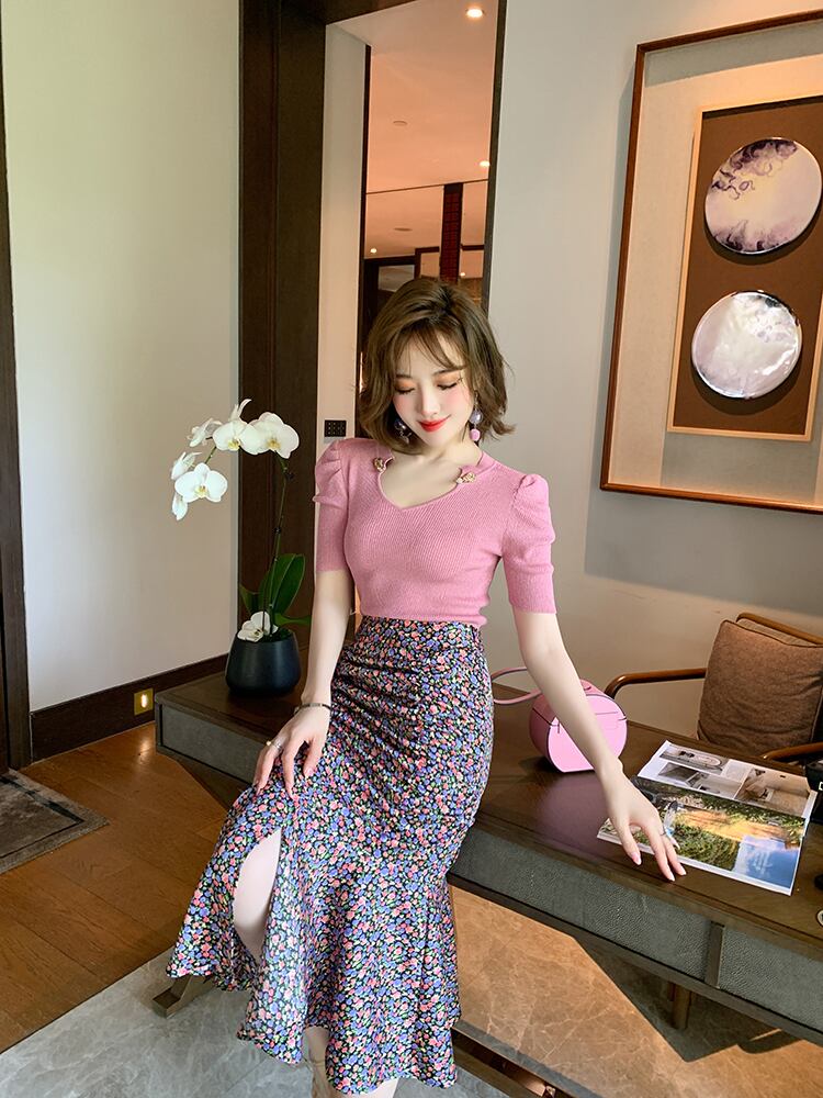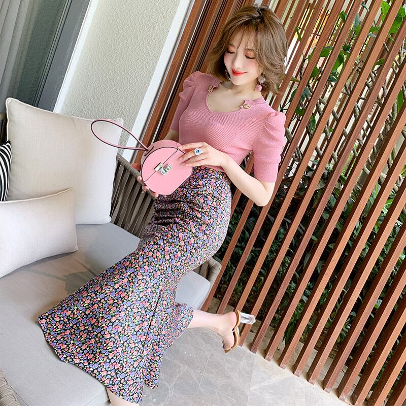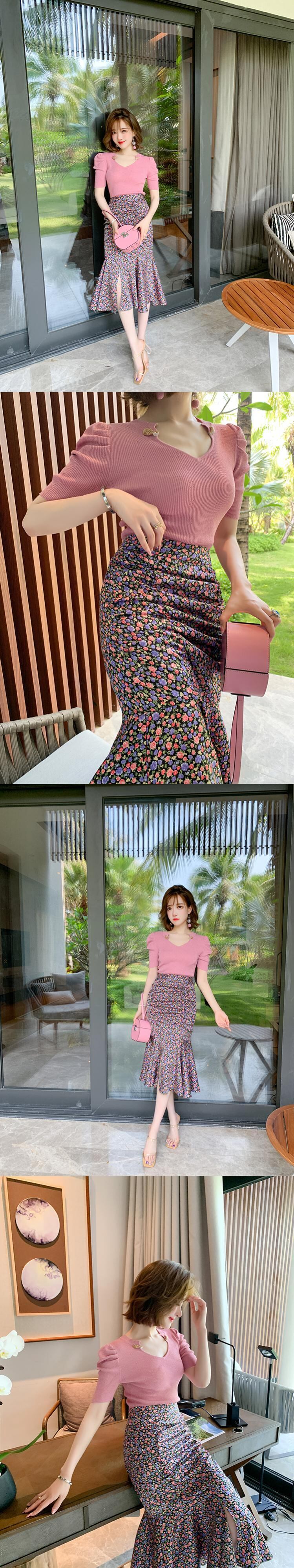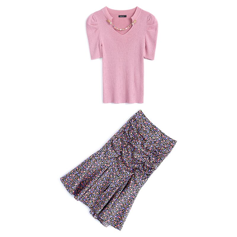 スタンダードスリーブニットTシャツ プリントラッフルスカート セット サマー レトロ 夏物 MIUCO22193781272