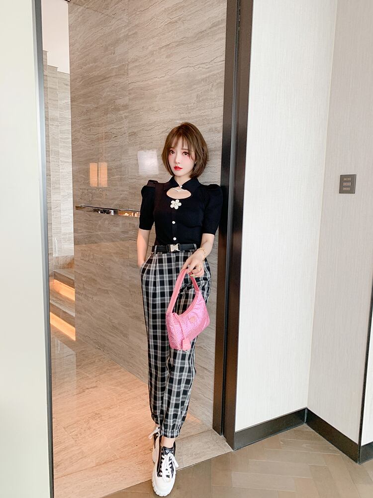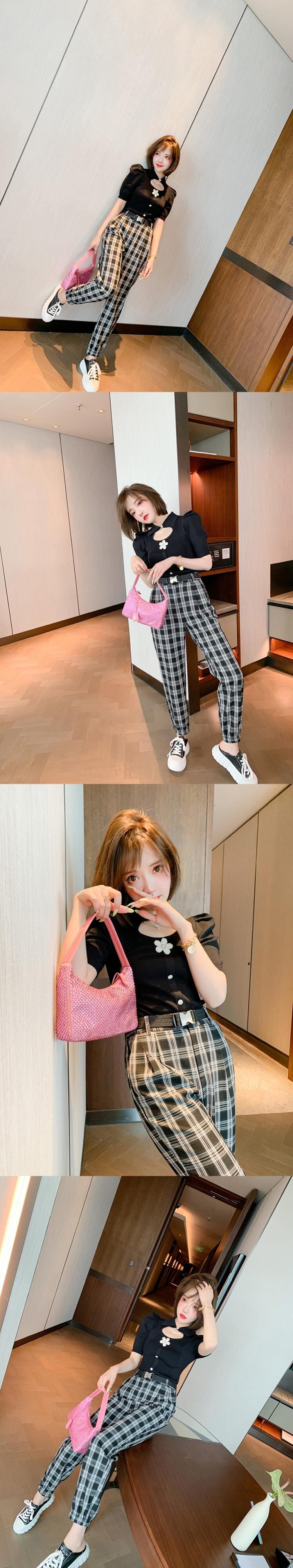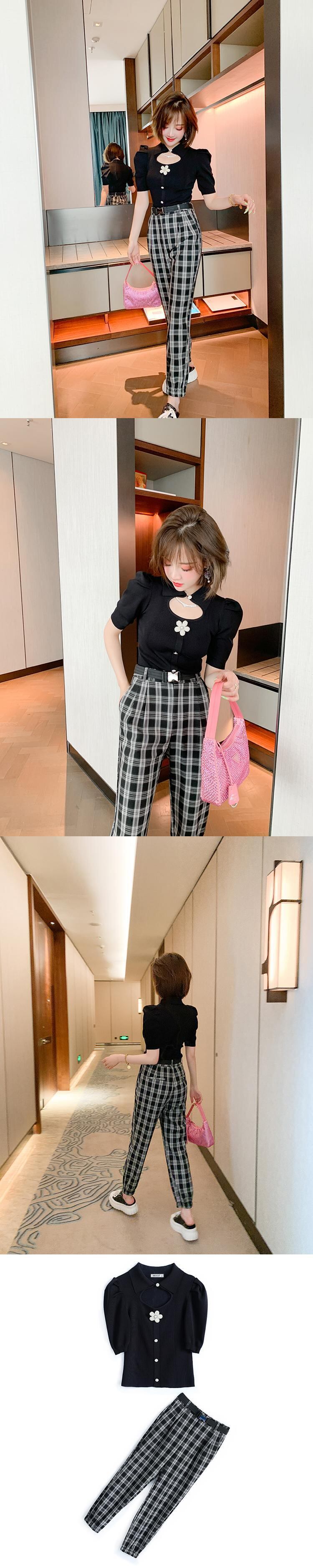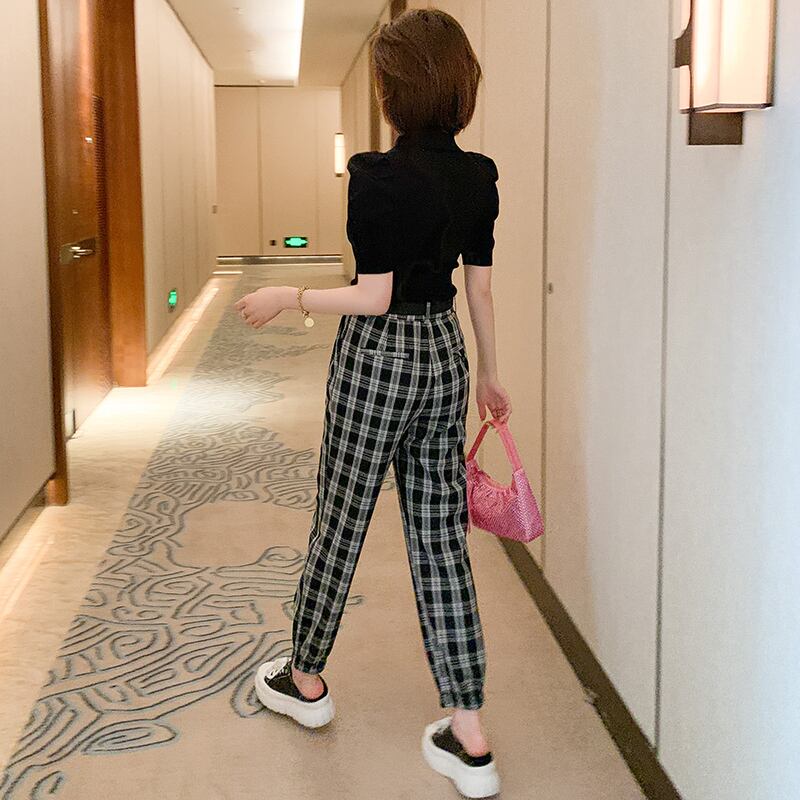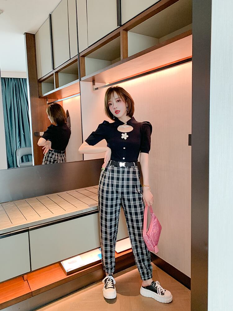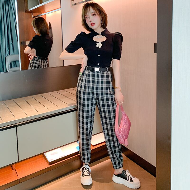 スリーブトップス スタンダード格子柄パンツ セット レトロ MIUCO15845395418