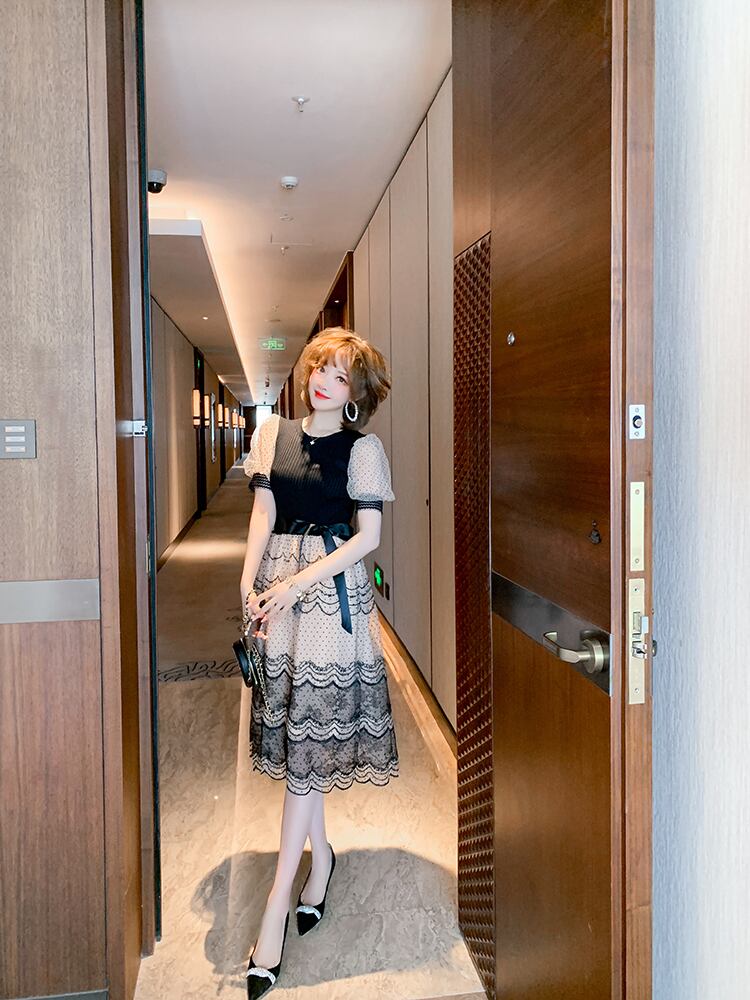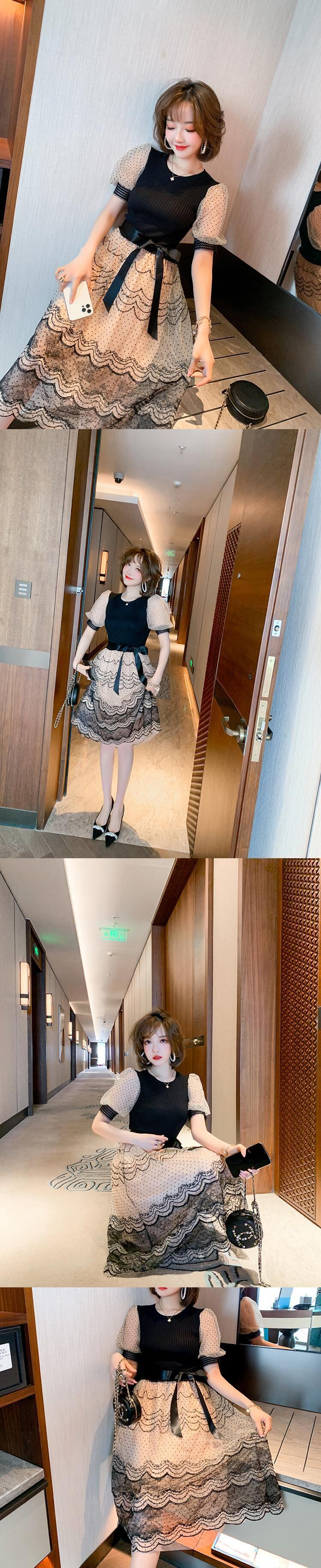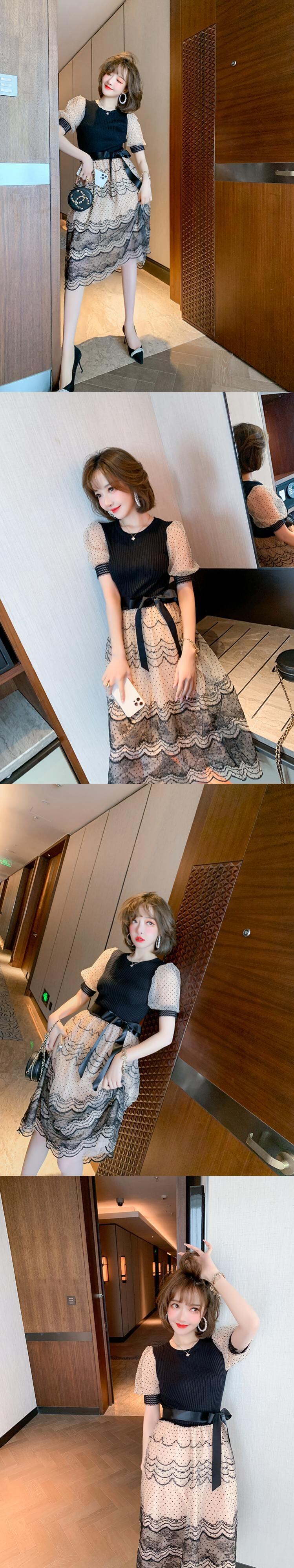 ニット 水玉メッシュウェストレーススカート ドレス サマー 夏物 ステッチ MIUCO75068597564