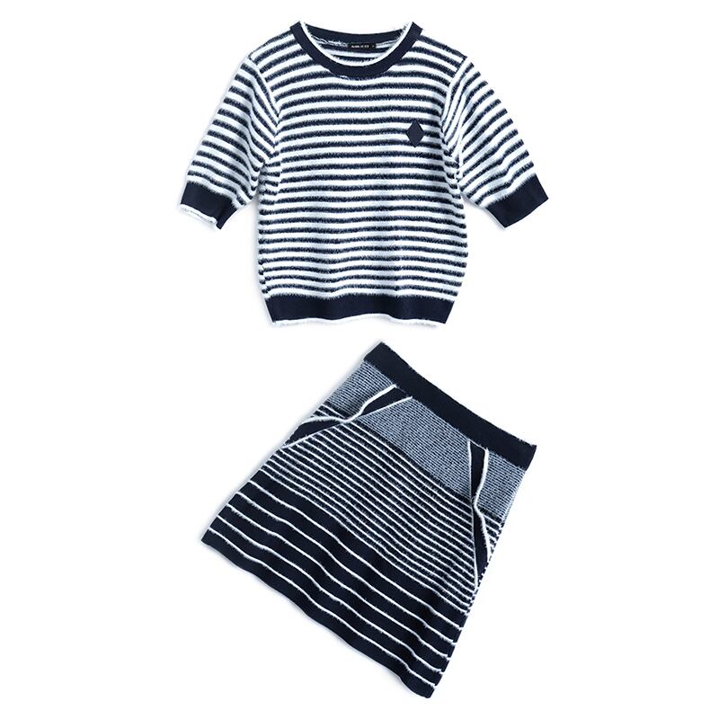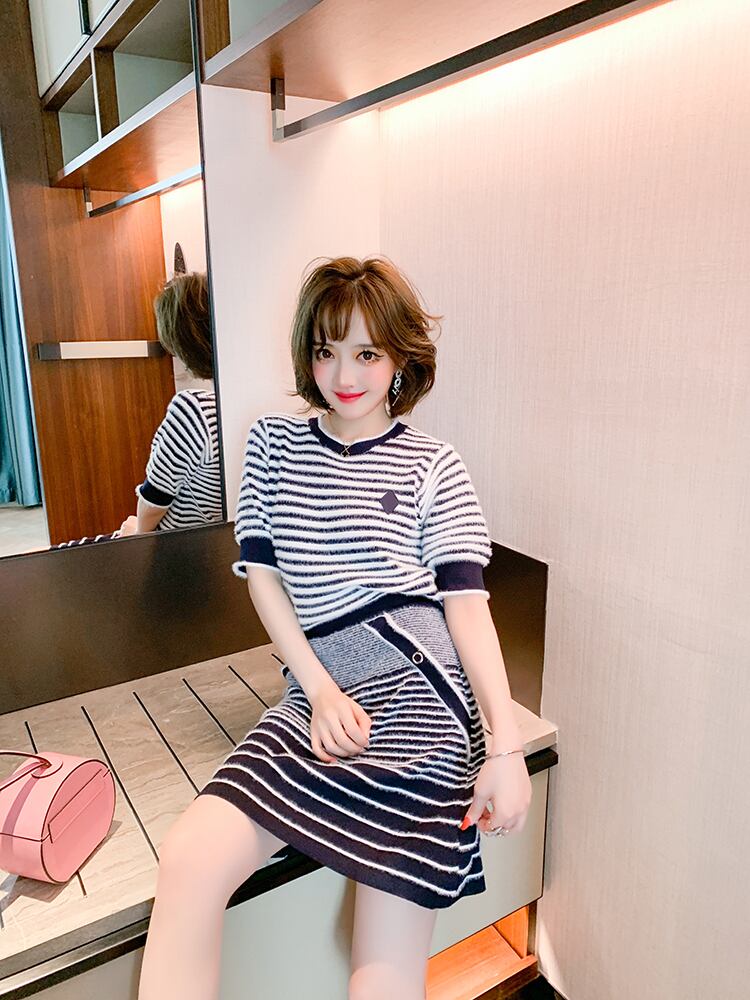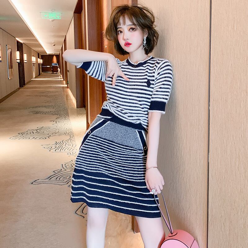 ストライプニットラウンドネックブラウス ハイウェストウェストスリムスカート スプリングサマー 春物 夏物 Oネック MIUCO45224222095