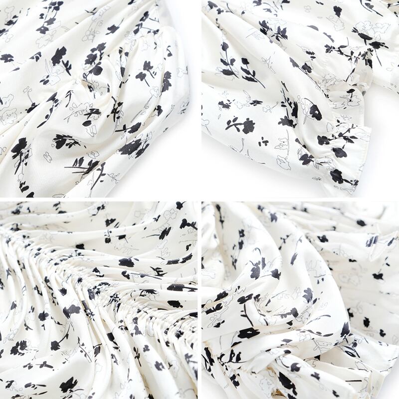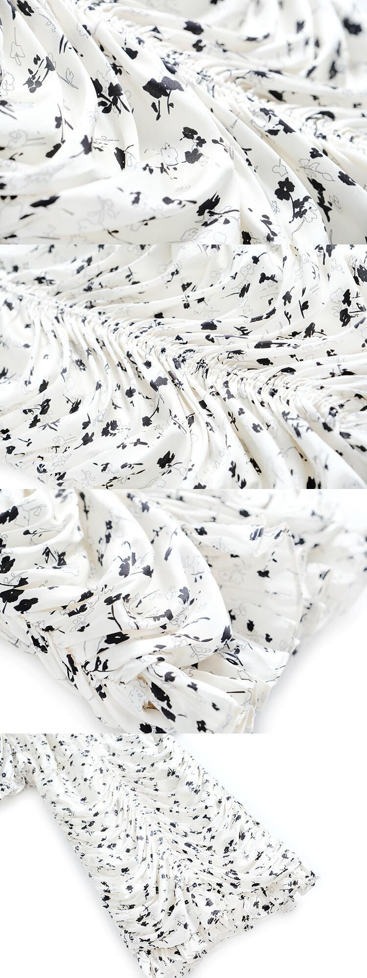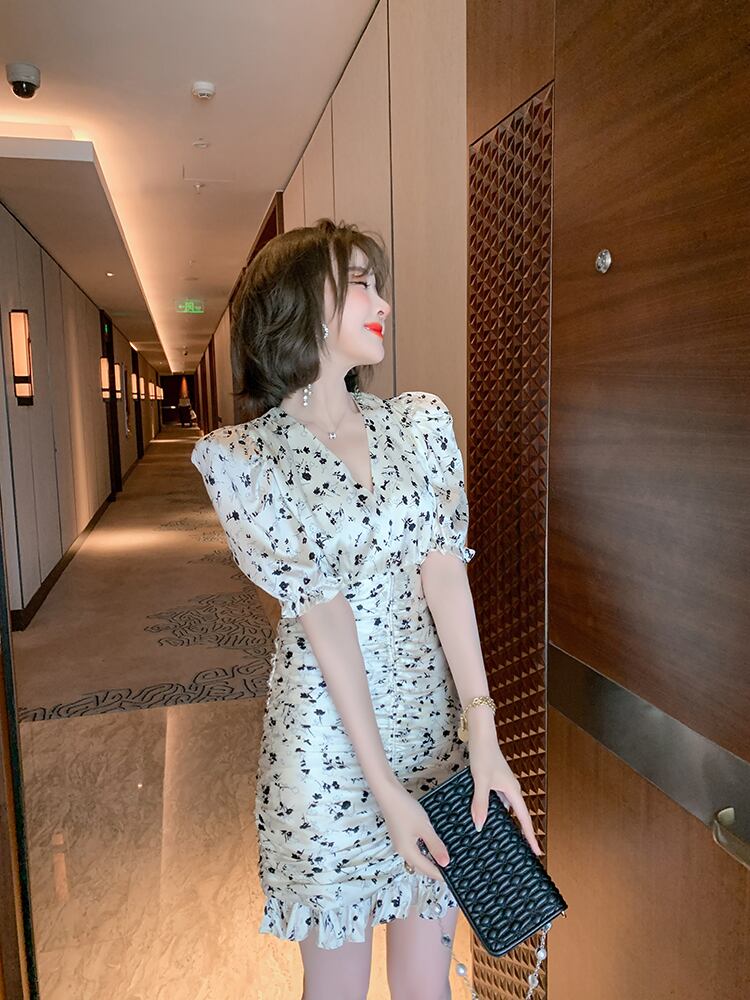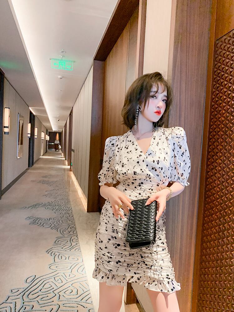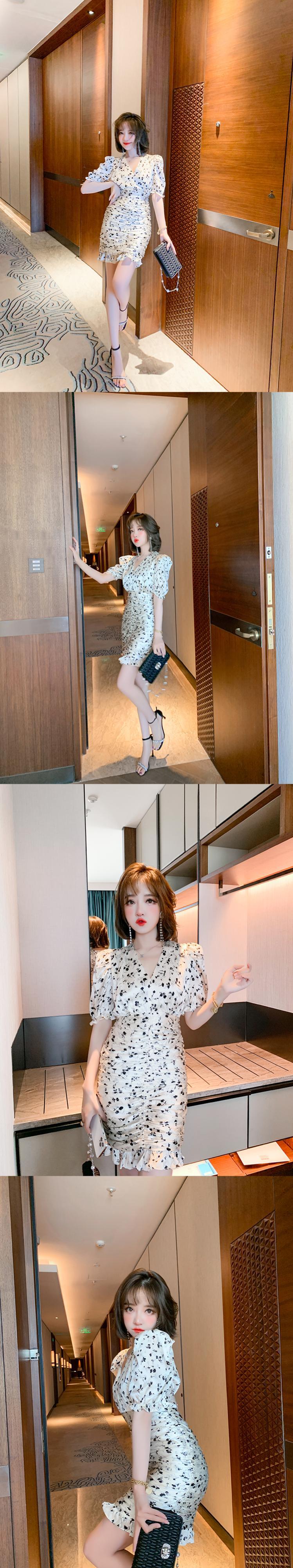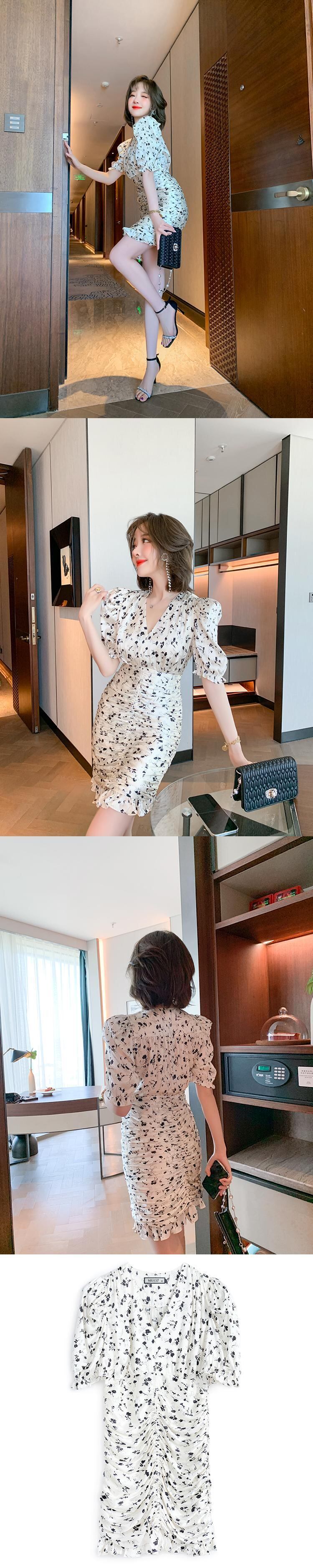 Vネックスリーブプリーツスリムプリント柄ドレス サマー 夏物 MIUCO184781136