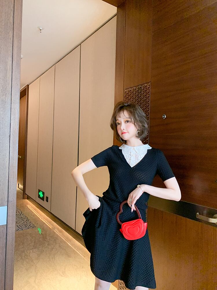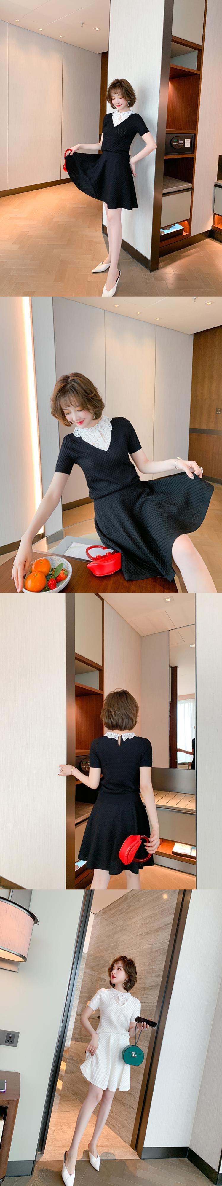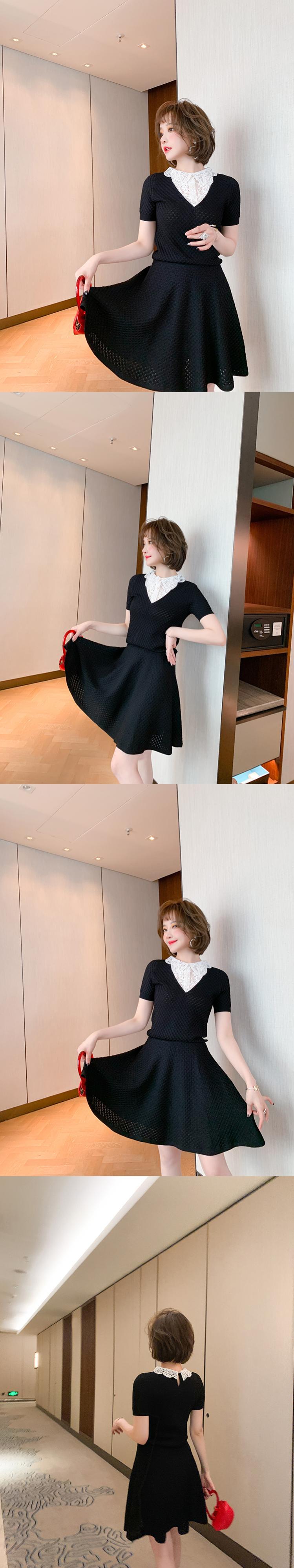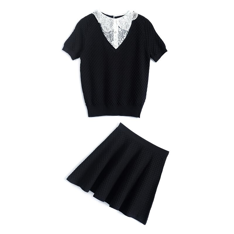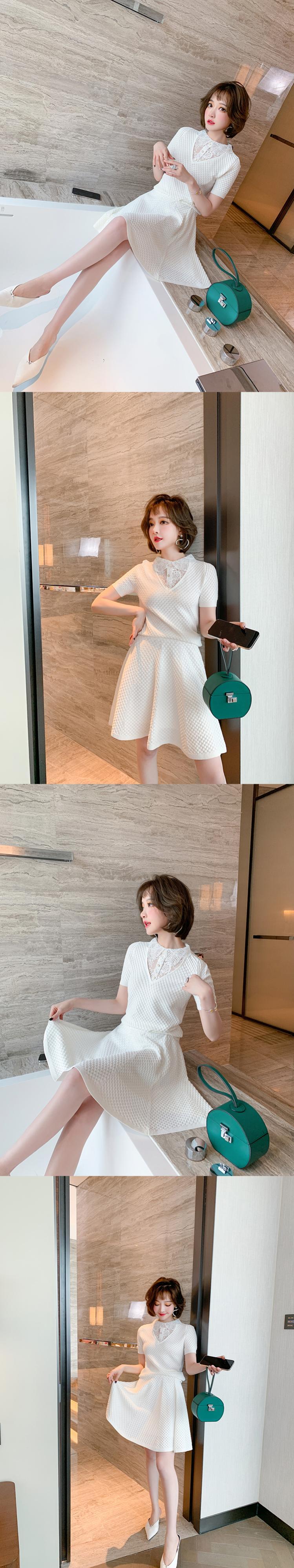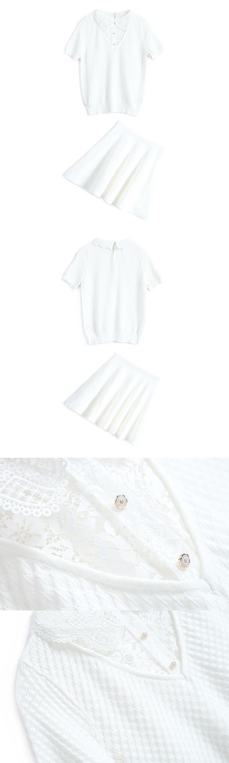 レースカラースリムトップス ハイウェストウェストAラインスカート スプリング 春物 ステッチ MIUCO90604261888