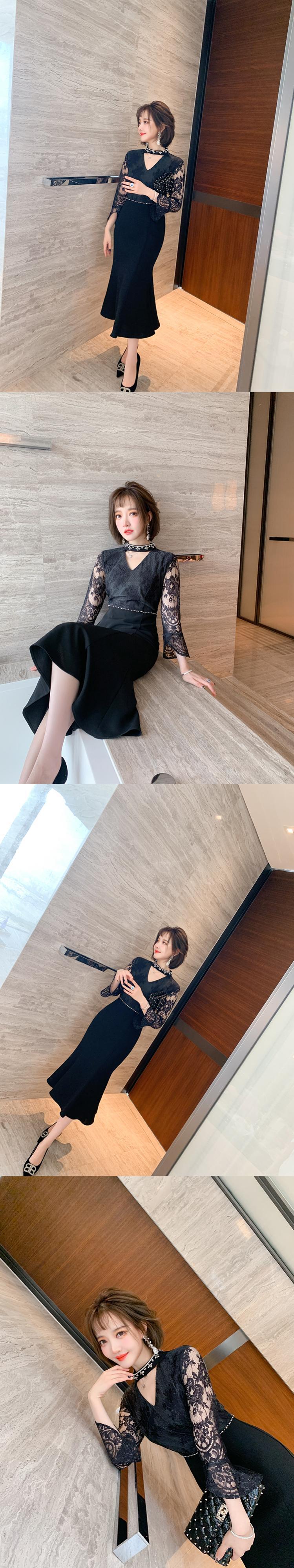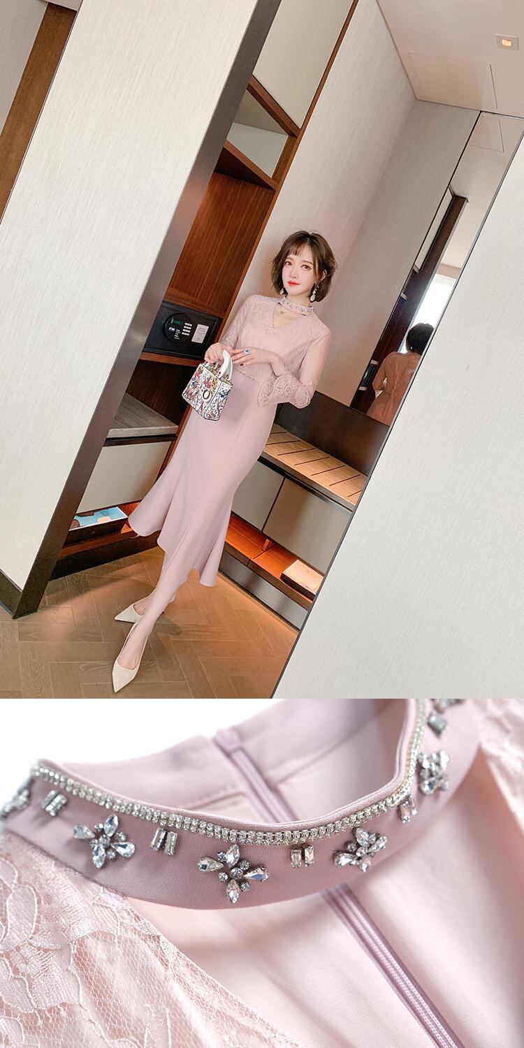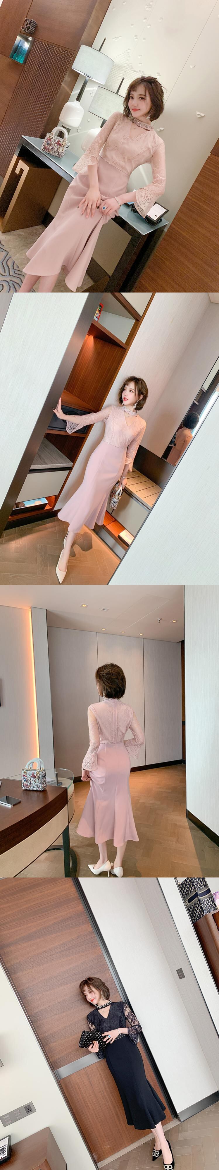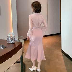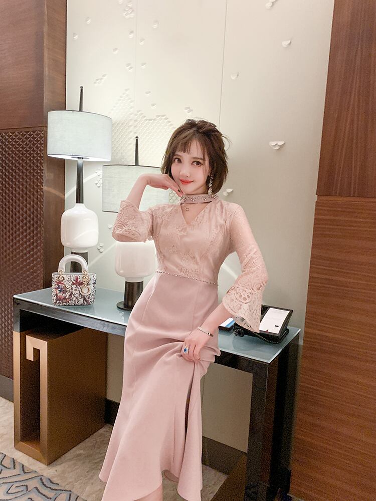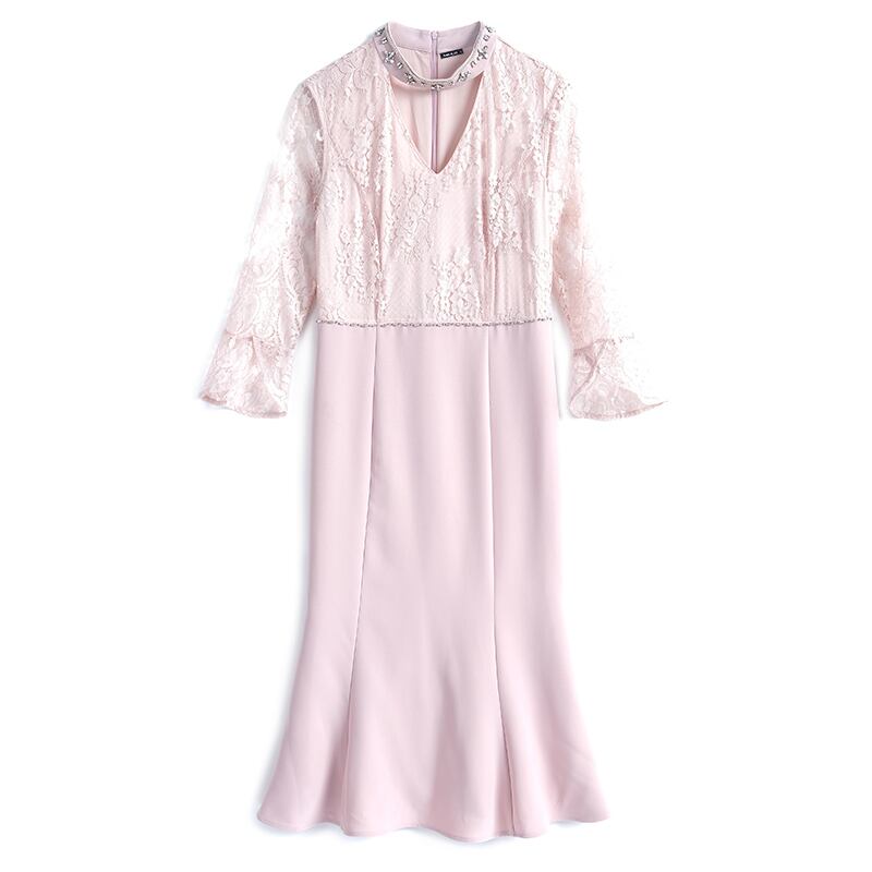 レーススリーブウェストスリムベルベットドレス スプリング 春物 ステッチ MIUCO33141587822