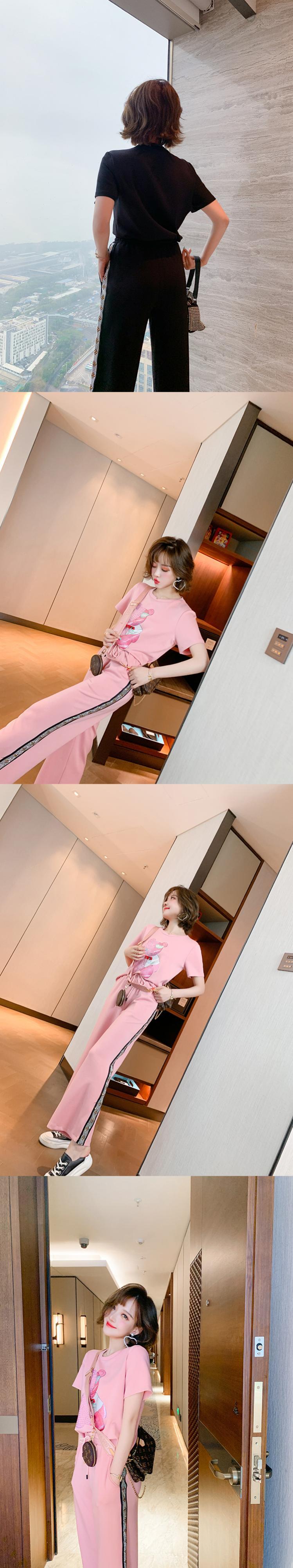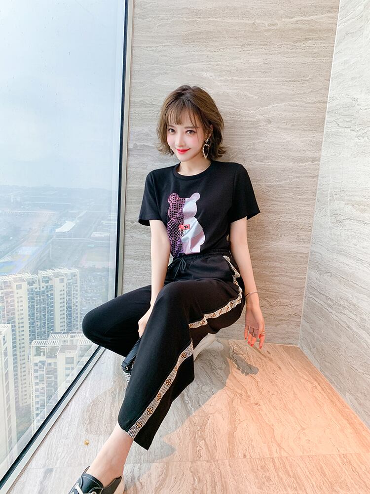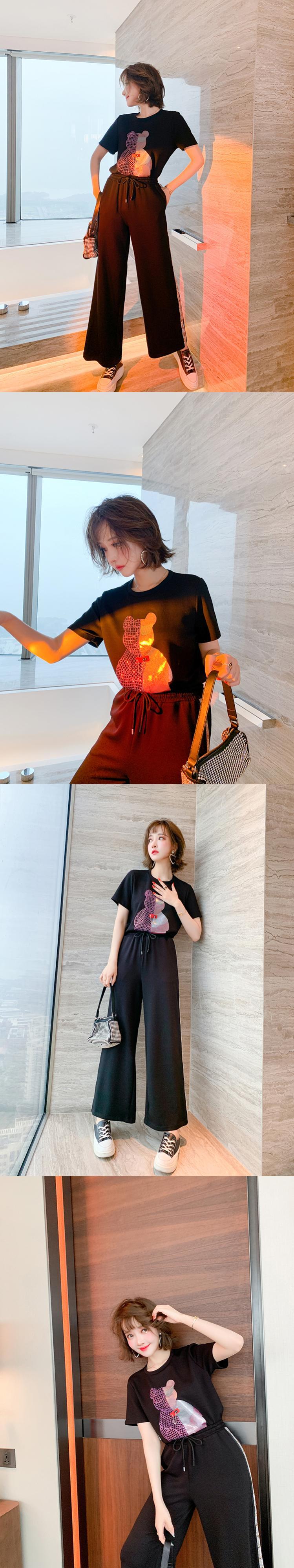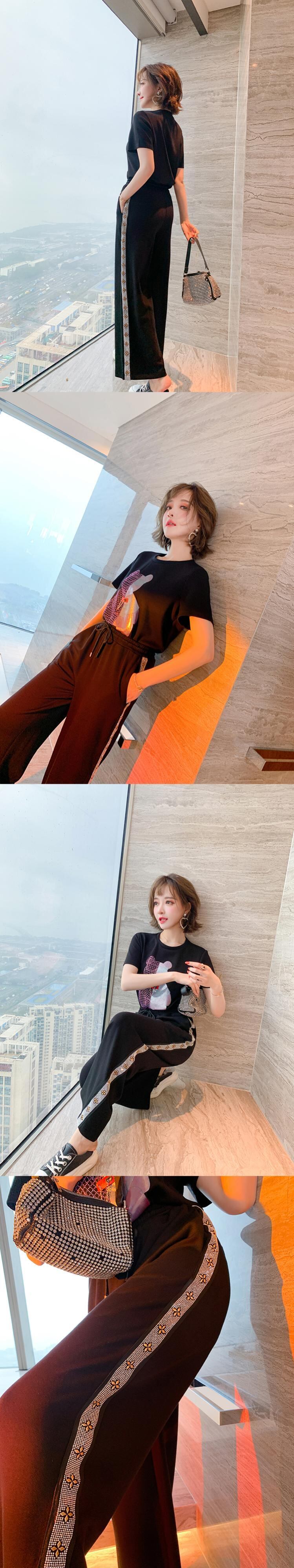 ラインストーンプリントルーズラウンドネックTシャツ カラーワイドレッグウェストパンツ セット スプリング 春物 Oネック ワイドパンツ MIUCO68498241245