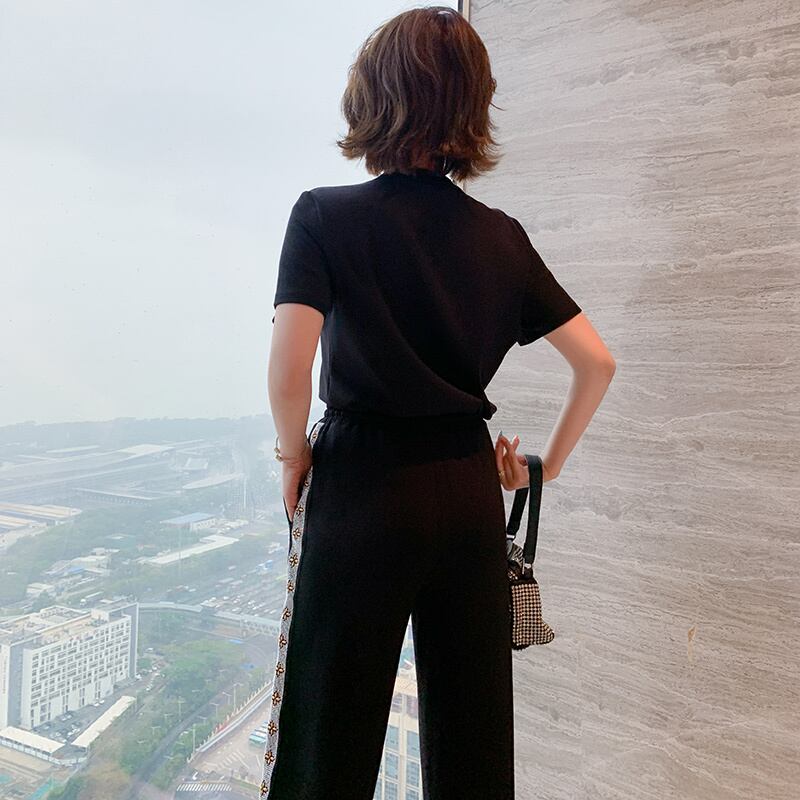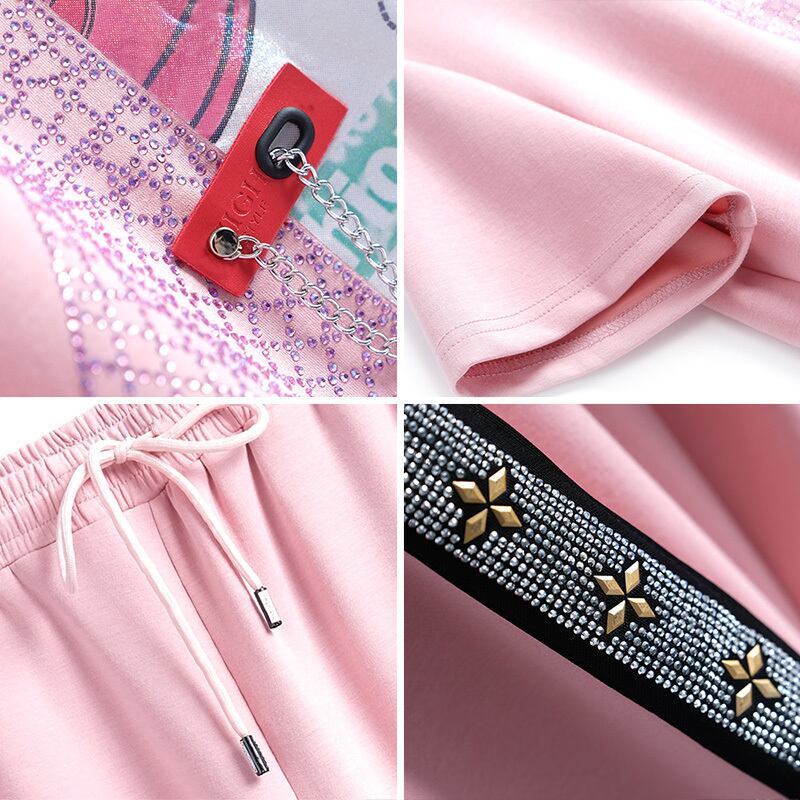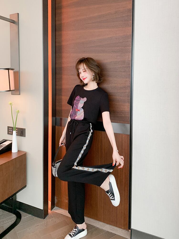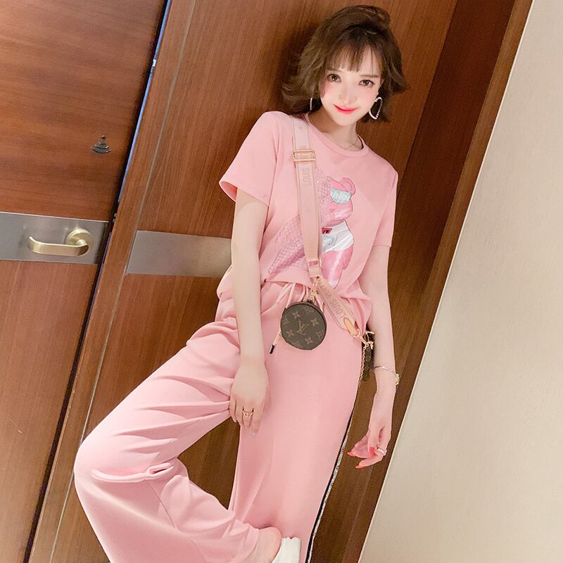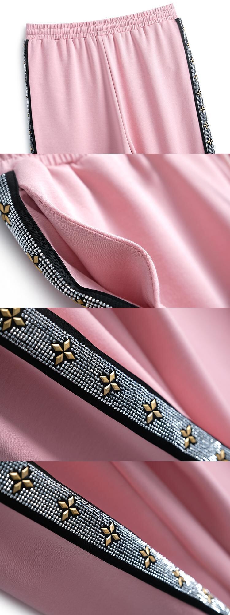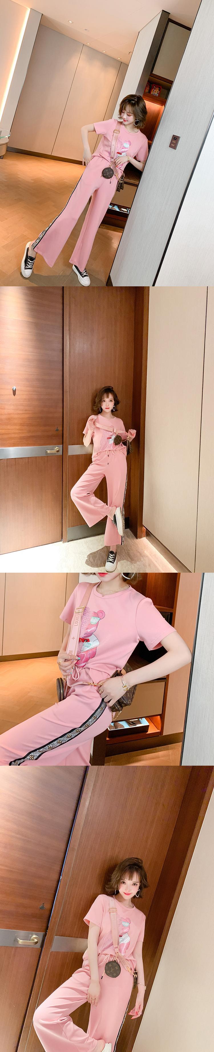 ラインストーンプリントルーズラウンドネックTシャツ カラーワイドレッグウェストパンツ セット スプリング 春物 Oネック ワイドパンツ MIUCO68498241245