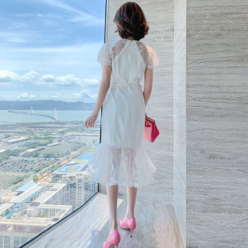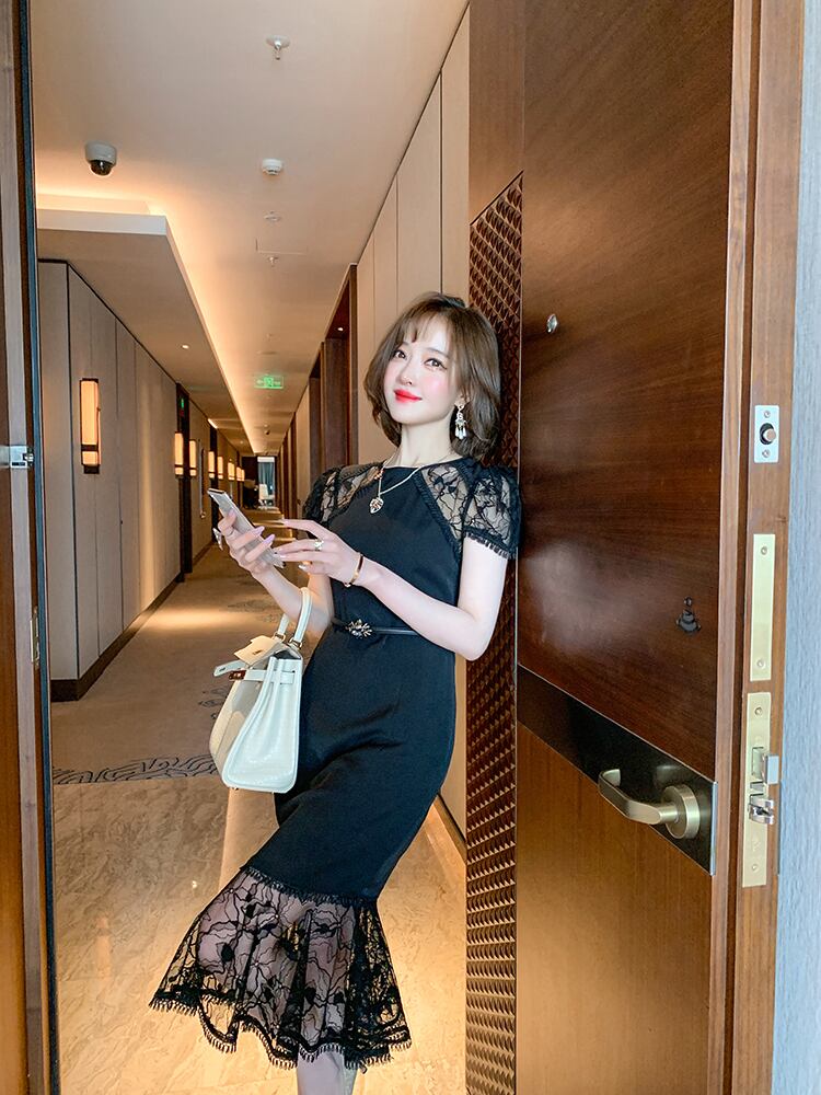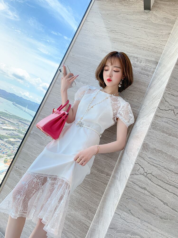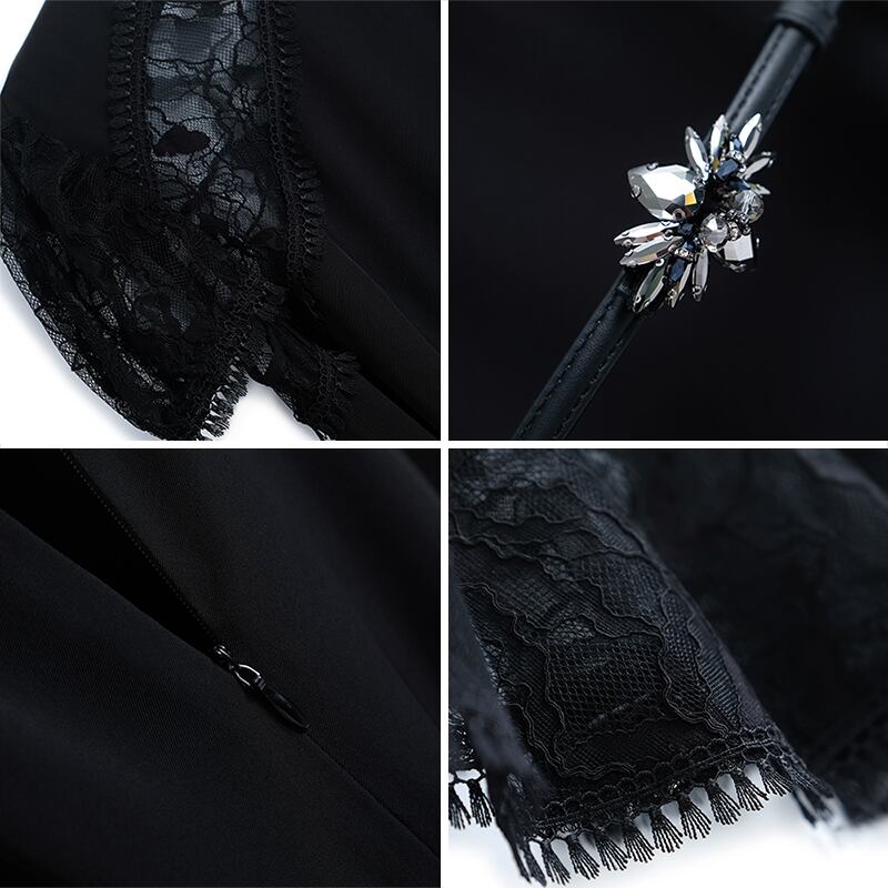 ラウンドネックレースバックルベルト ウェストドレス オータム レッド 刺繍 秋物 ハーネス Oネック ステッチ MIUCO22280710932