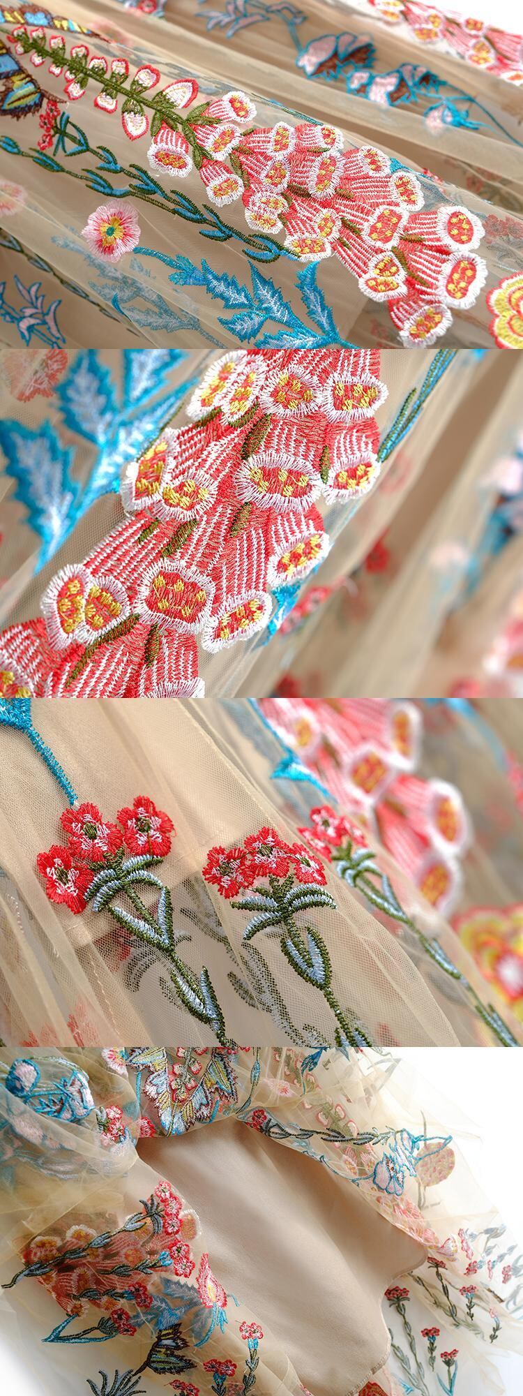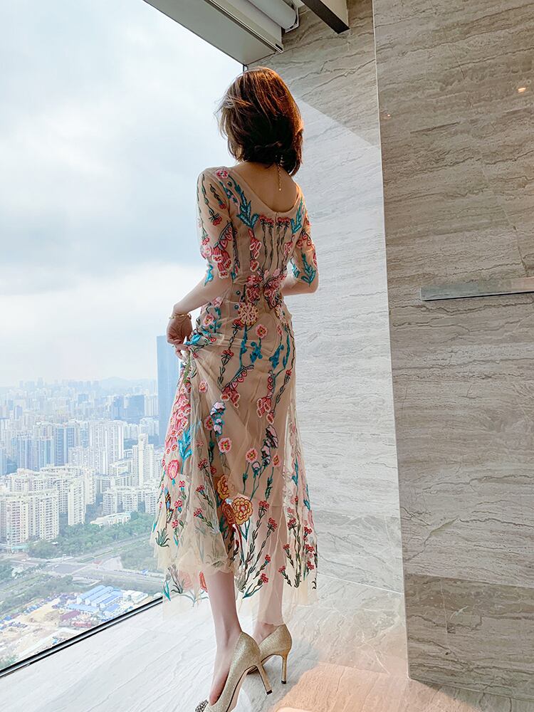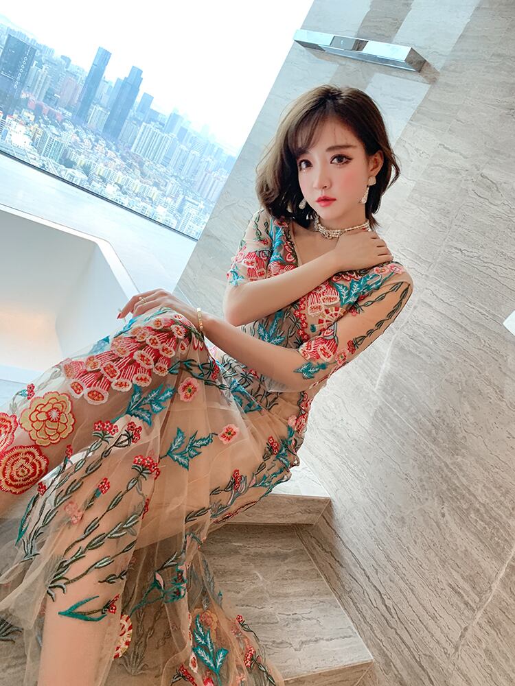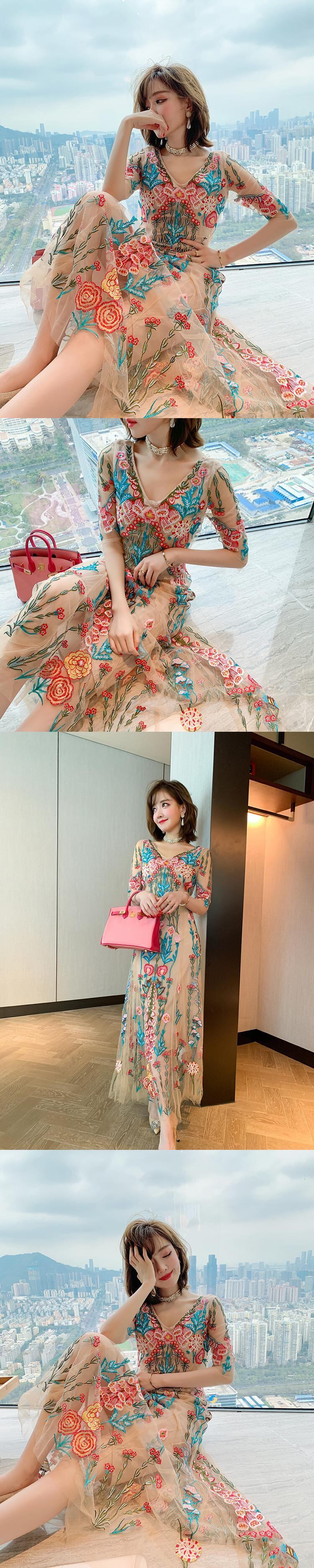 スカート Flowerデザイン Vネック七部袖スリーブウェストロングドレス レッド 刺繍 フラワーデザイン MIUCO46889781349