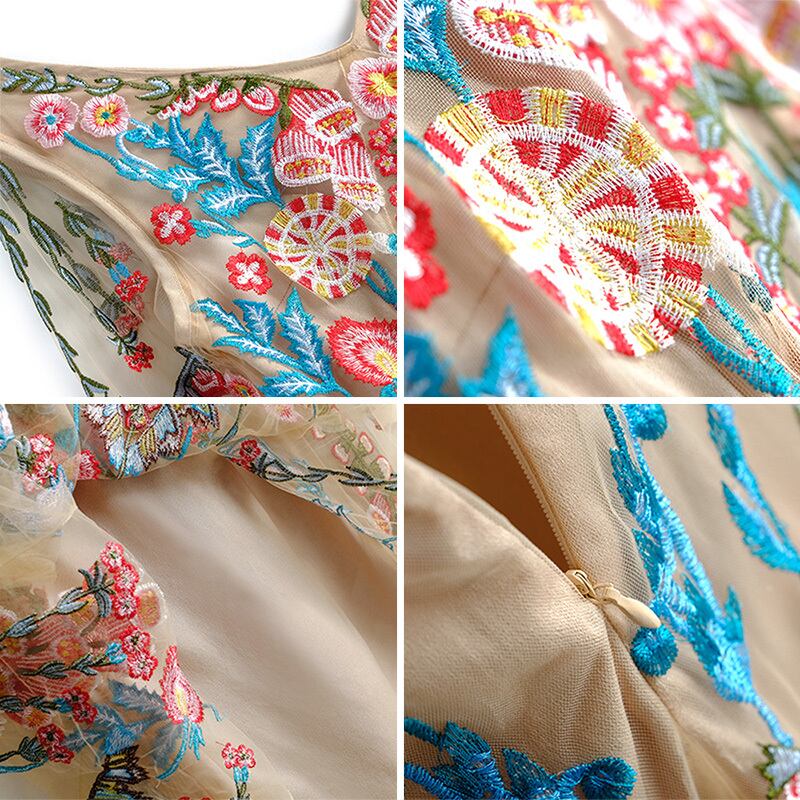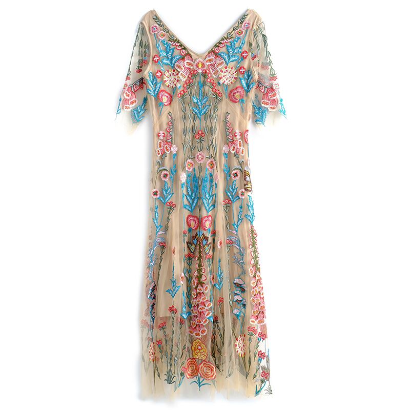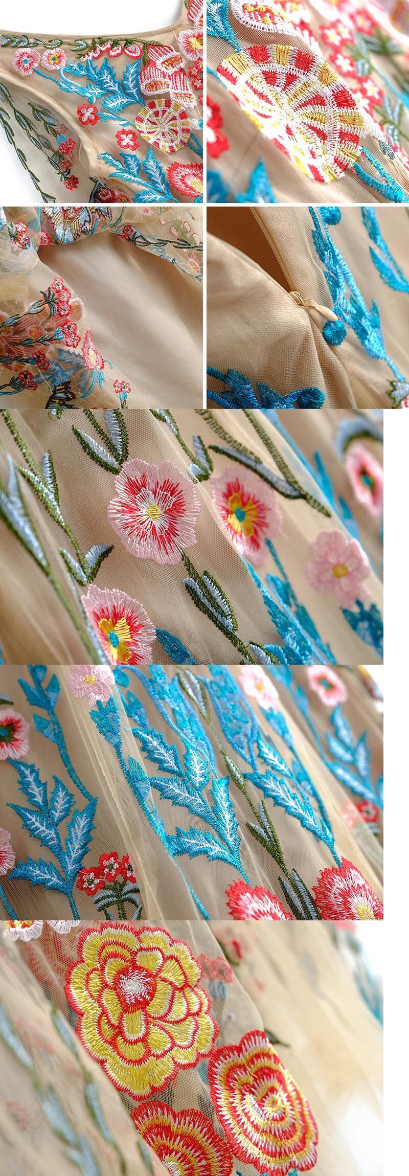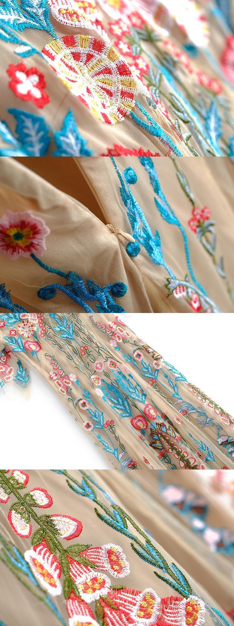 スカート Flowerデザイン Vネック七部袖スリーブウェストロングドレス レッド 刺繍 フラワーデザイン MIUCO46889781349