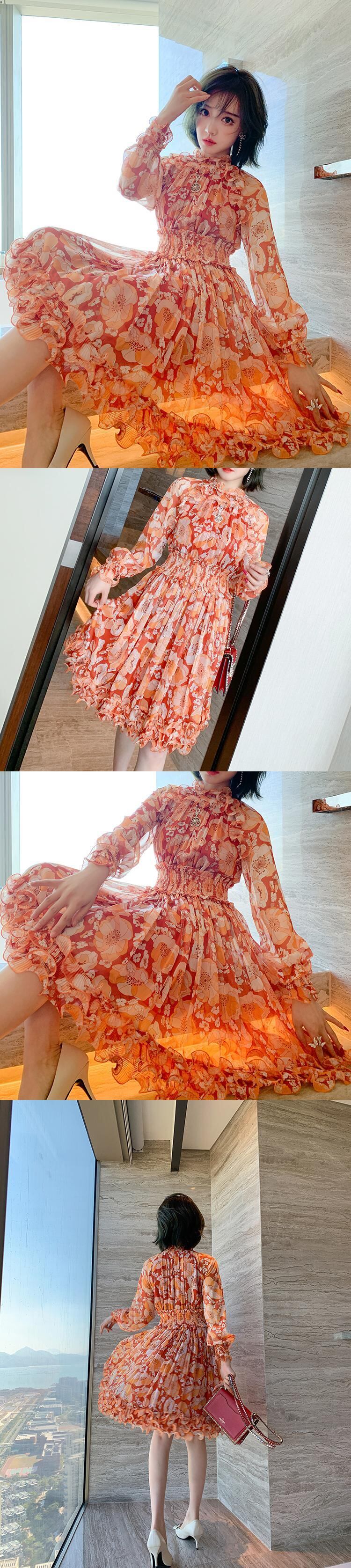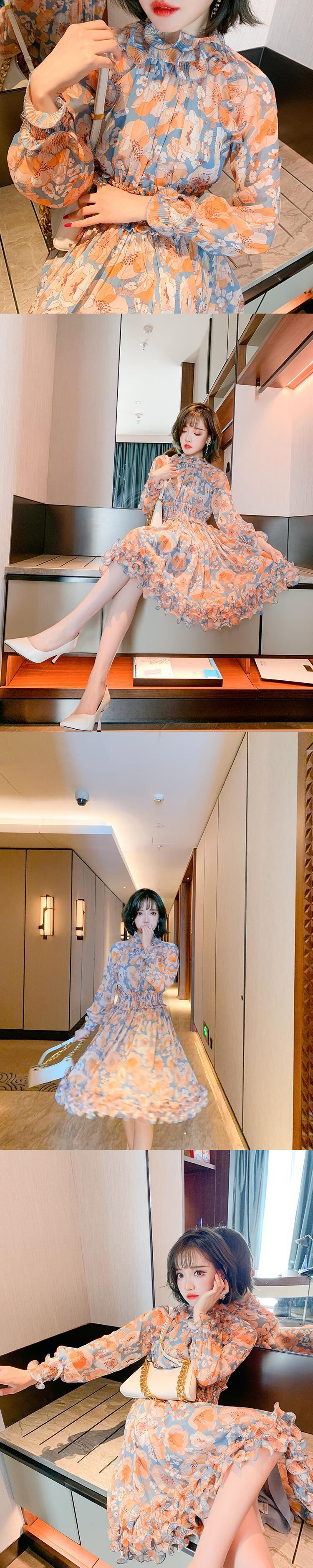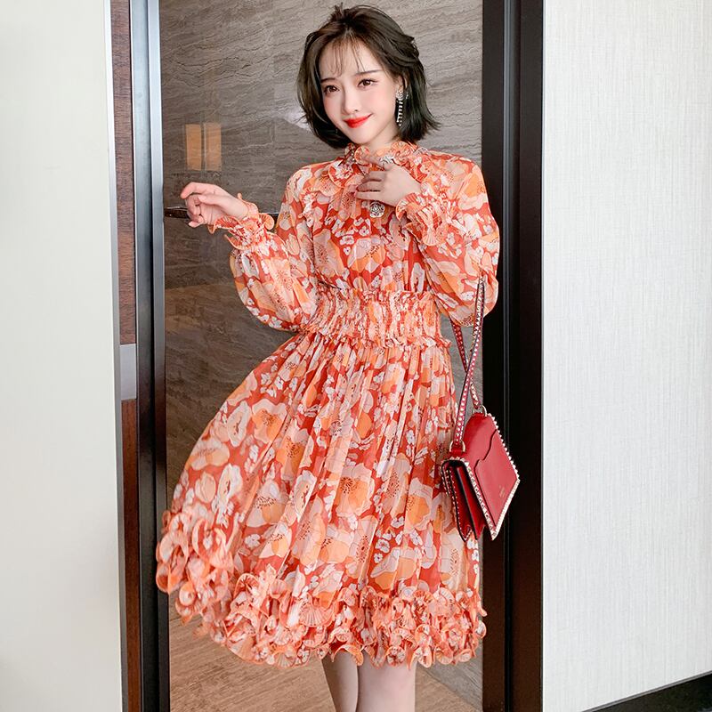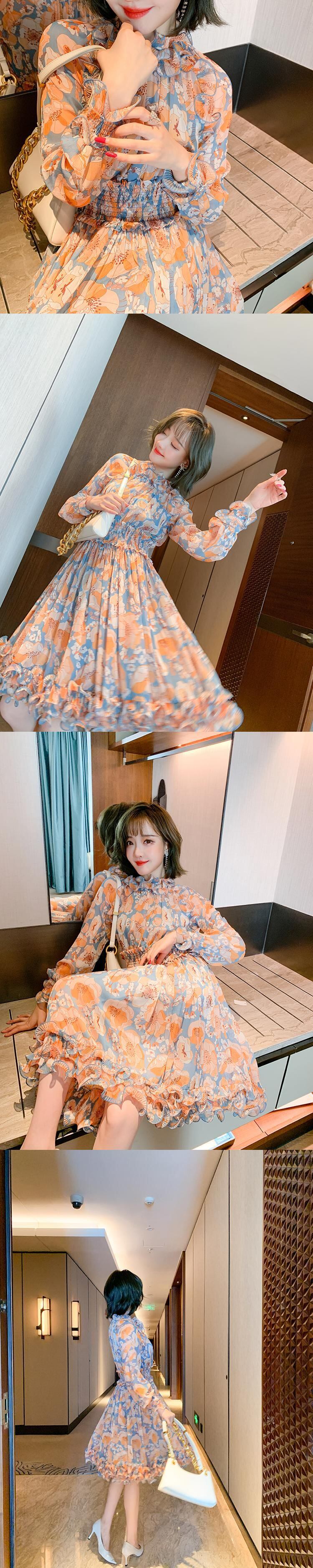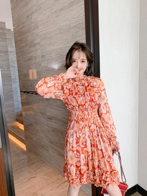 レースプリントストレッチハイウェストウェストスリムドレス スプリング エラスティック 伸縮 春物 ステッチ MIUCO18112604458