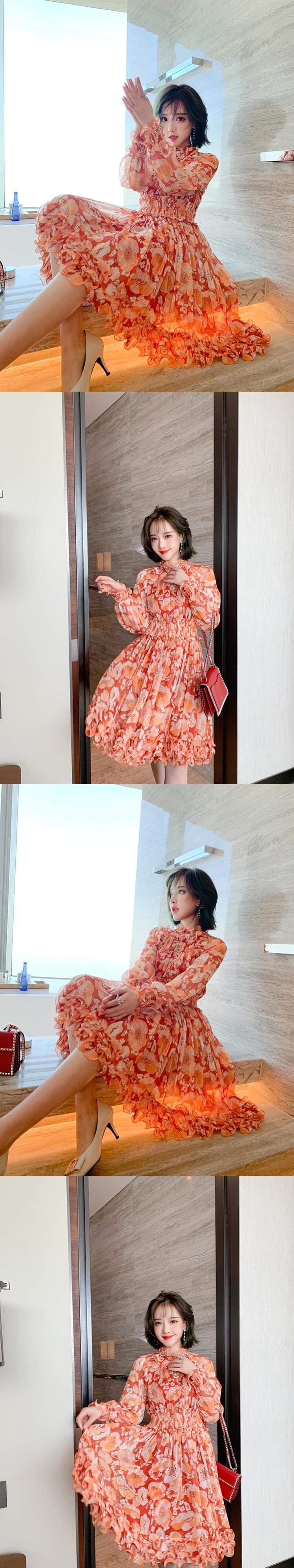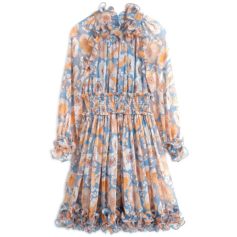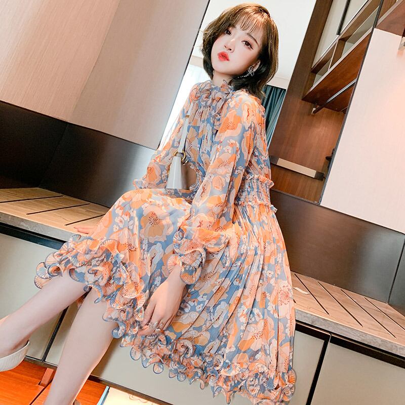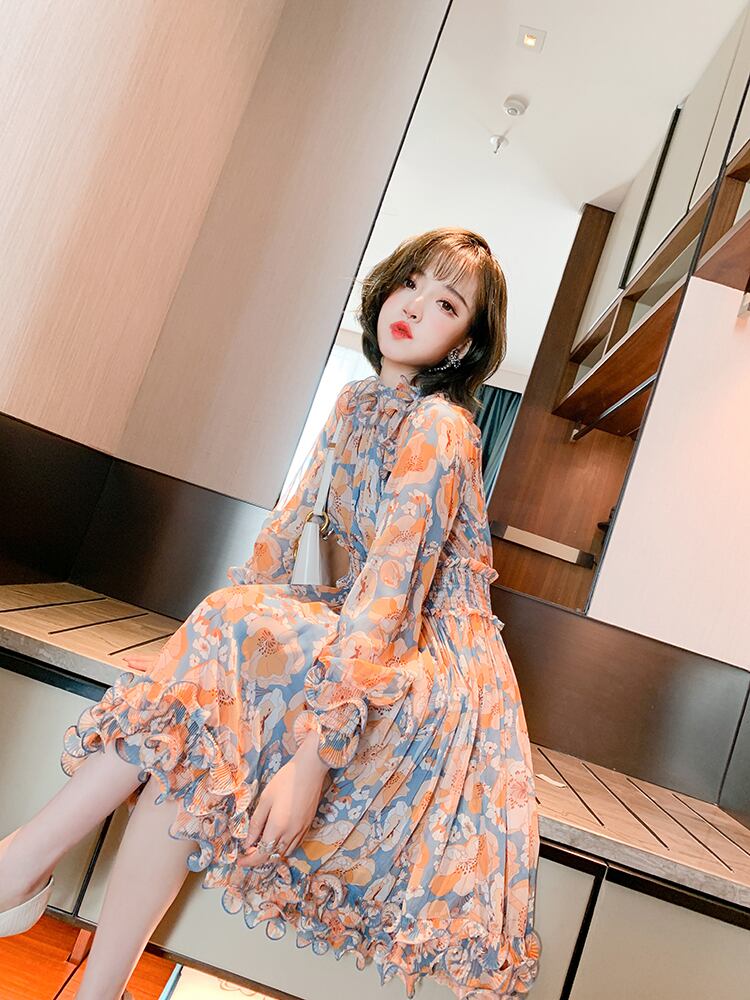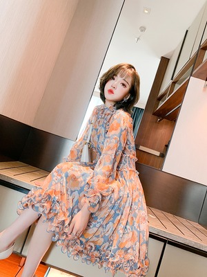 レースプリントストレッチハイウェストウェストスリムドレス スプリング エラスティック 伸縮 春物 ステッチ MIUCO18112604458
