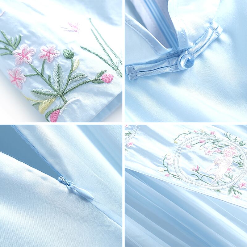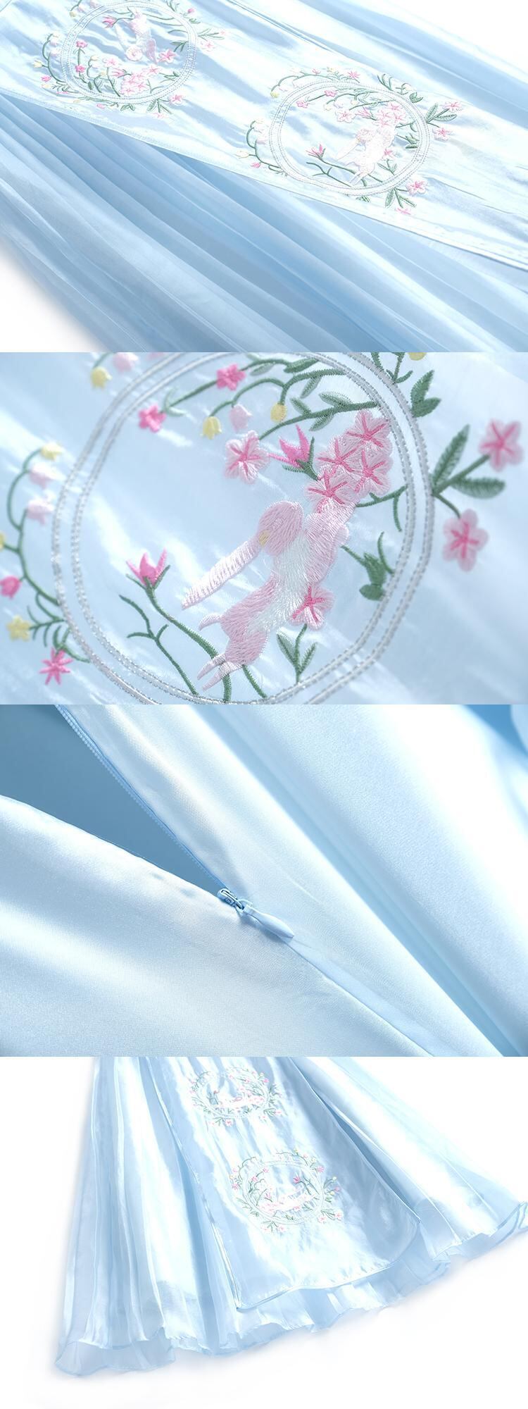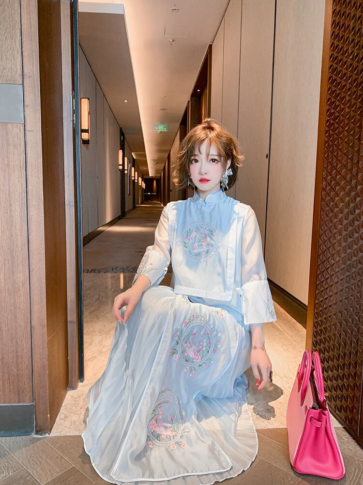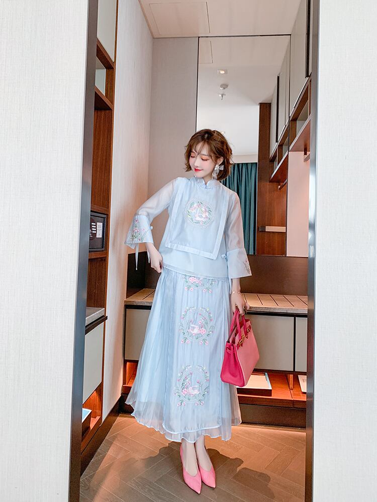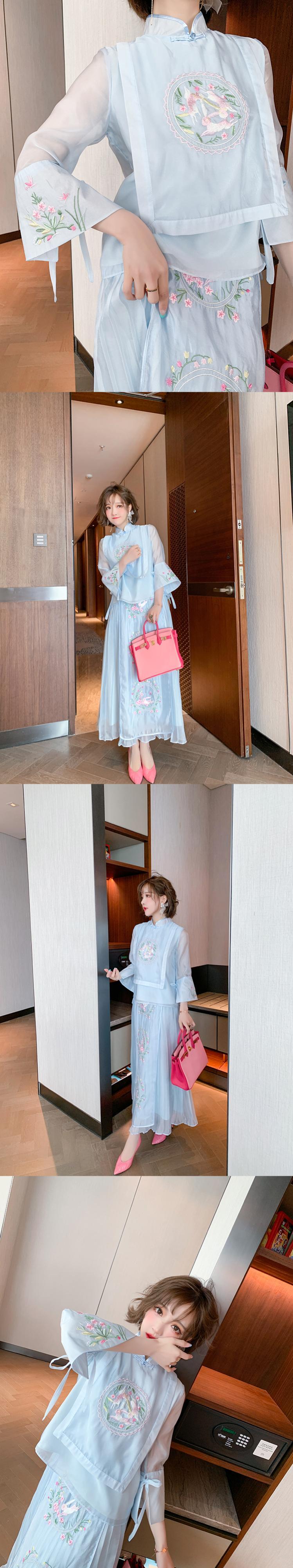 カラー刺繍スリーブトップス プリーツハイウェストウェストスカート スプリング レッド 春物 MIUCO24554027383
