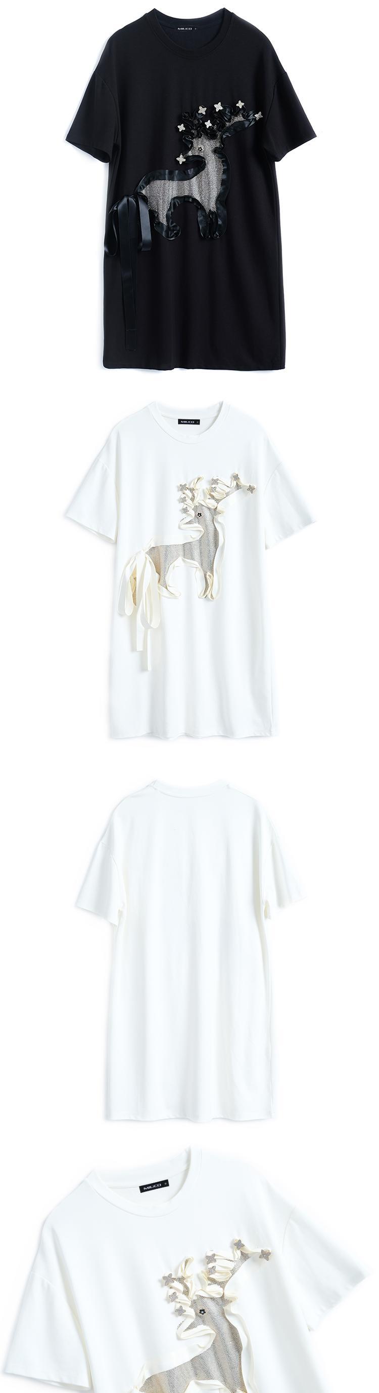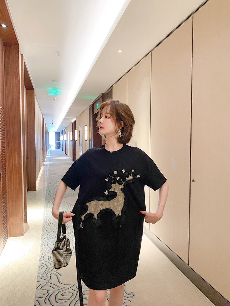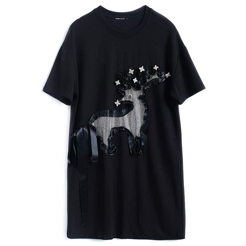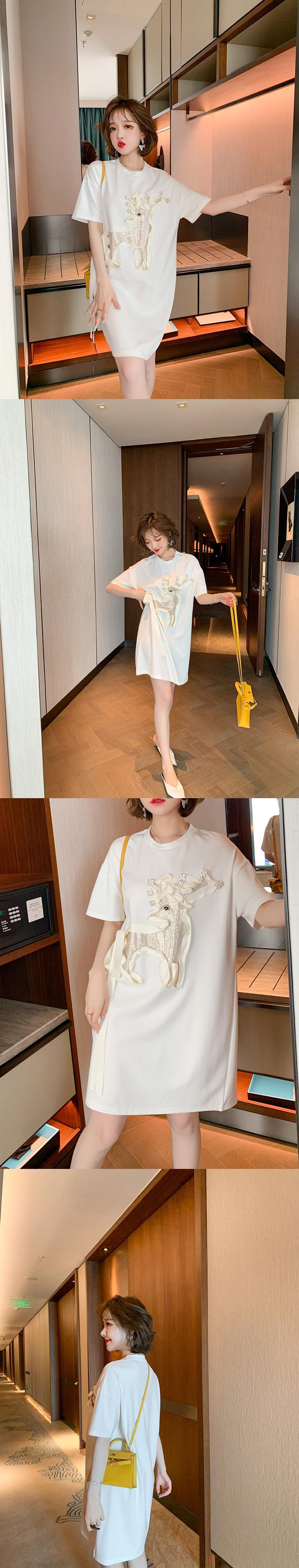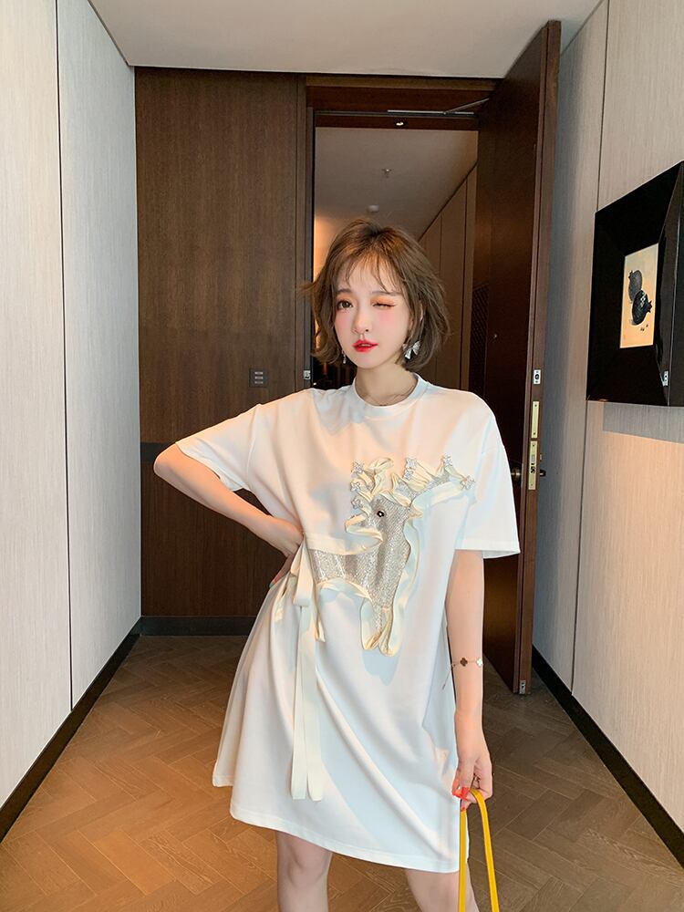 ラウンドネックラインストーンルーズTシャツ ドレス スプリング 春物 Oネック MIUCO80283122705