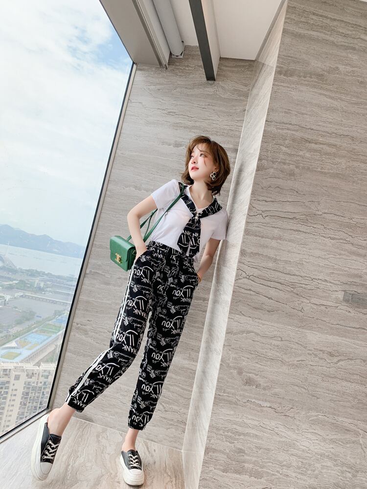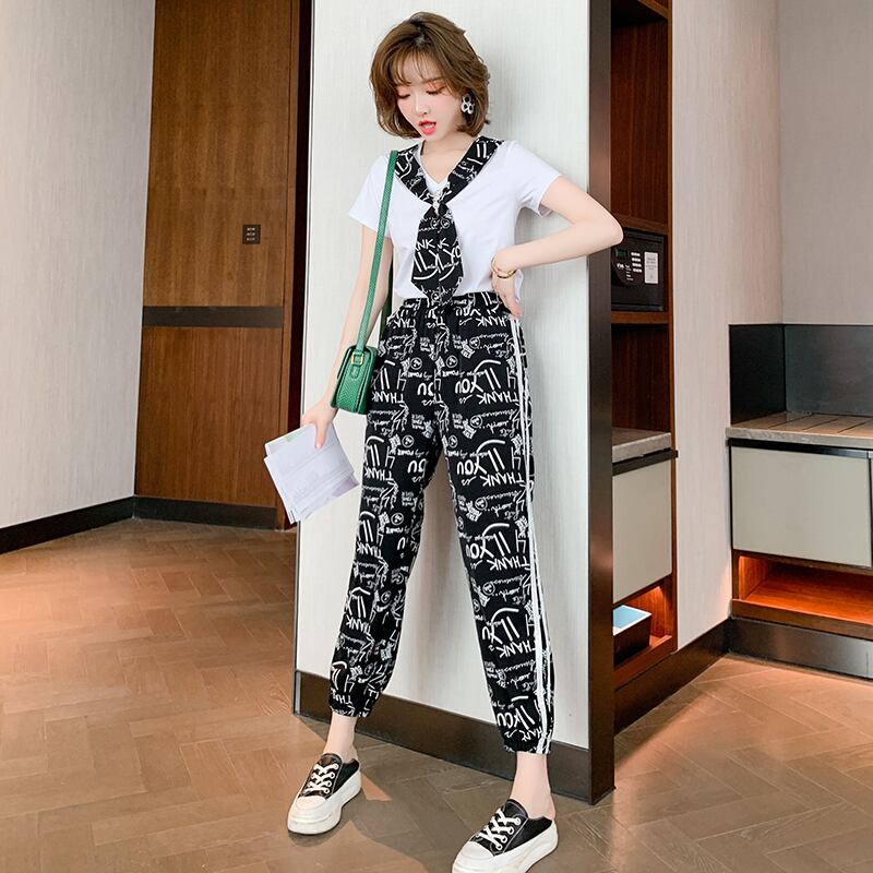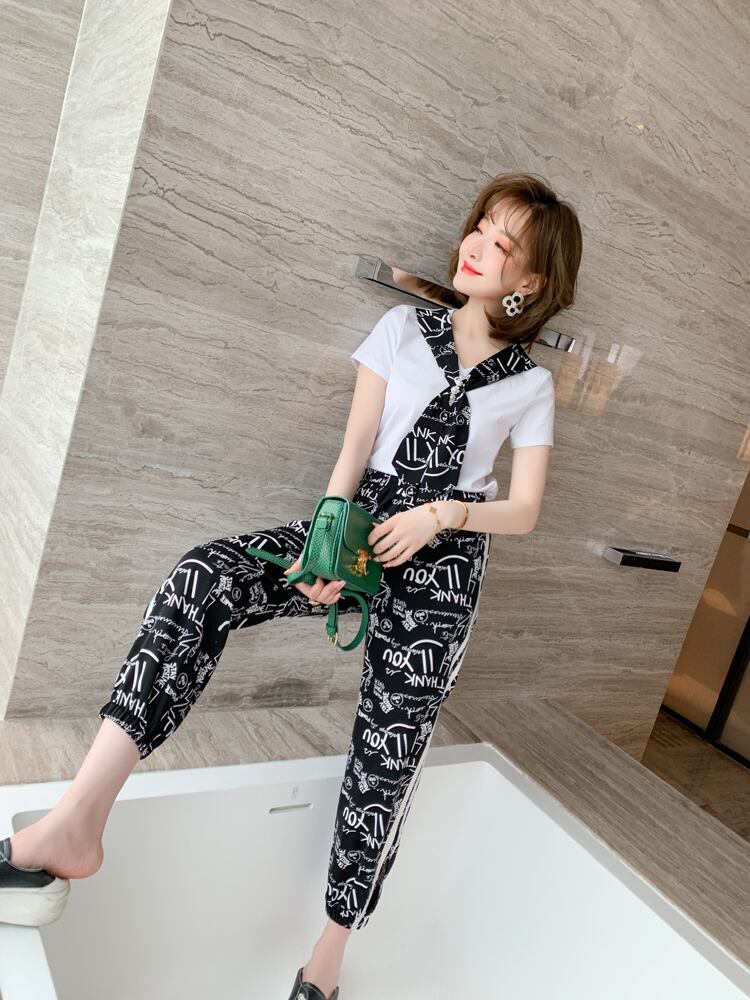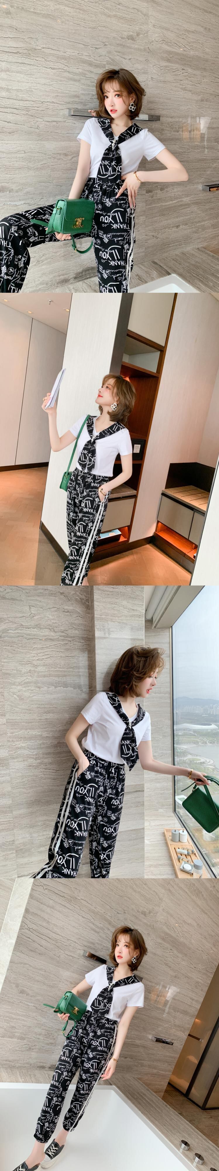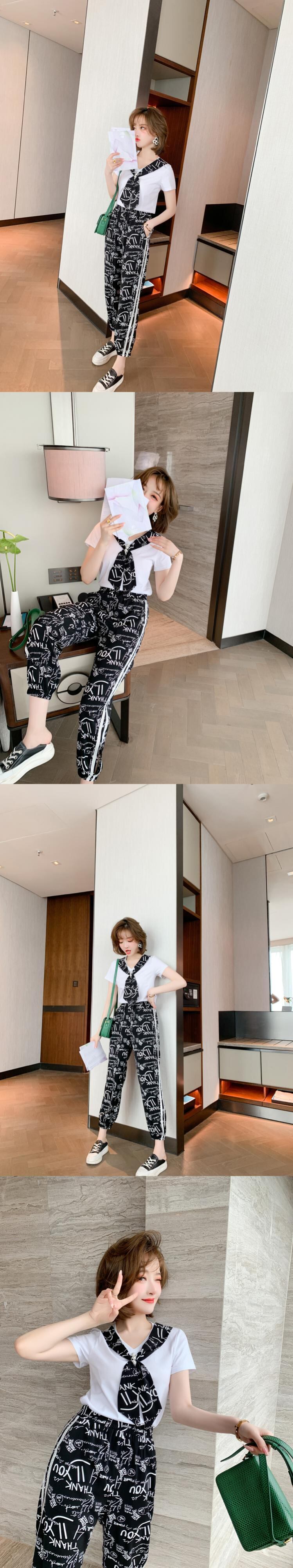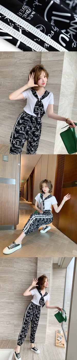 プリント柄Vネック半袖スリーブTシャツ ウェストレギンス パンツ セット ショート ハーフスリーブ MIUCO1150224494