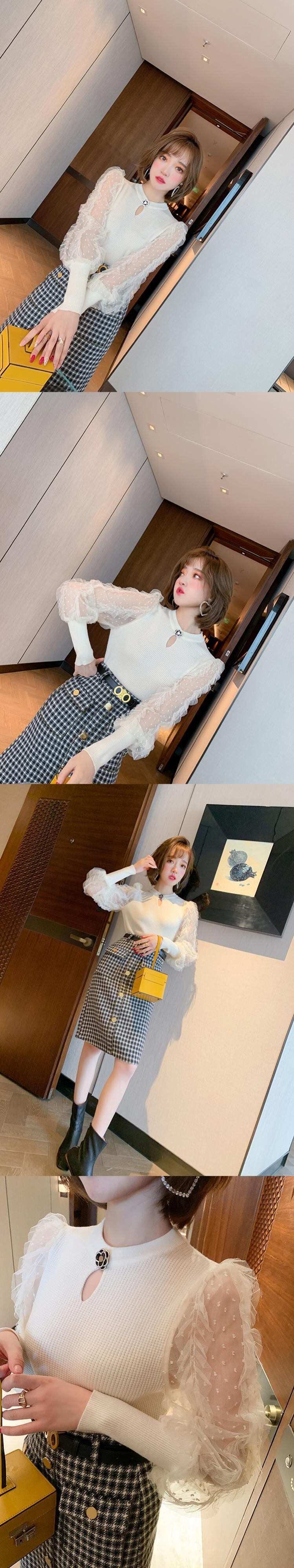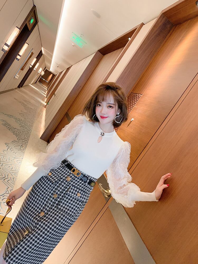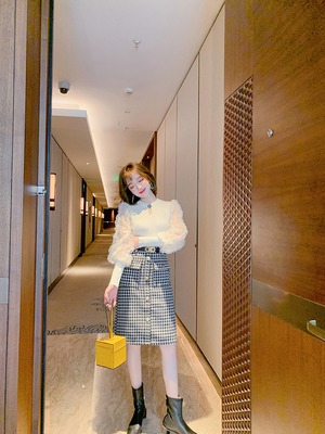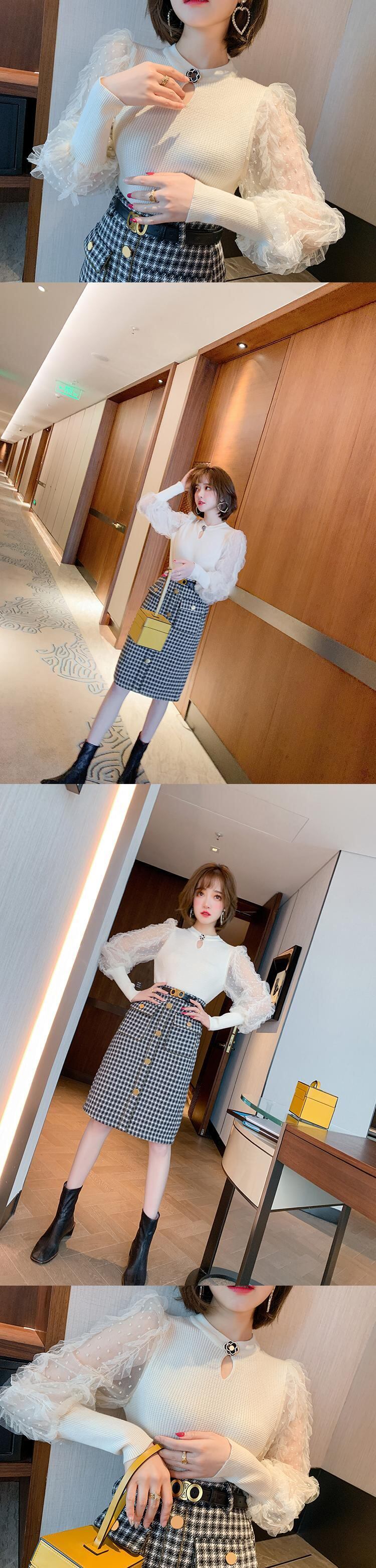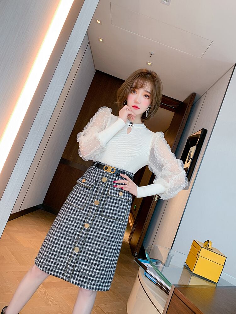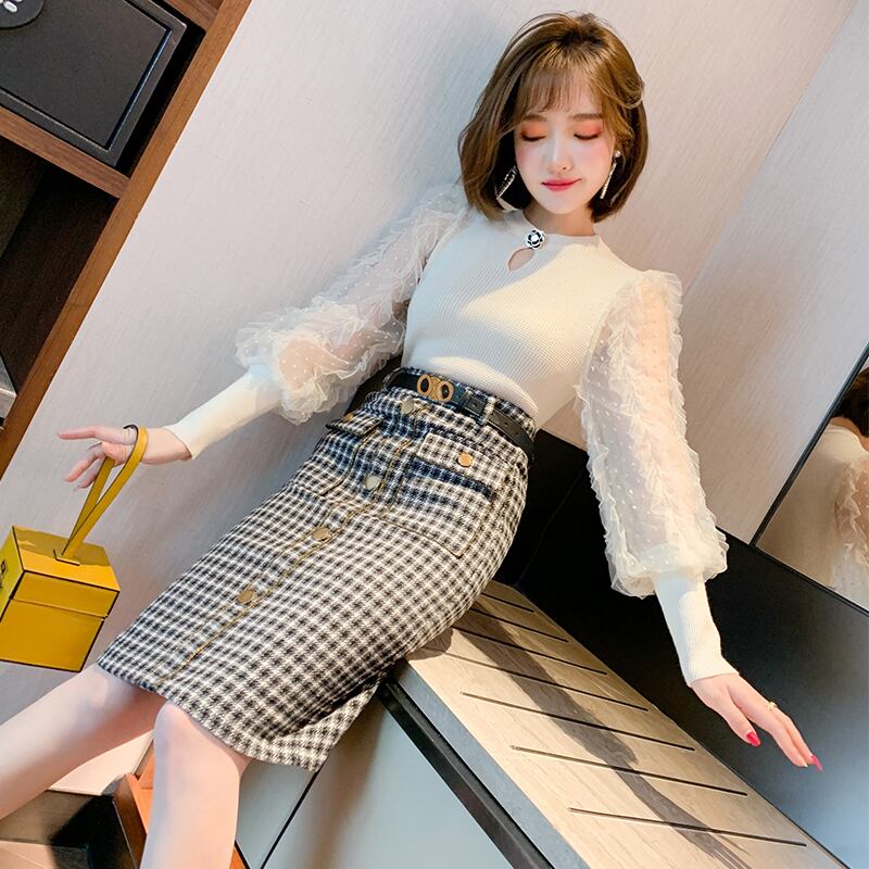 カラーFlowerデザイン スリーブニットトップス 格子柄スカート オータムウィンター 秋物 冬物 フラワーデザイン ステッチ MIUCO98317561257
