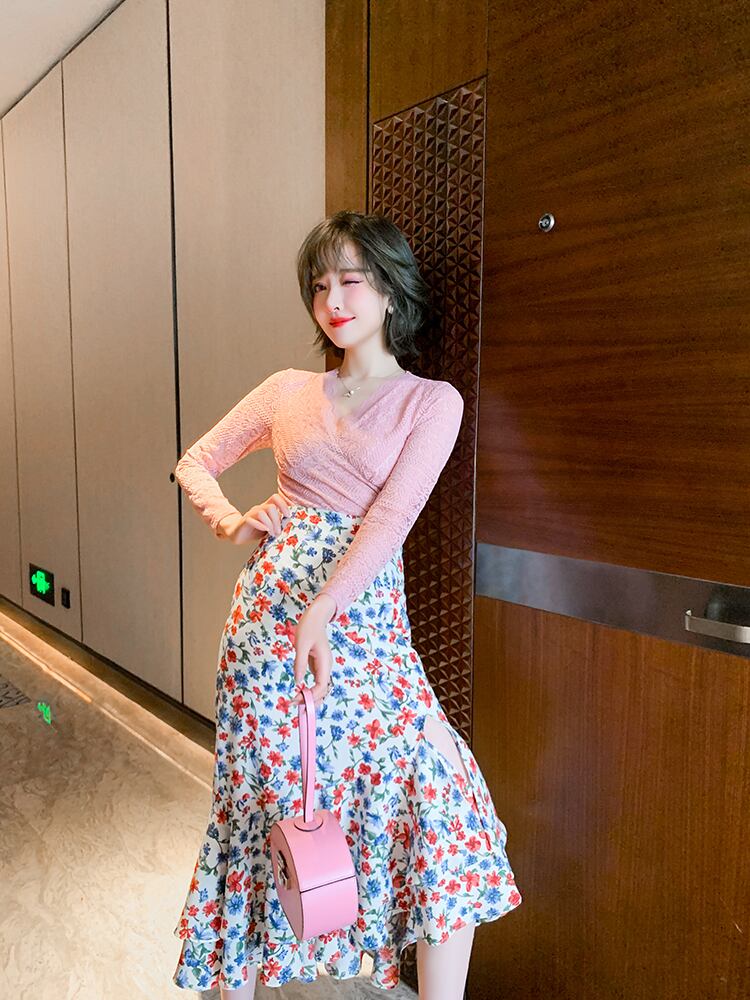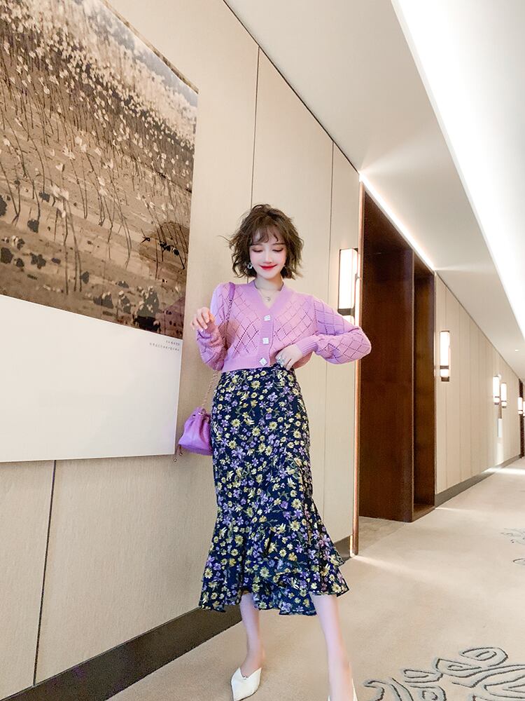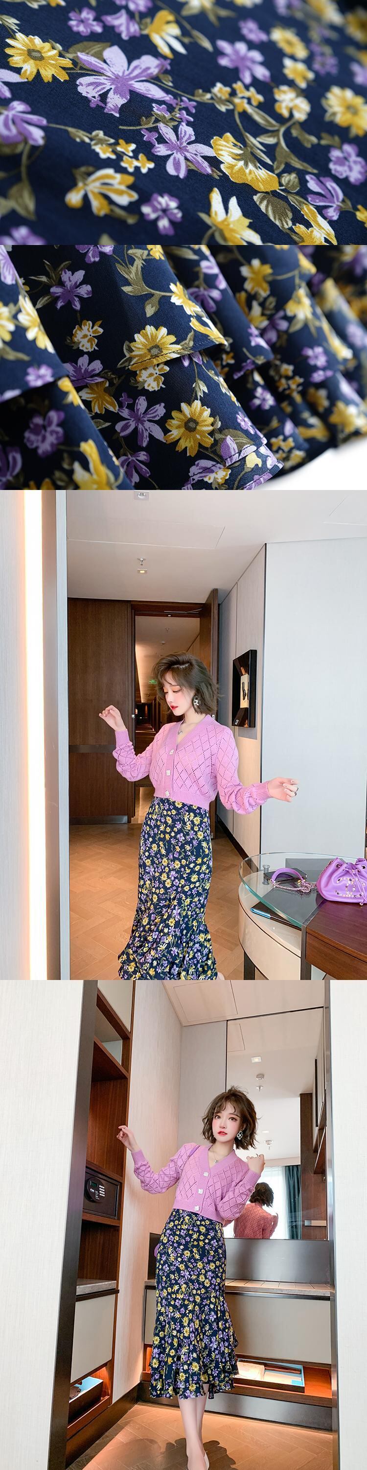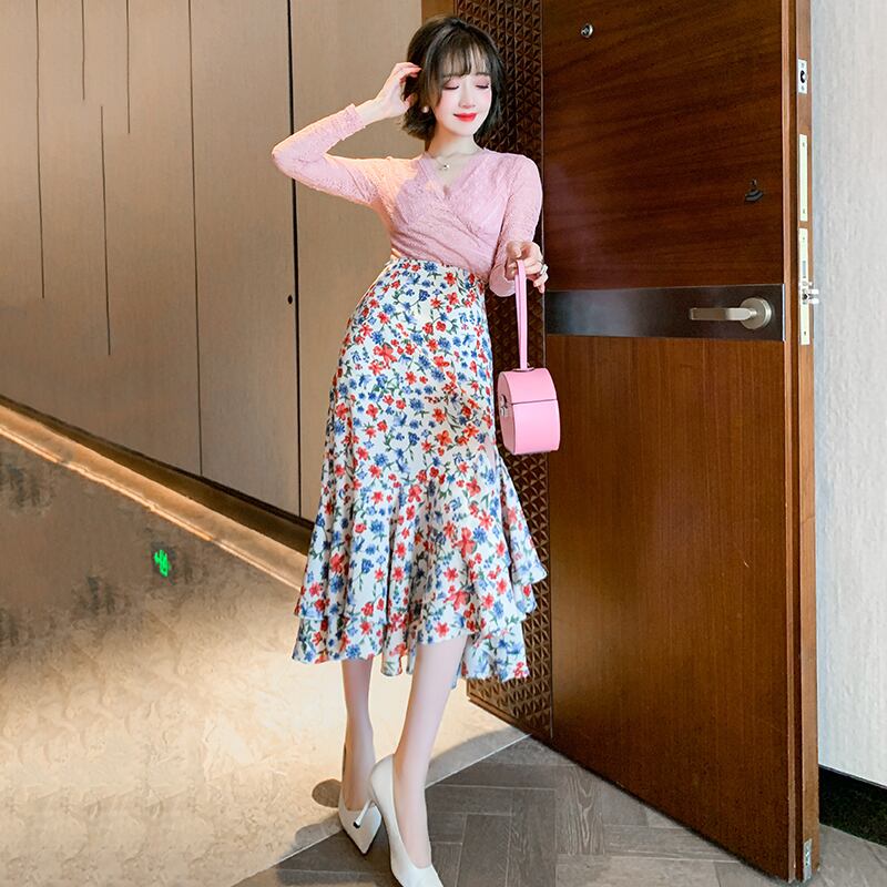 スタンダードフローラルハイウェストウェストスリムダブルスカート オータム レトロ 秋物 花柄 MIUCO59444095652