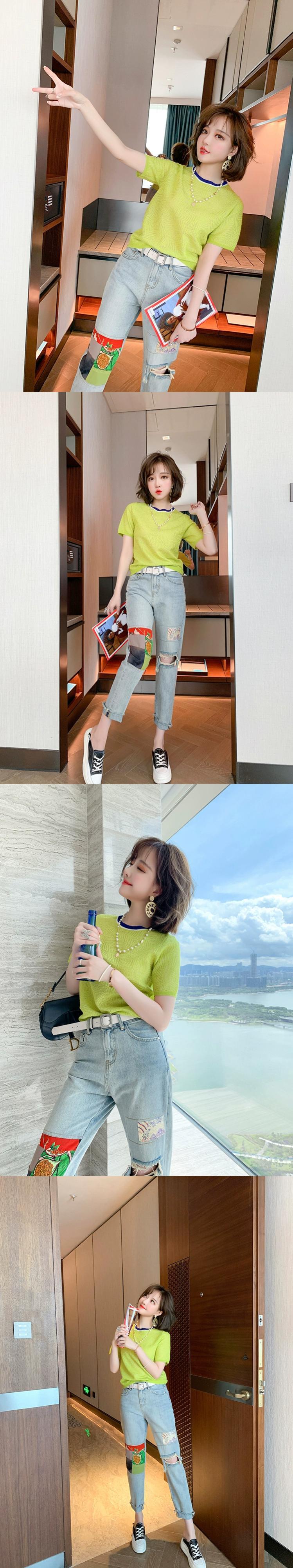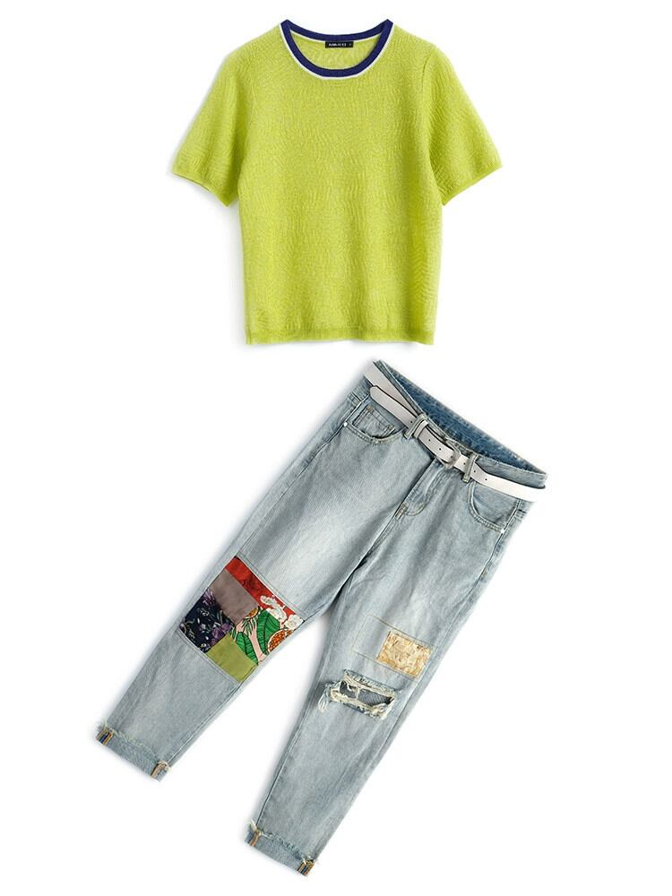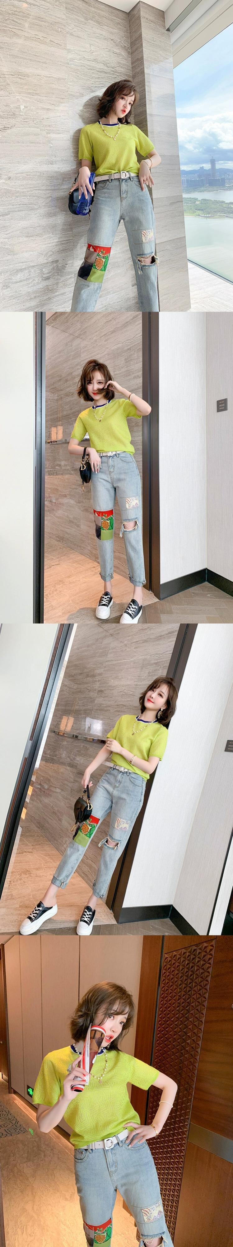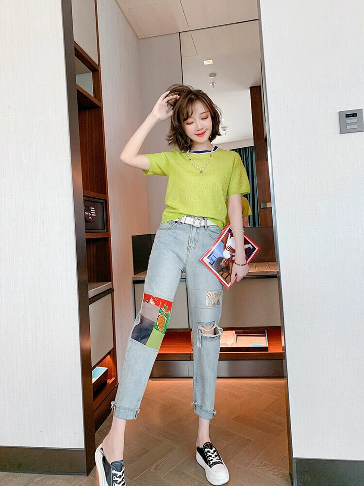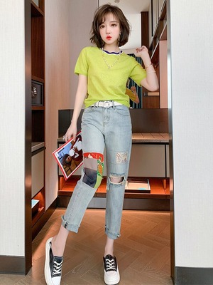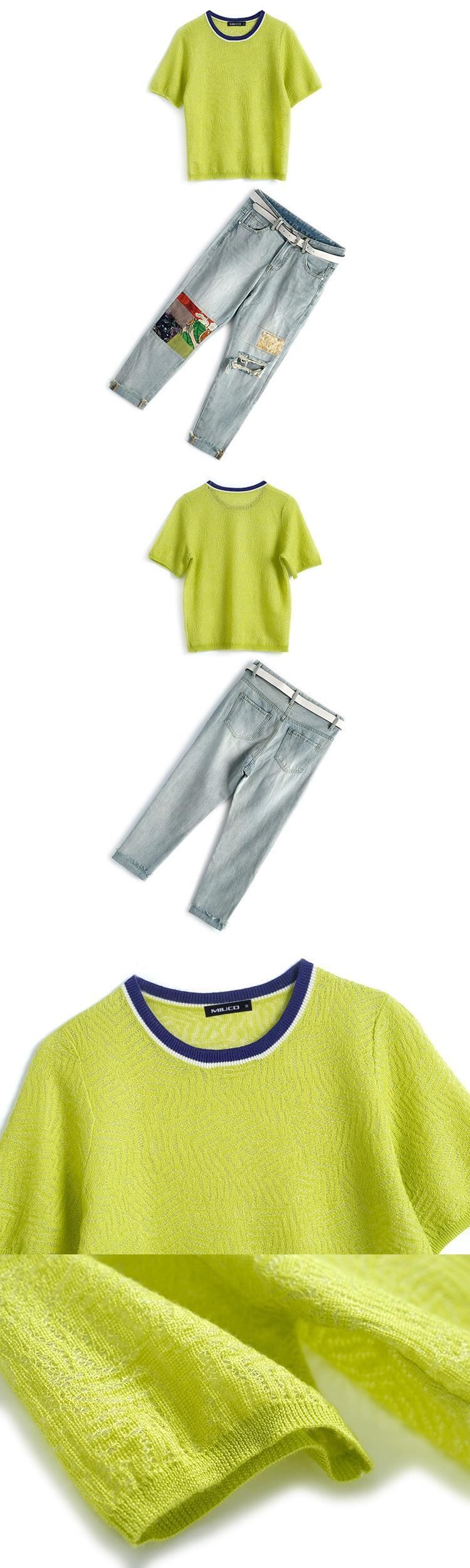 MIUCO 対照的なスレッドラウンドネックニットトップ + 破れた穴痩身ジーンズ年齢軽減スーツ 2023 夏の新スタイル サマー 夏物 Oネック MIUCO12618715232