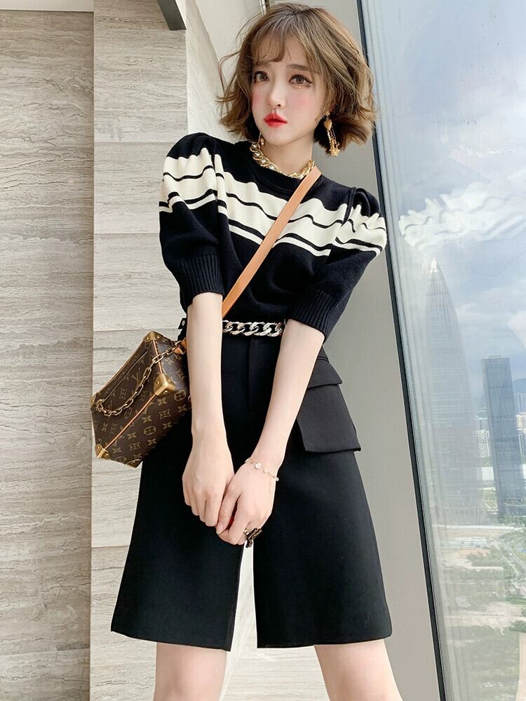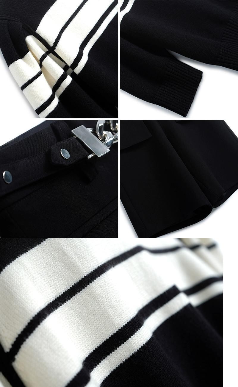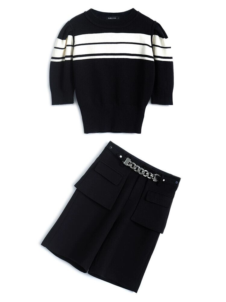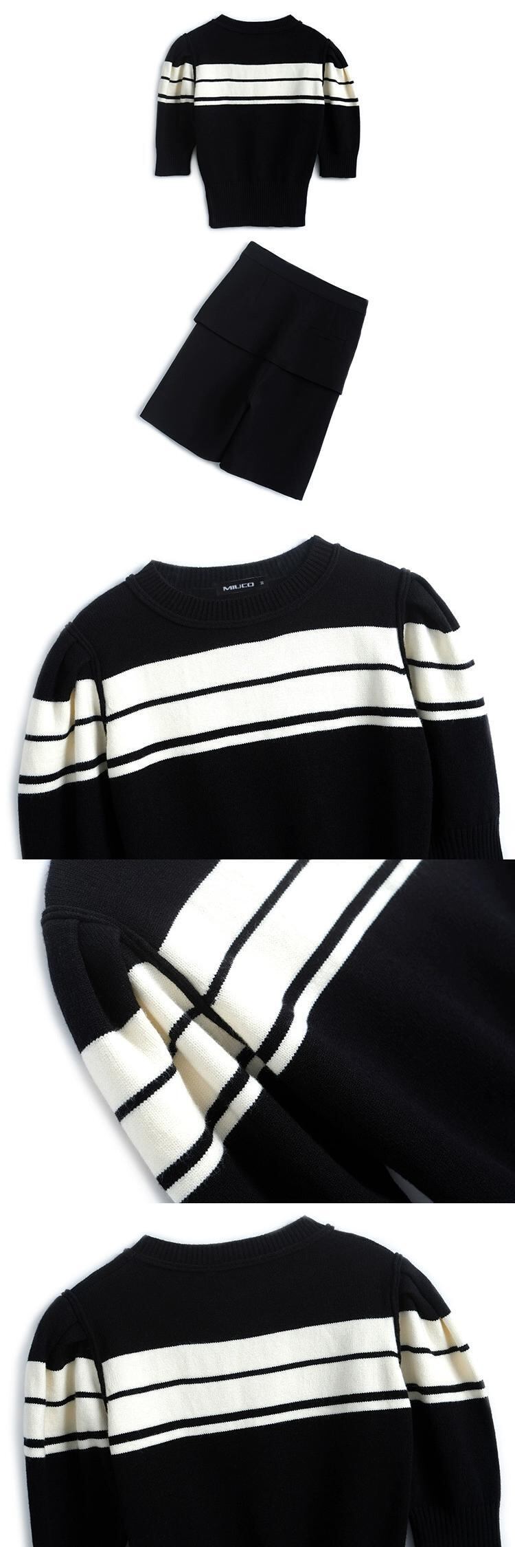 MIUCO コントラストカラーストライプラウンドネックセーター + パーソナライズされたスプライシングスカートワイドレッグミディアムパンツスーツ女性の 2023 秋 オータム 秋物 Oネック MIUCO10541749963